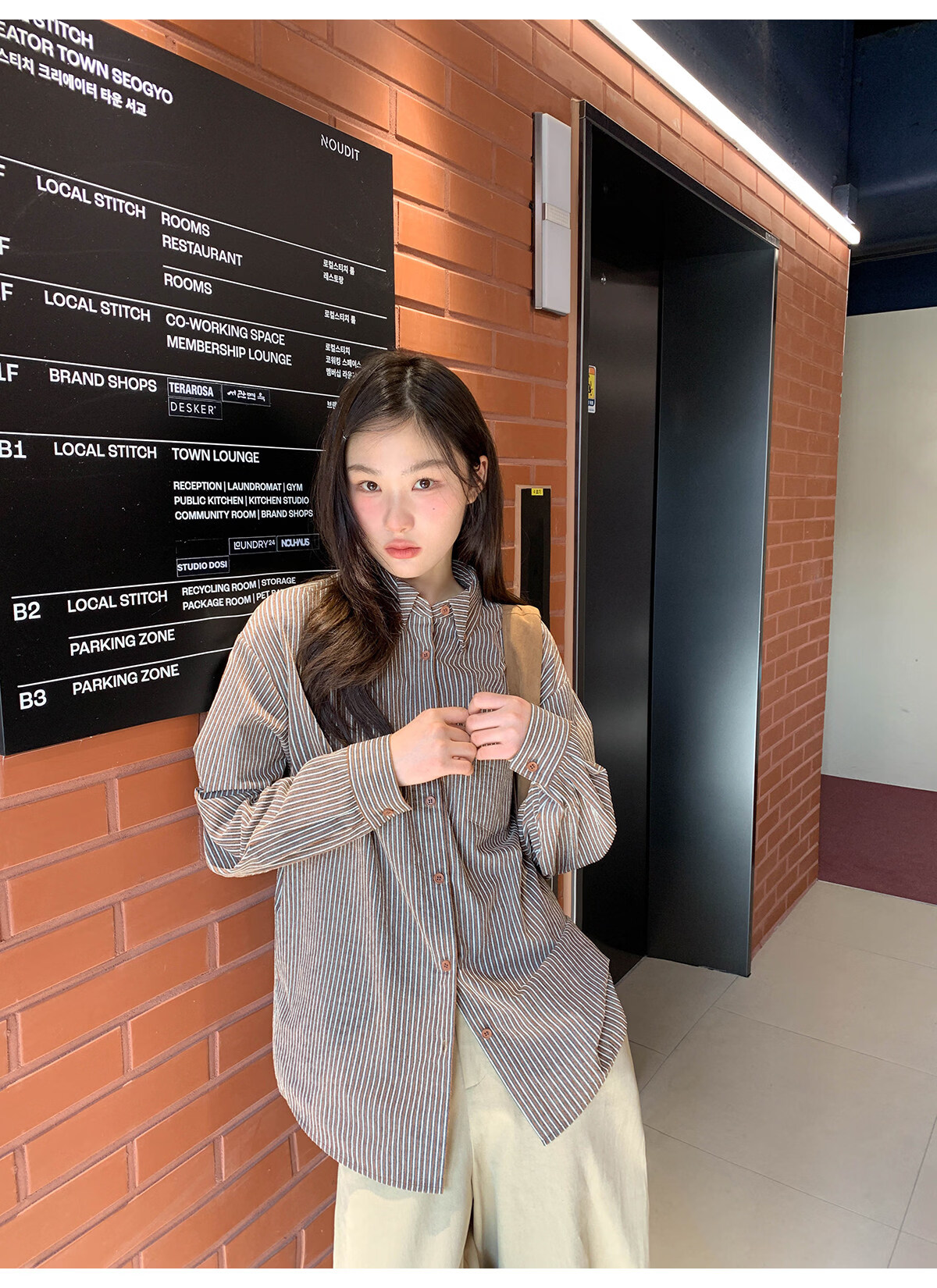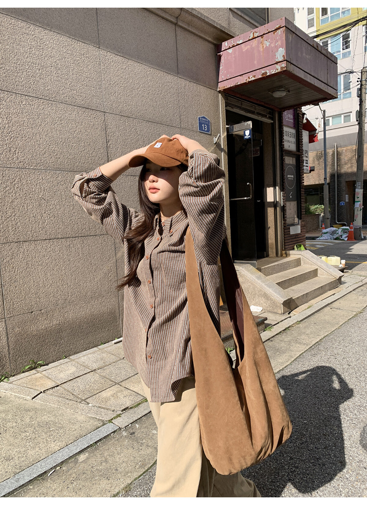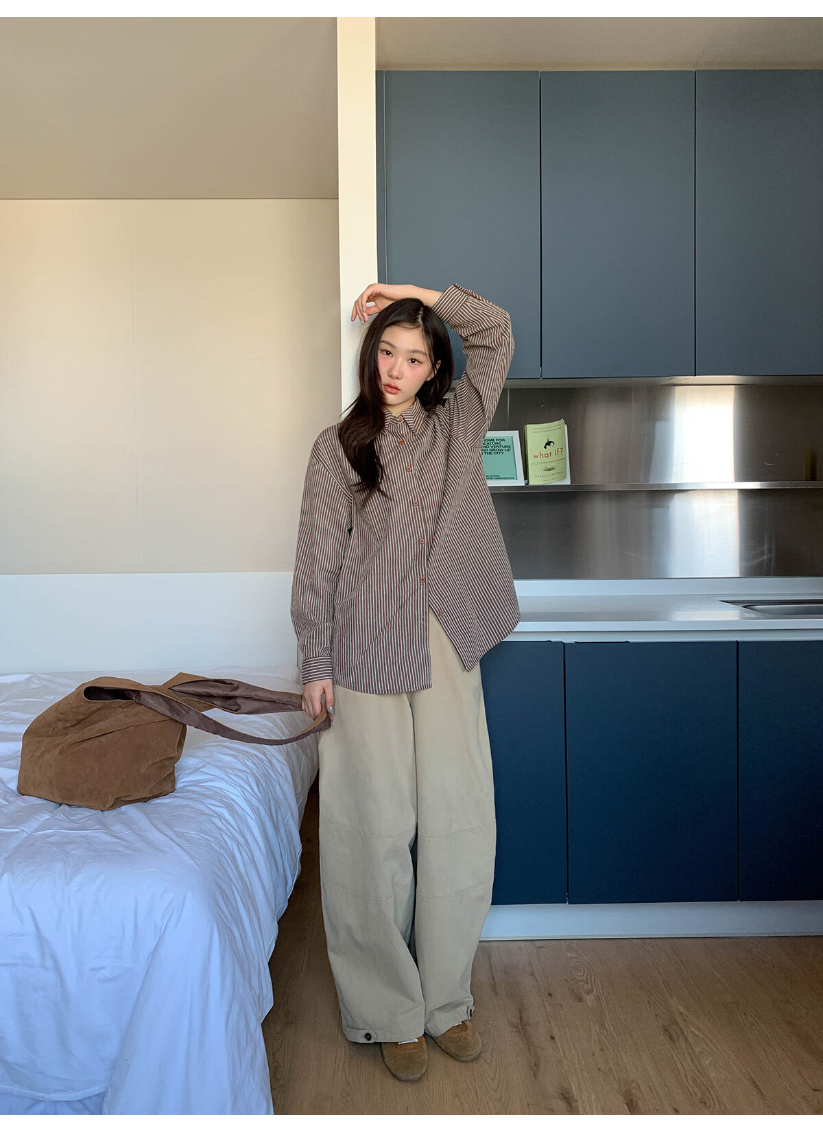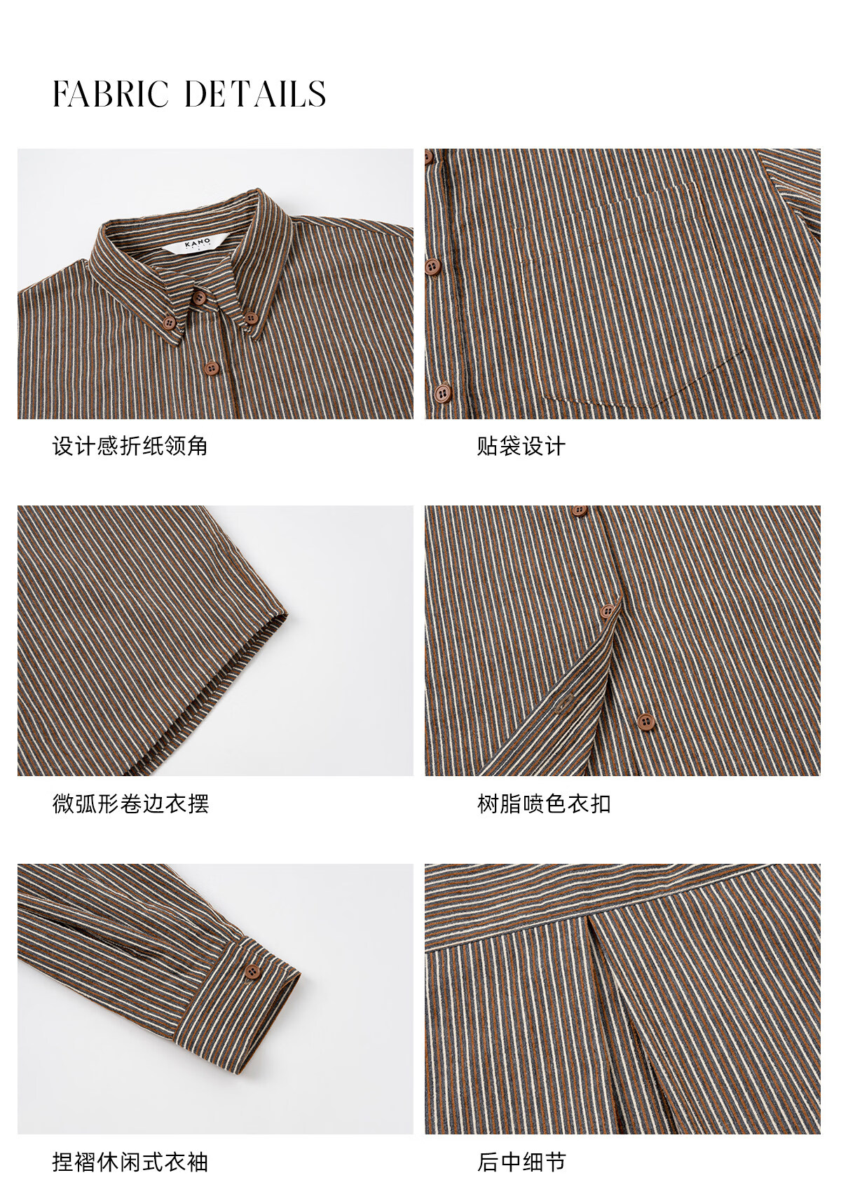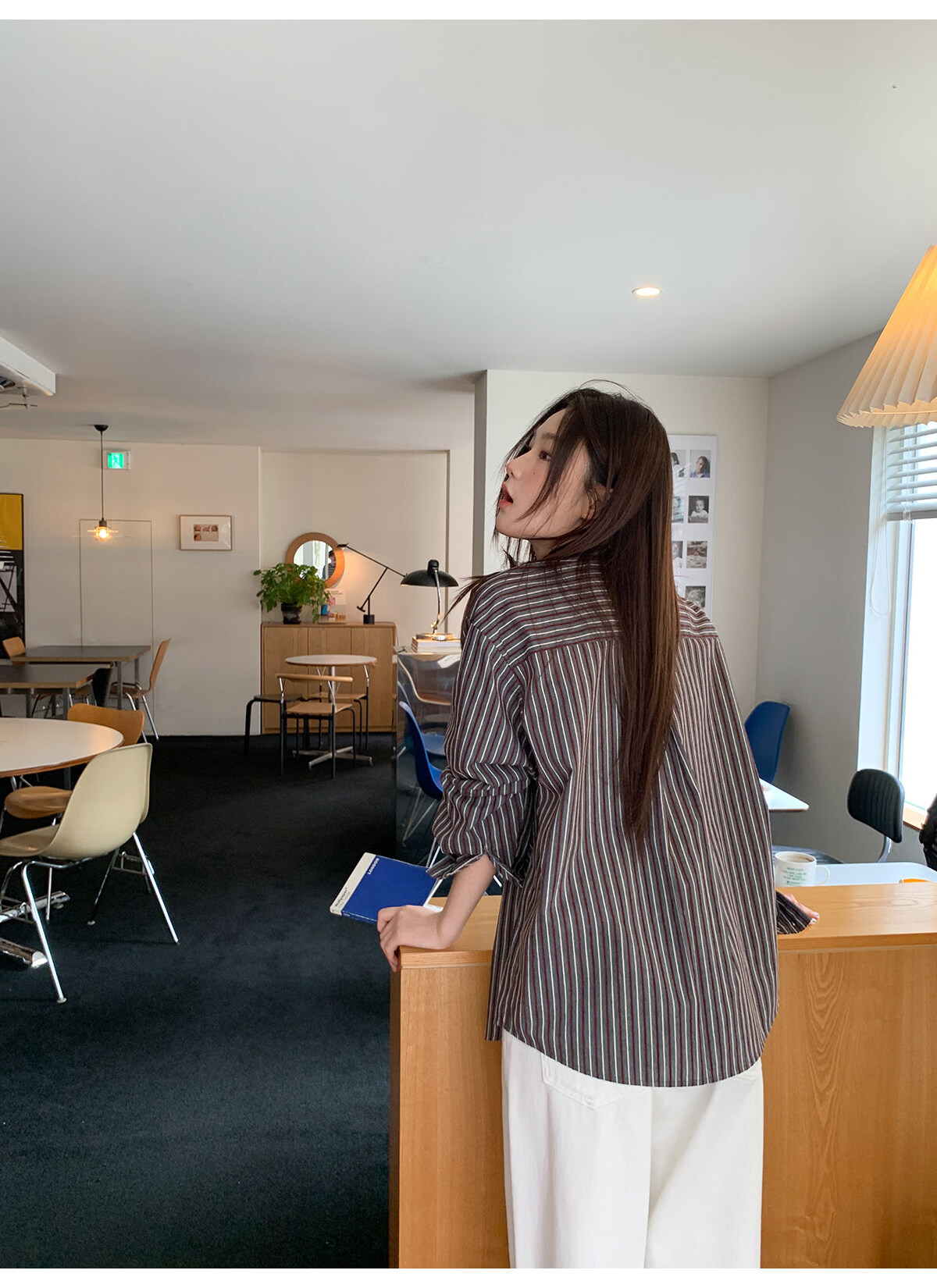 Hello Canon Striped texture design lapel shirt women's autumn and winter 202 new retro Korean style casual shirt brown XS