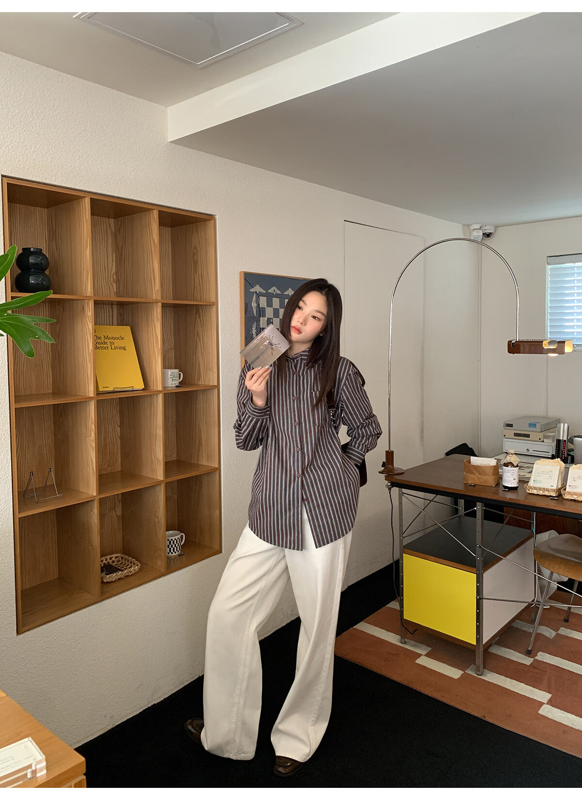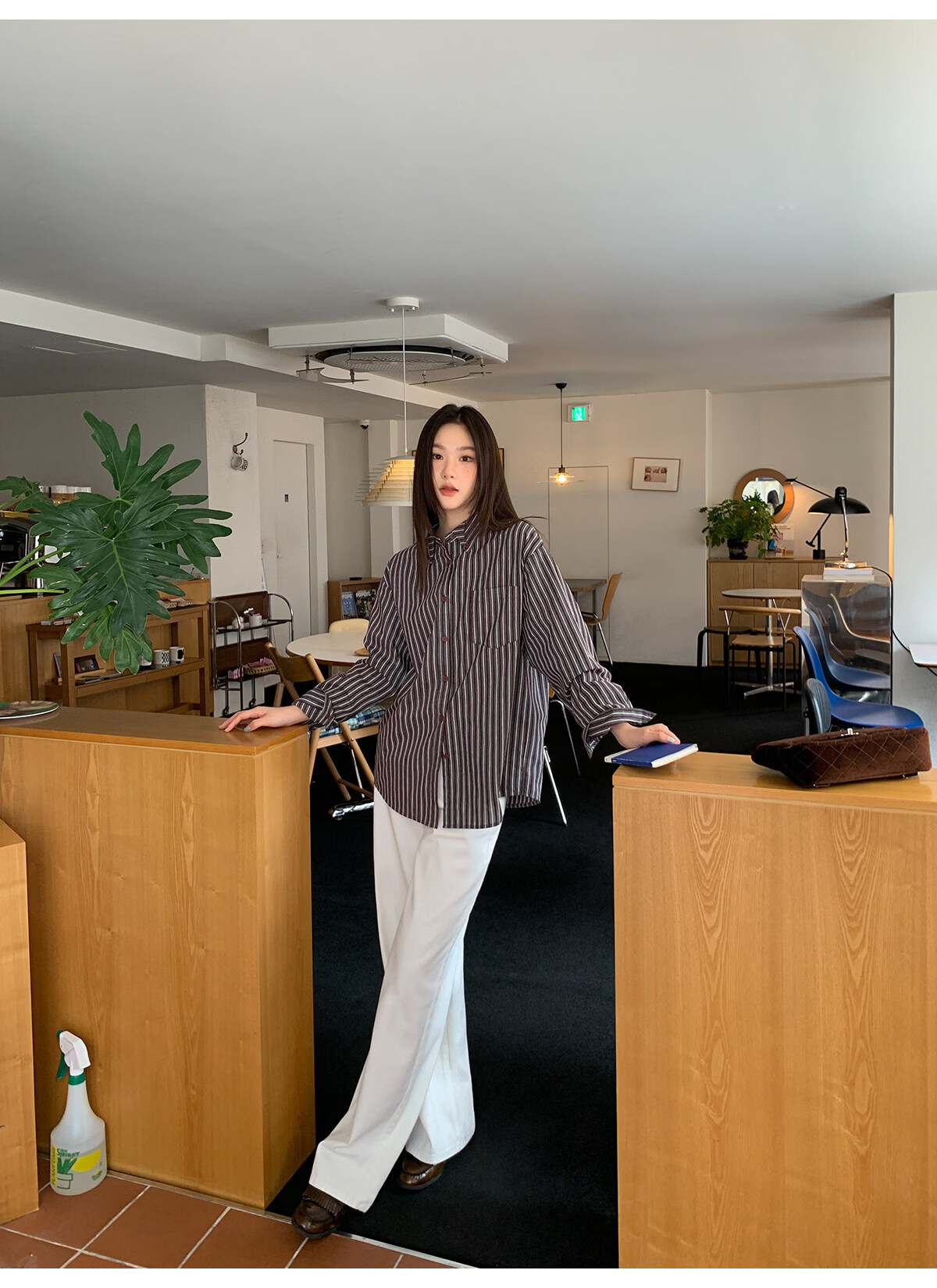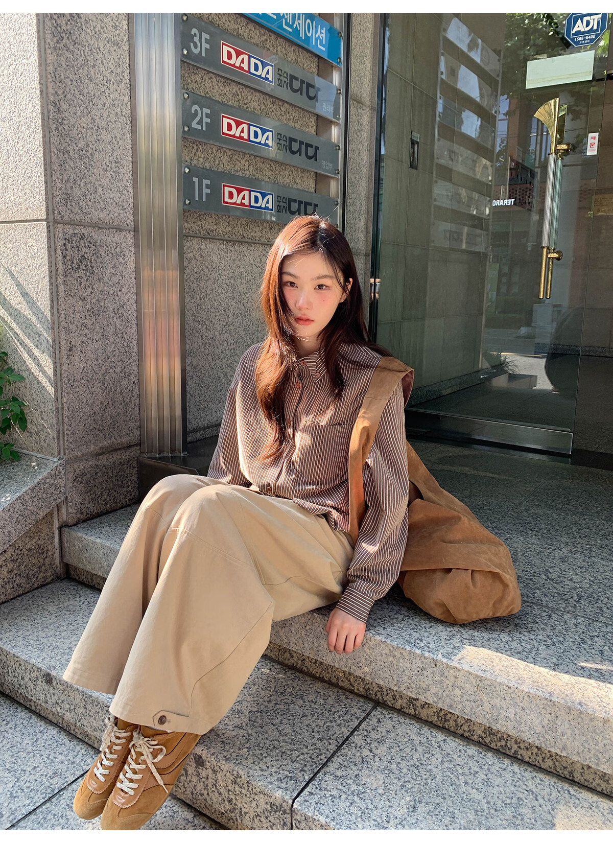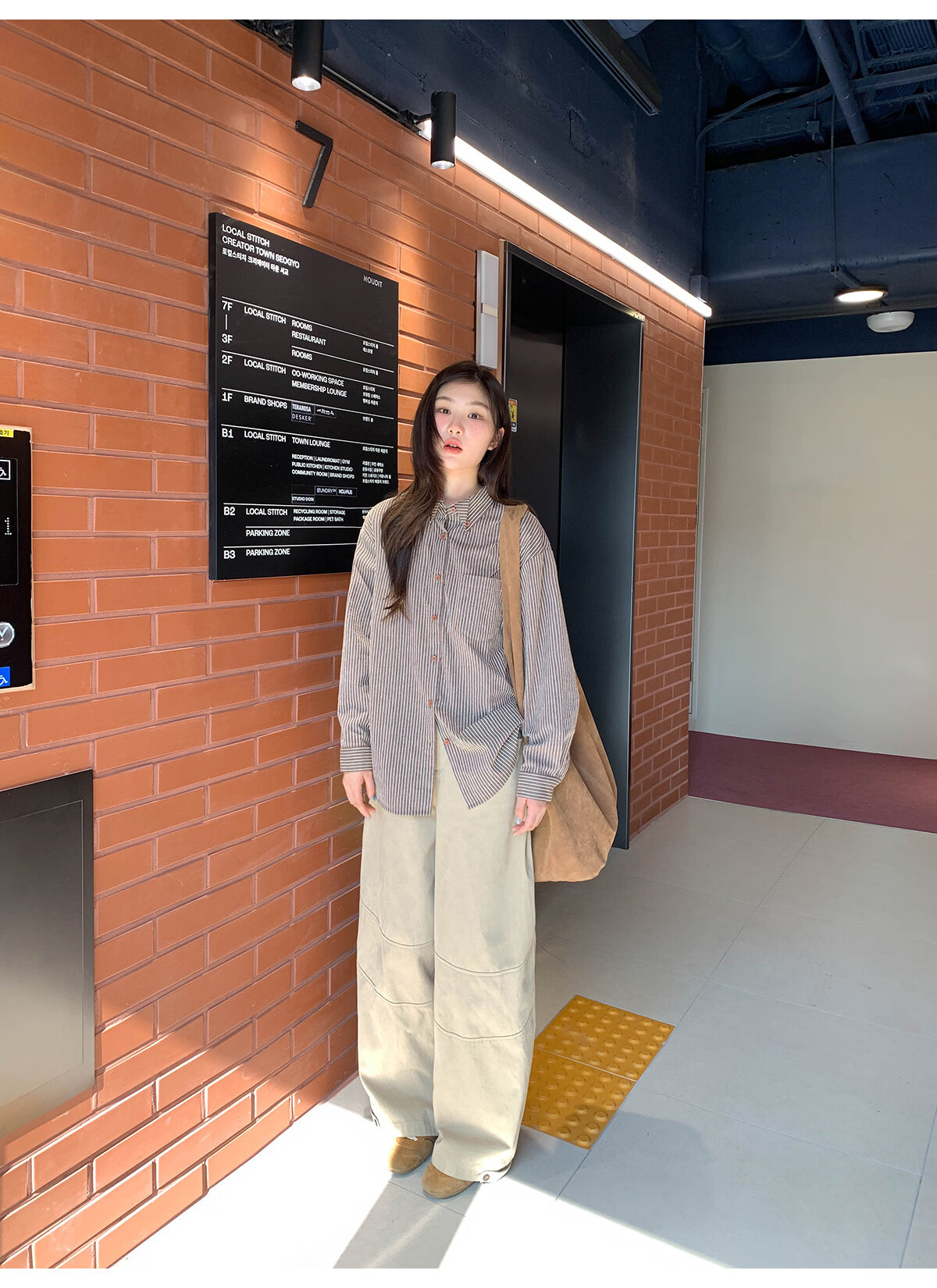 Hello Canon Striped texture design lapel shirt women's autumn and winter 202 new retro Korean style casual shirt brown XS
