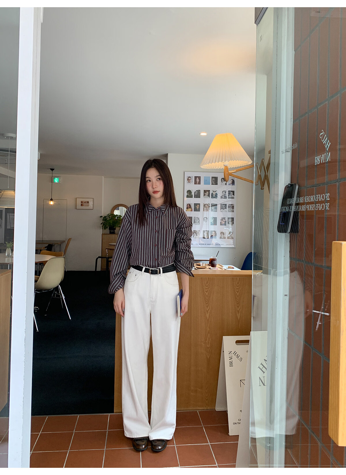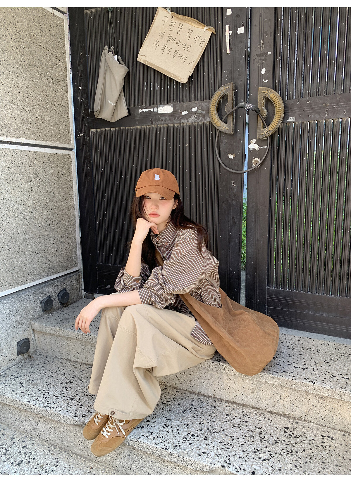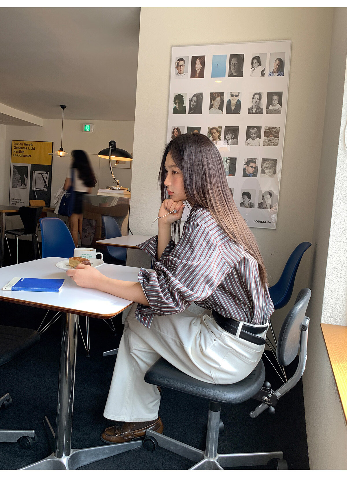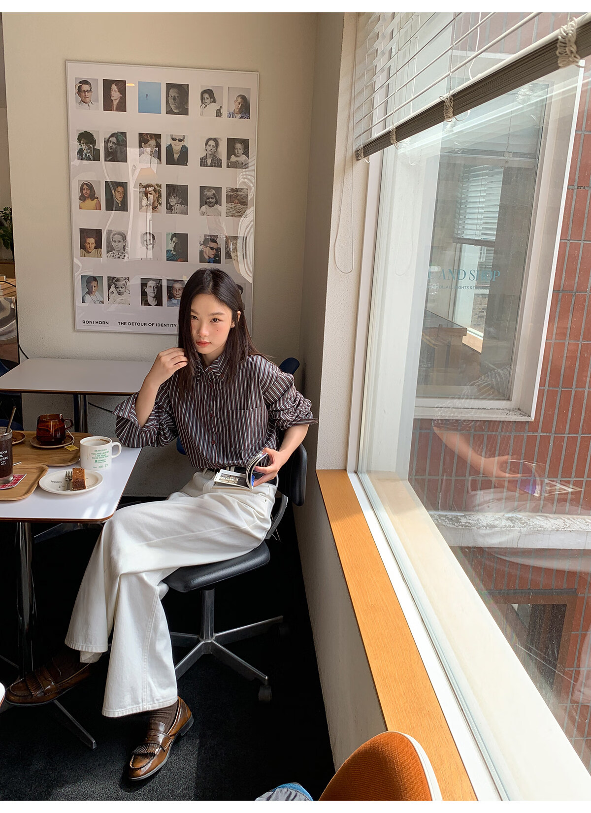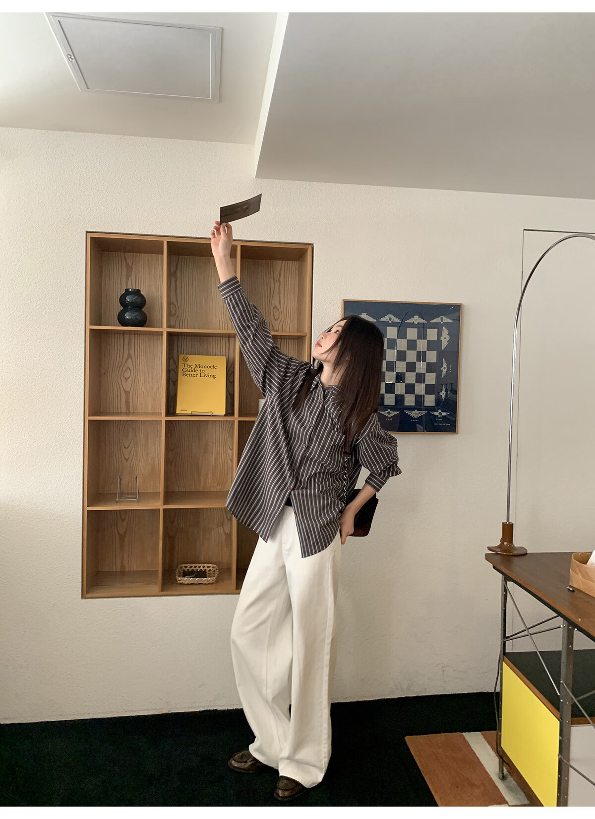 Hello Canon Striped texture design lapel shirt women's autumn and winter 202 new retro Korean style casual shirt brown XS