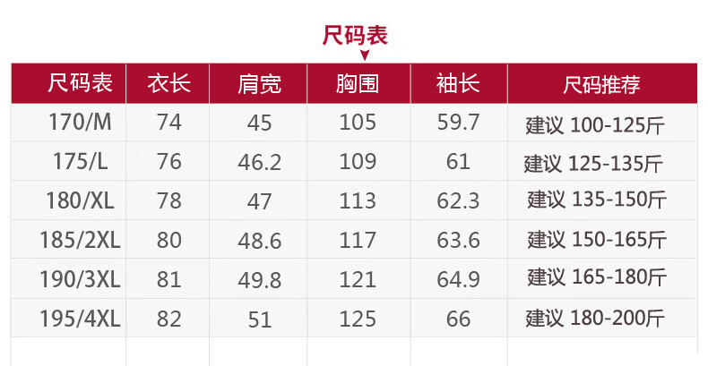 China (cm) 165 / 88-90 170 / 96-98 175 / 108-110 180 / 118-122 185 / 126-130