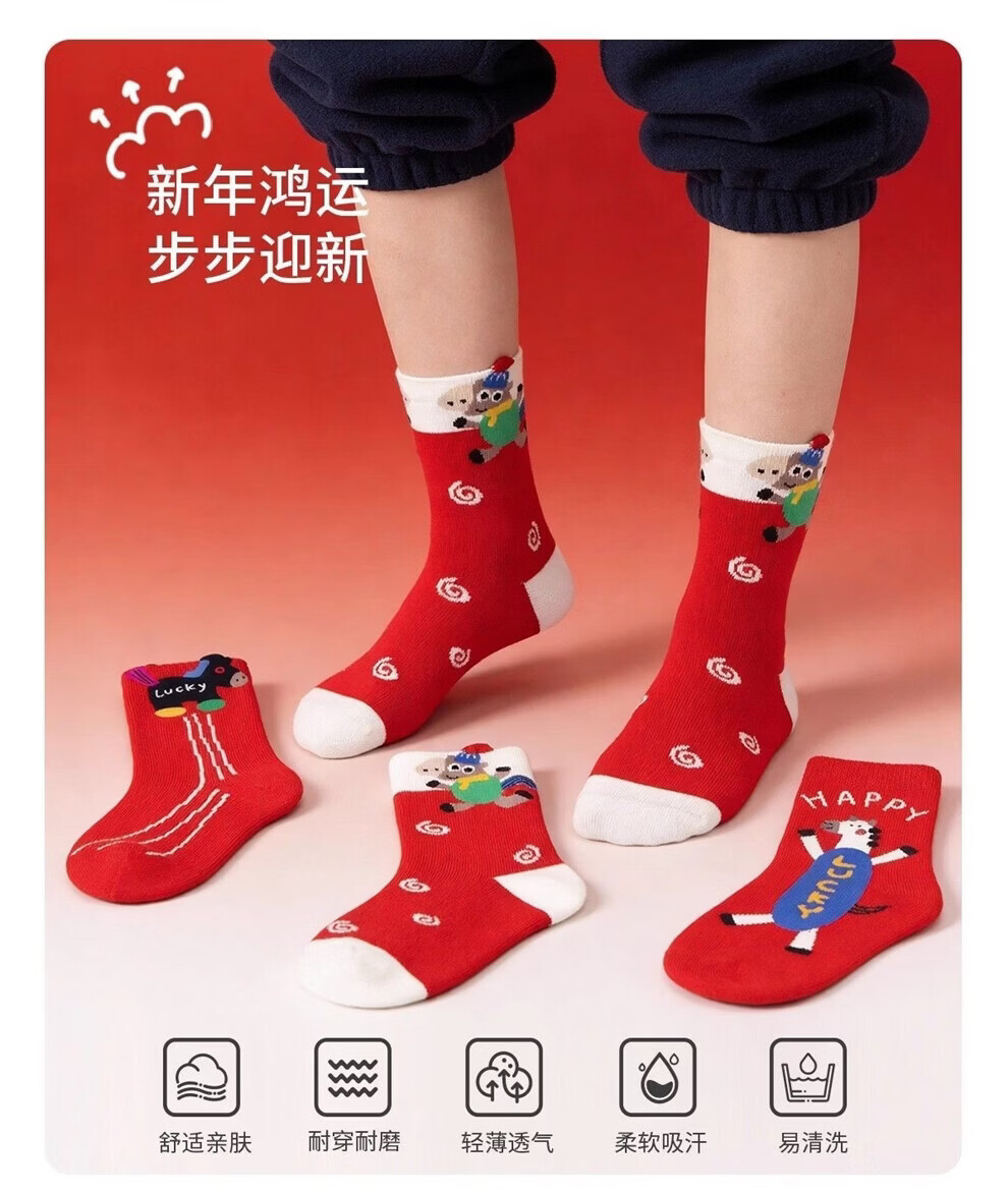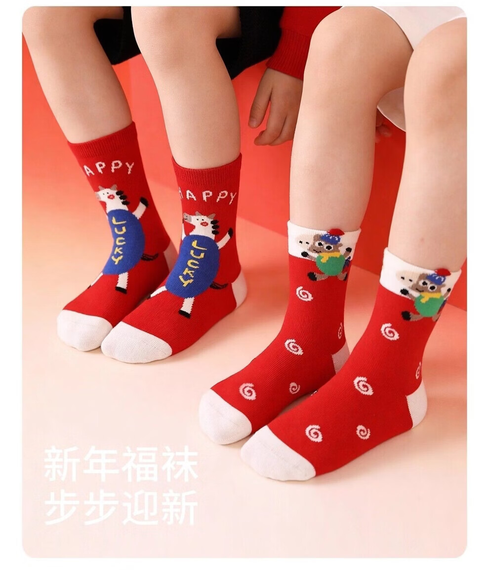 MQDMINI Red Socks Children's Mid-calf Socks New Year Boys' Socks Red Girls' Red Socks Zodiac Year of the Horse Autumn and Winter Baby Happy Pony Red Socks 3 Pairs 9-12 Years Old Recommended Shoe Size 32-37