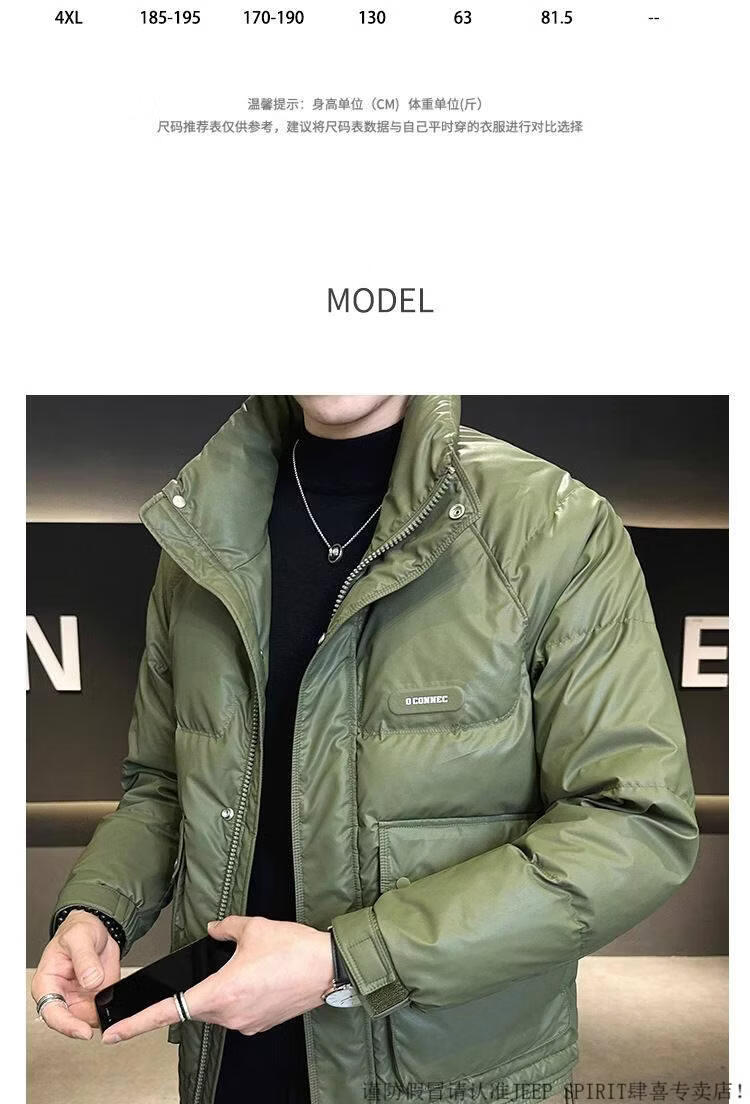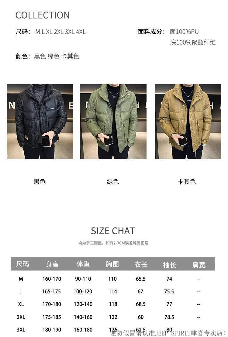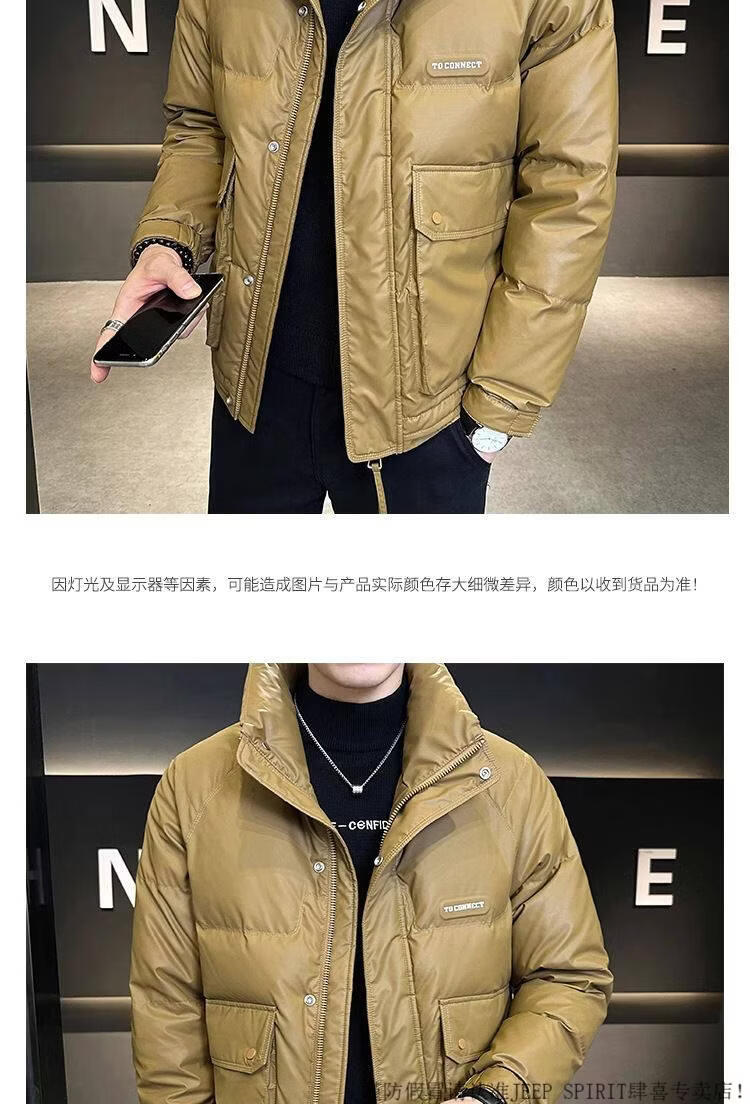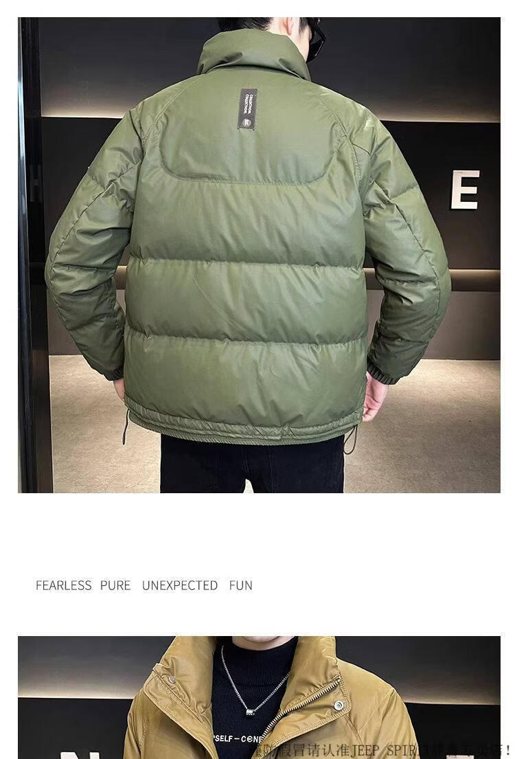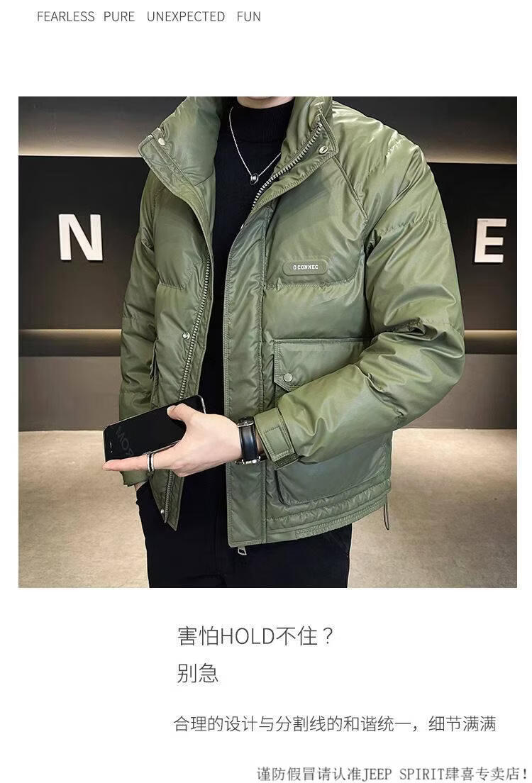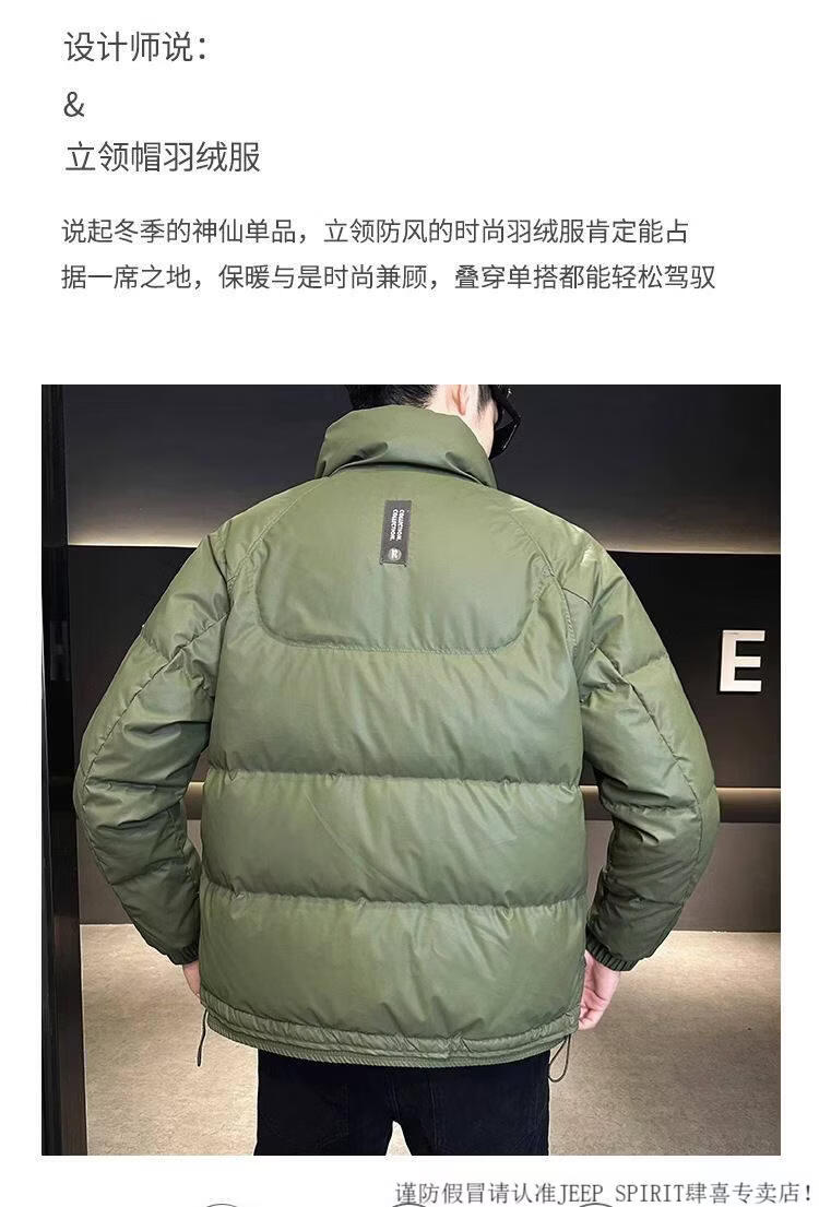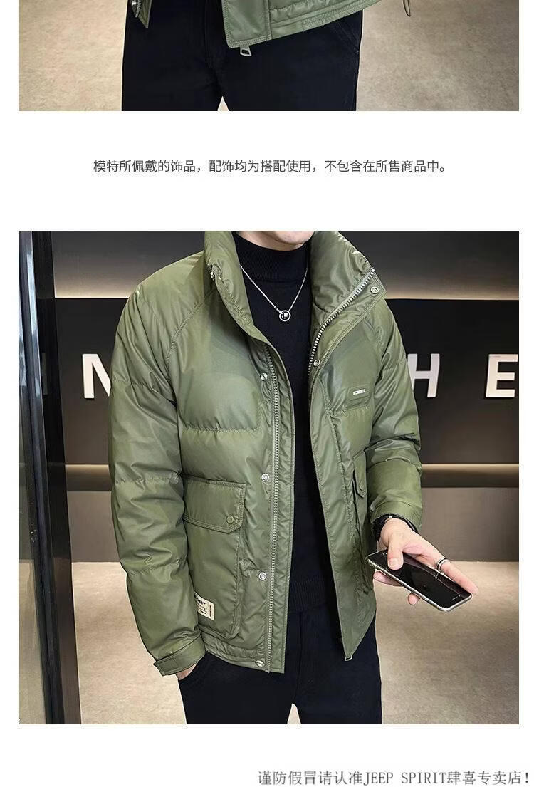 JEEP SPIRIT Leather Down Jacket Men's Winter 2025 New Men's Youth Short Winter Wear Thickened Stand Collar Jacket Army Green M