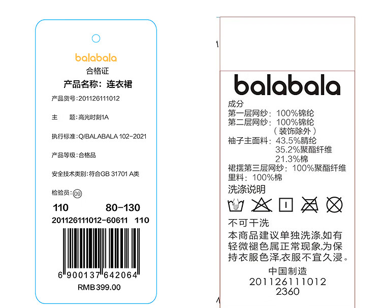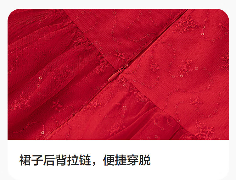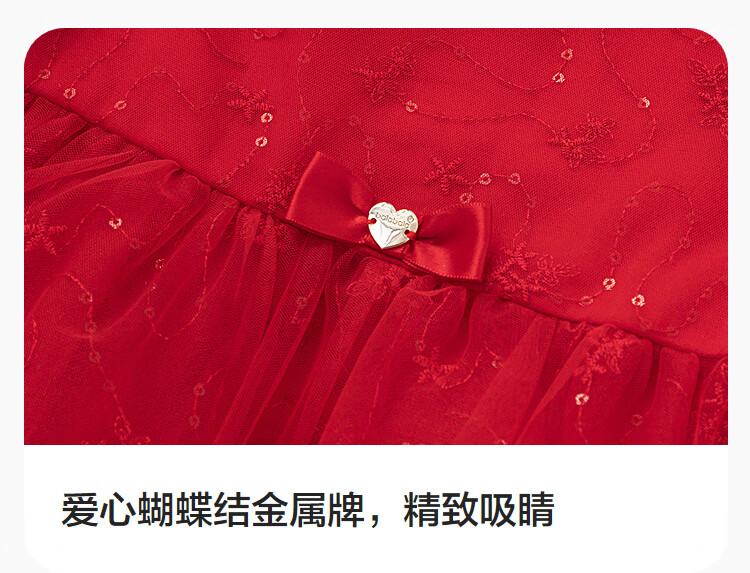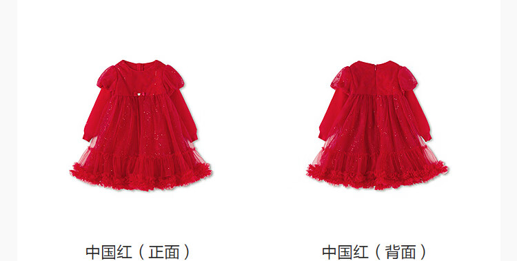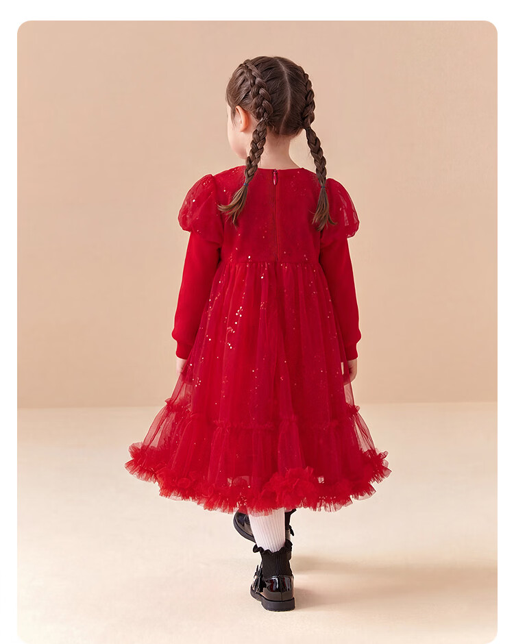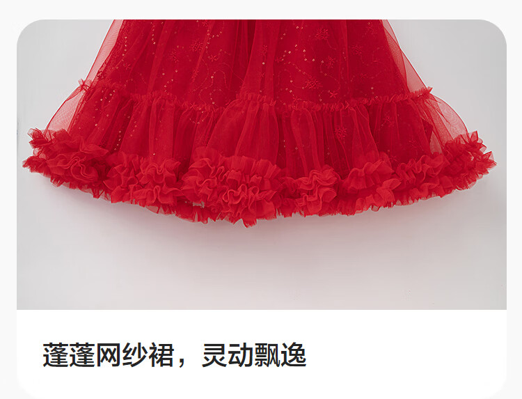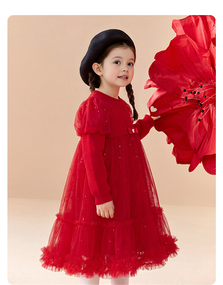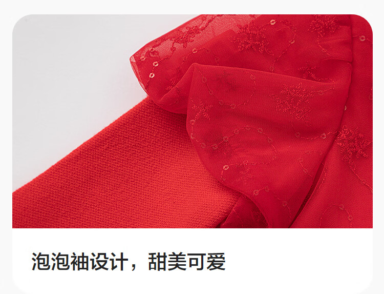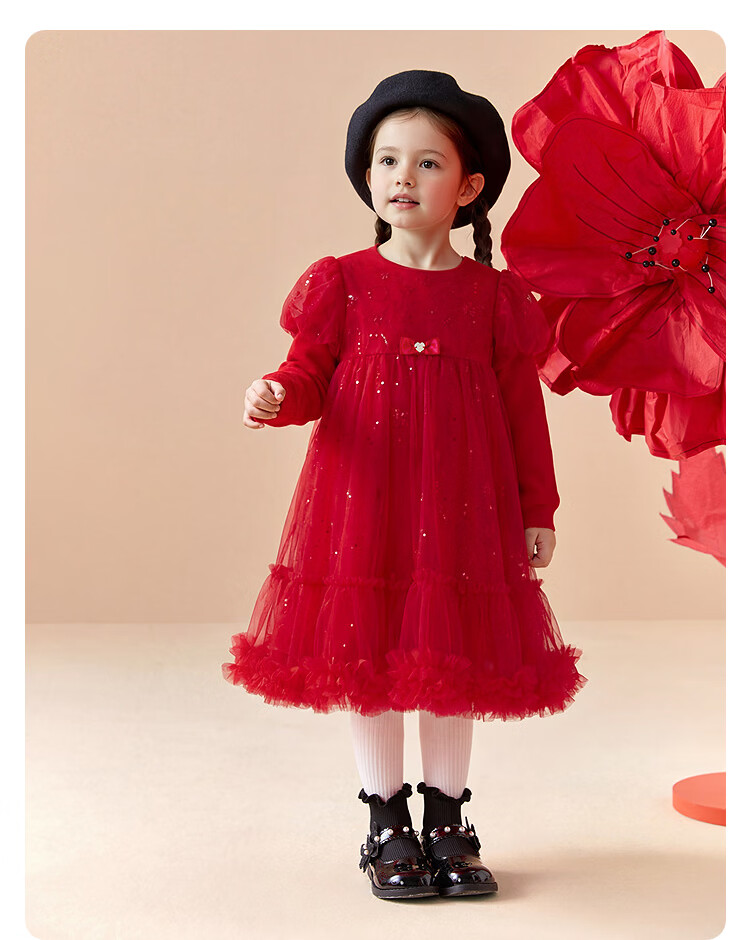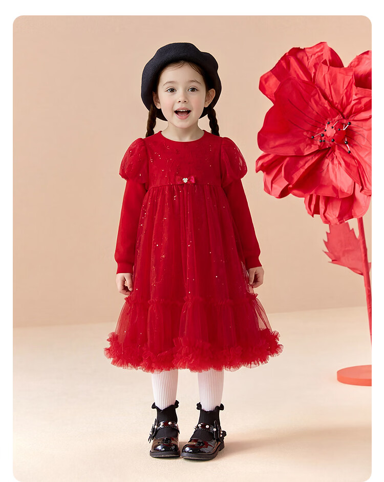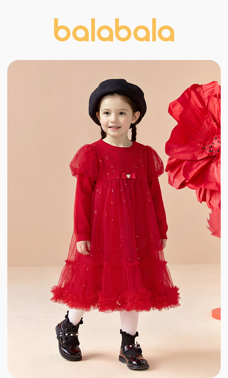 巴拉巴拉【商场同款】儿童连衣裙女童2026新款春装泡泡袖网纱裙子 中国红60611 110