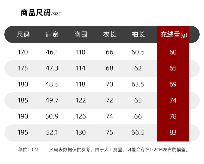 China (cm) 165 / 88-90 170 / 96-98 175 / 108-110 180 / 118-122 185 / 126-130