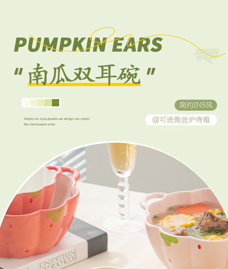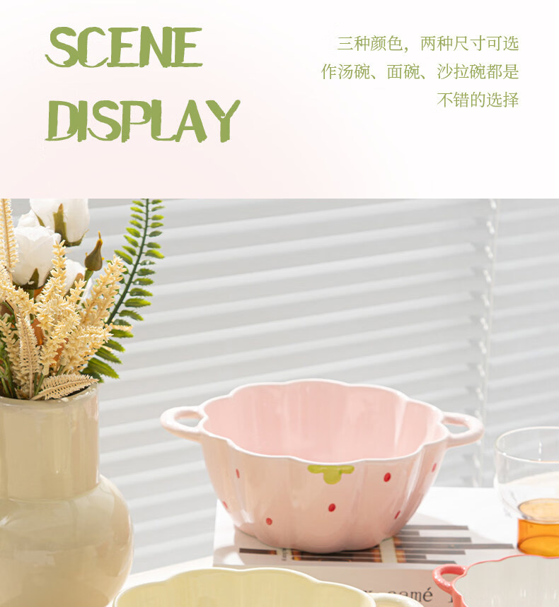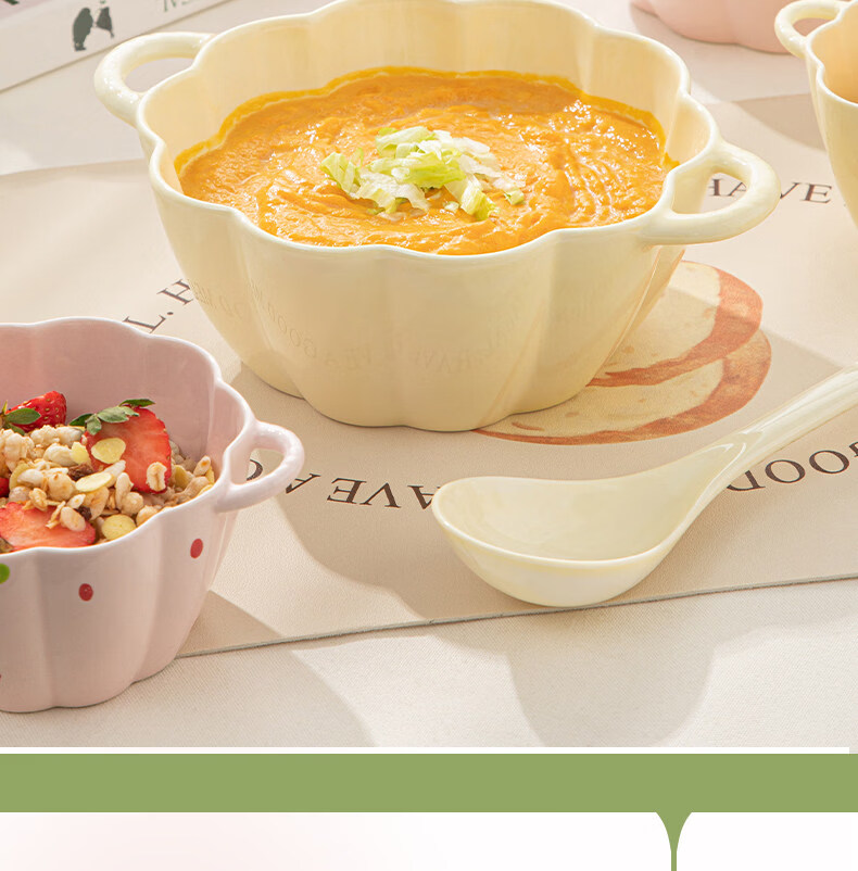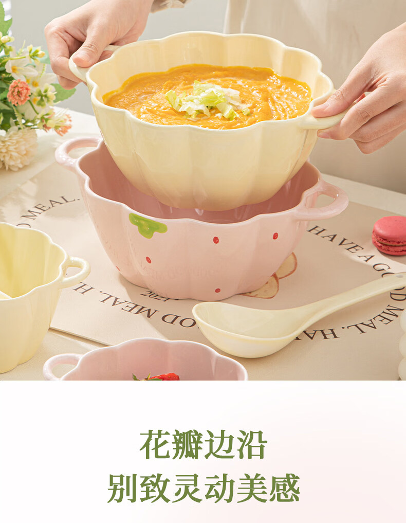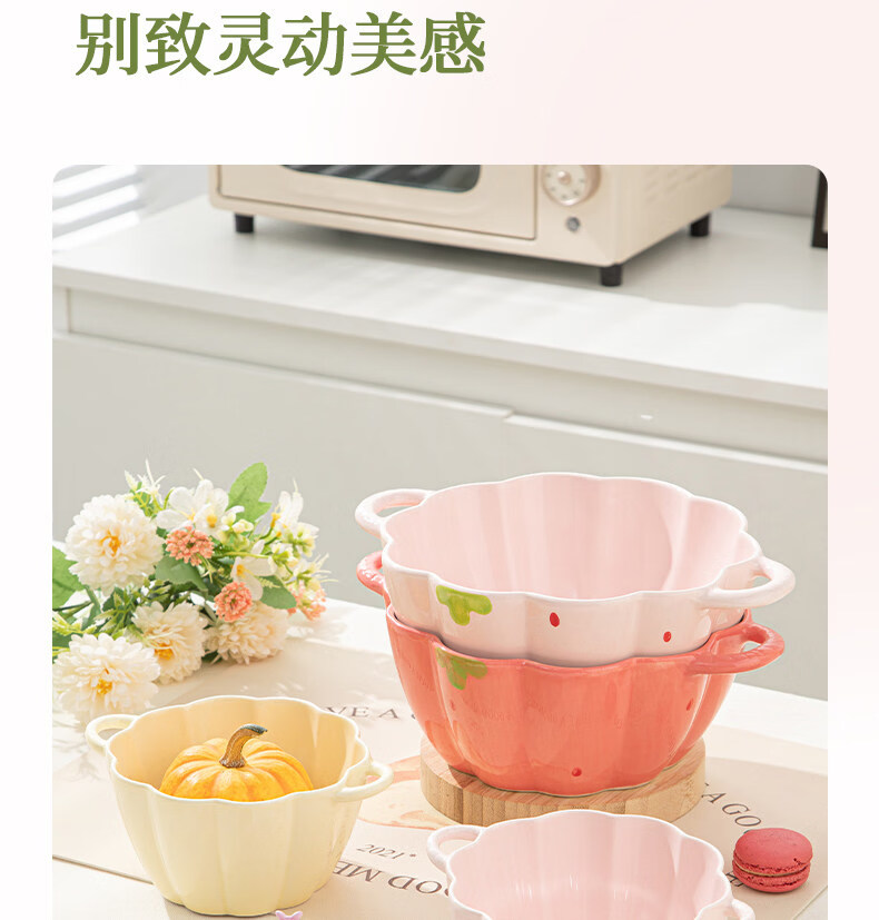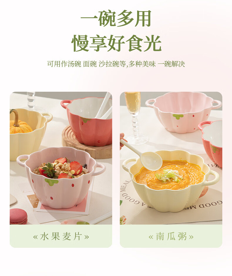 Tuojin Strawberry Cute Double-Eared Instant Noodle Bowl Children's Personal Ceramic Soup Bowl Fruit Princess Rice Bowl Pumpkin Bowl Pink 6.5-inch Double-Eared Bowl