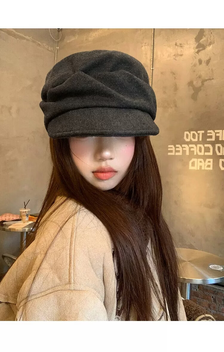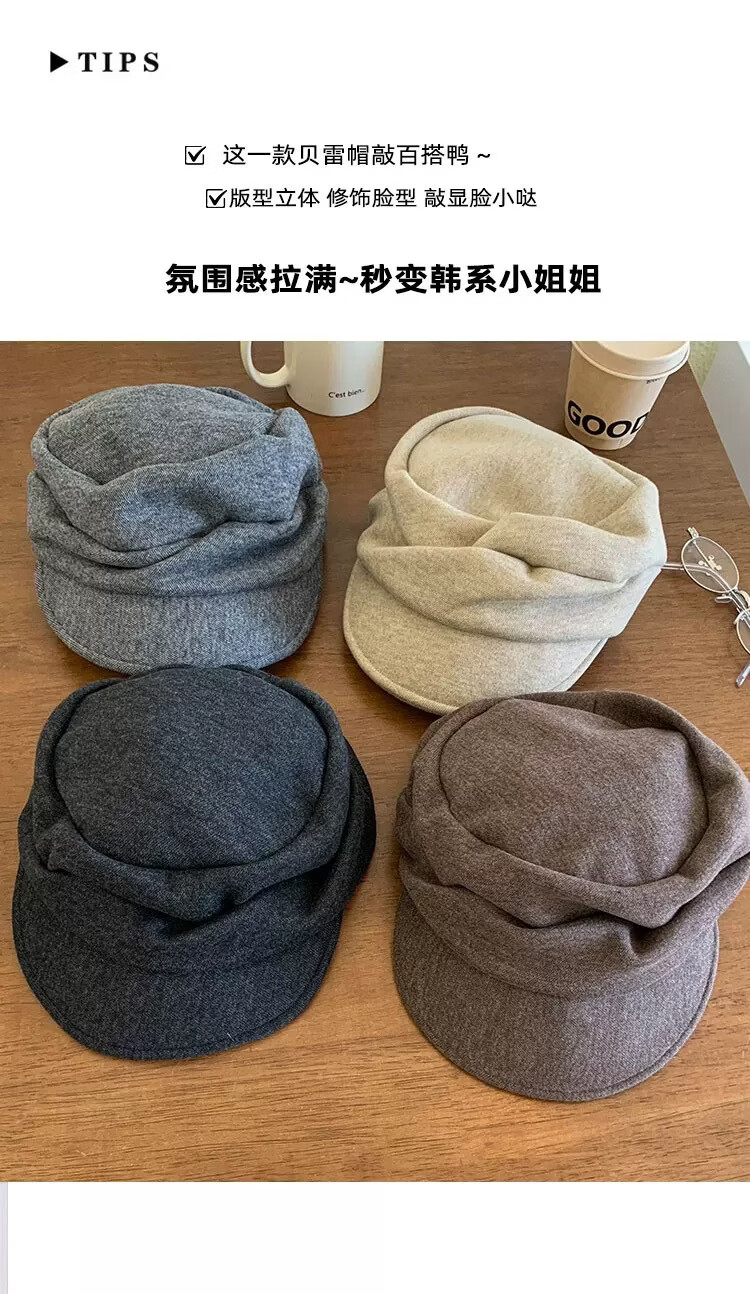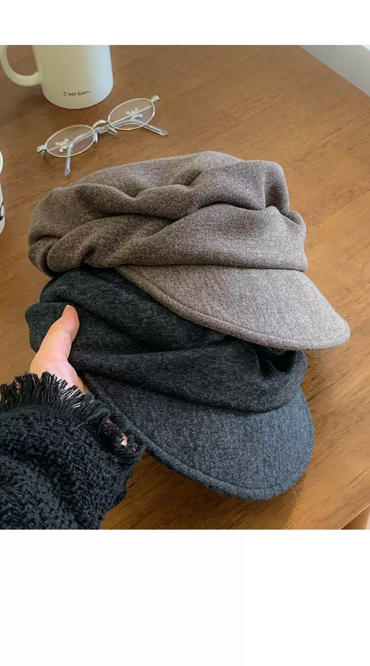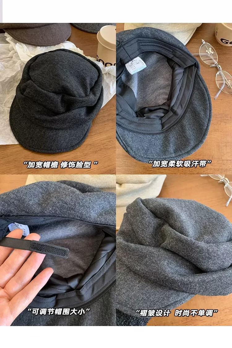 No top, no bottom, Japanese Yamamoto style black pleated beret for women, autumn and winter face-showing small newsboy hat, large head circumference, versatile painter hat, gray, one size fits all, adjustable