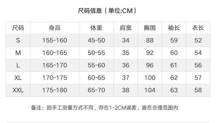 China (cm) 165 / 88-90 170 / 96-98 175 / 108-110 180 / 118-122 185 / 126-130