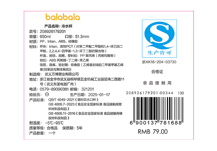BALABALA balaOne BALABALA children's water cup for boys and girls 2026 new summer cute pink 60001 110cm