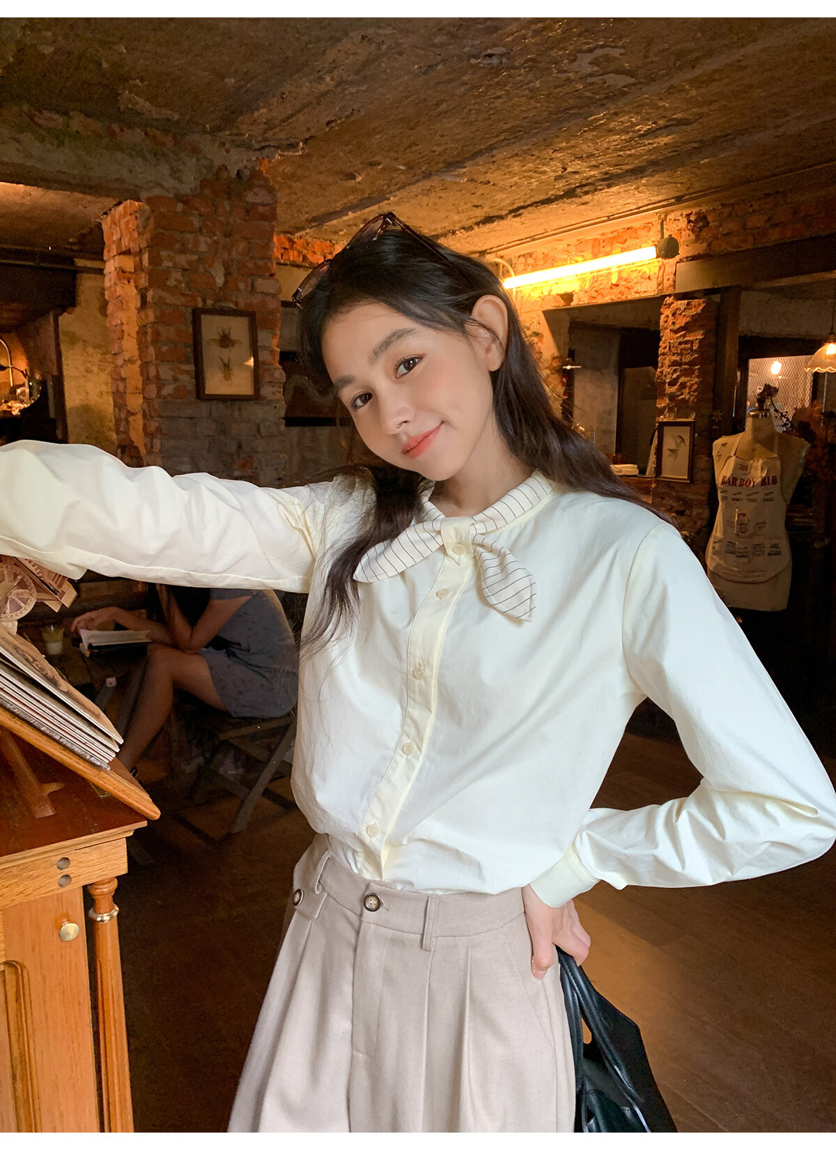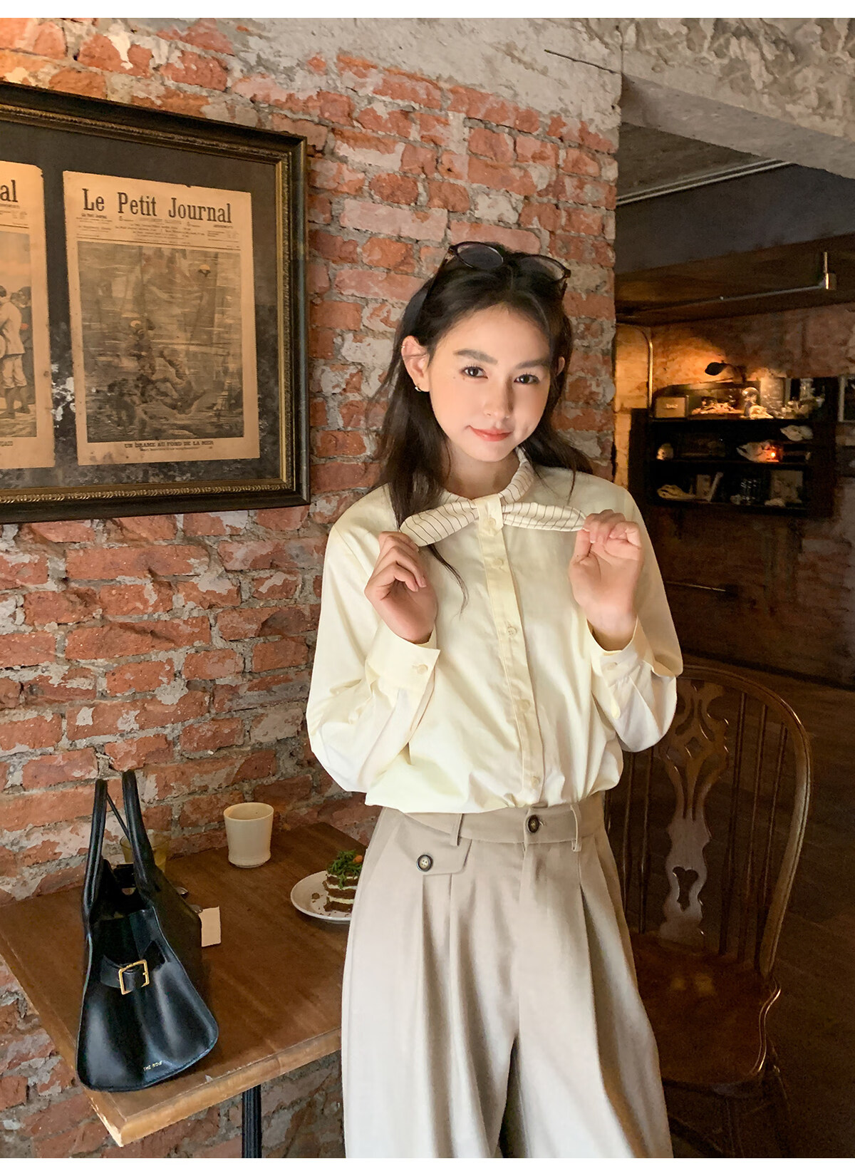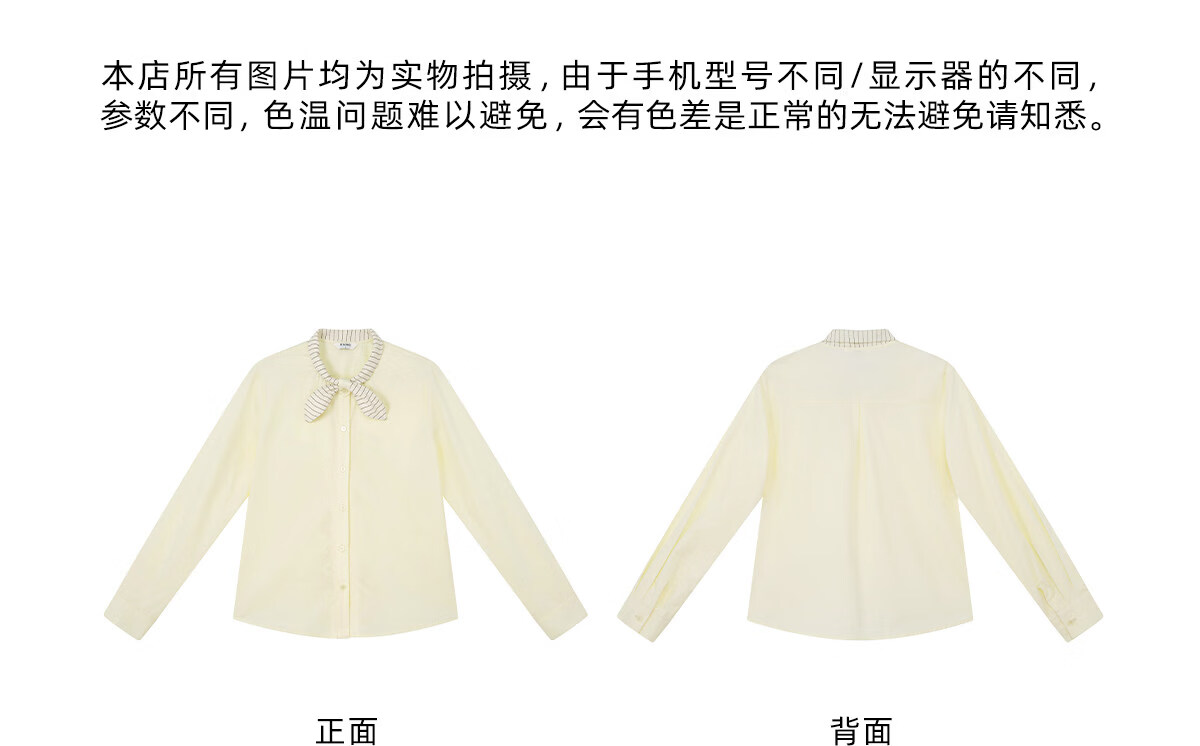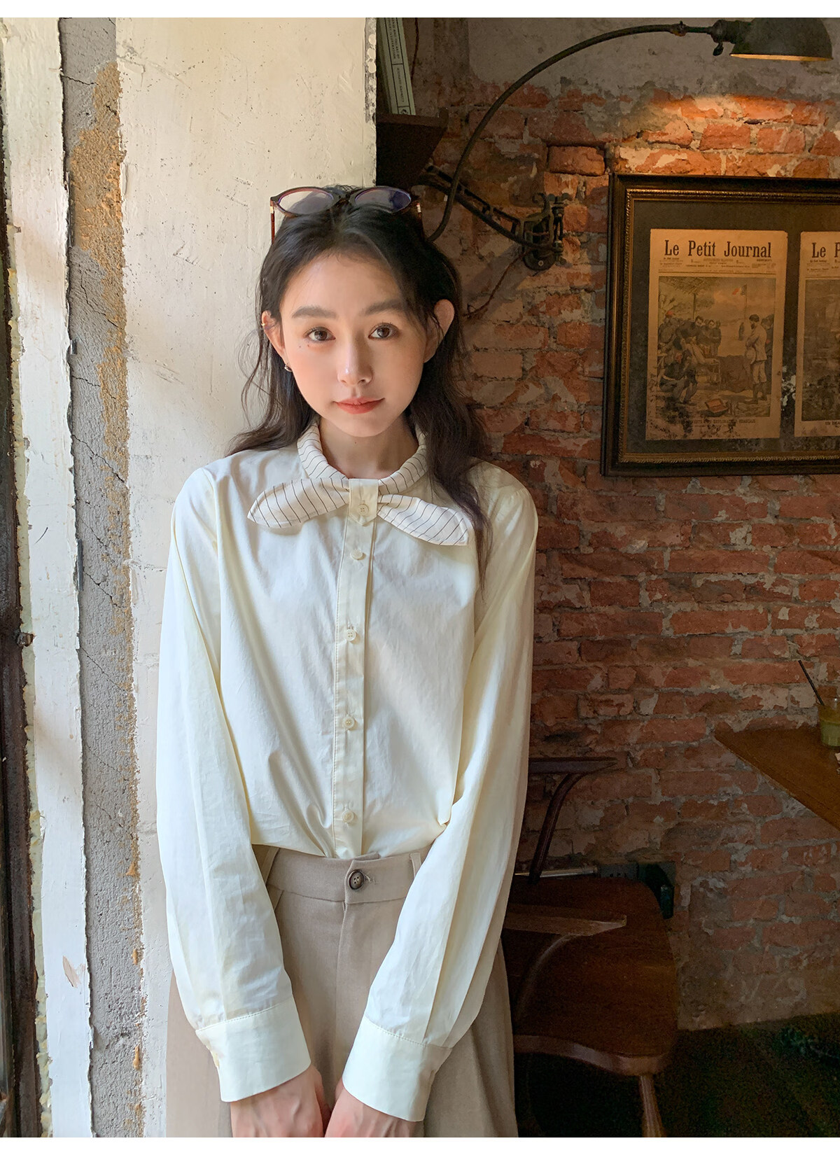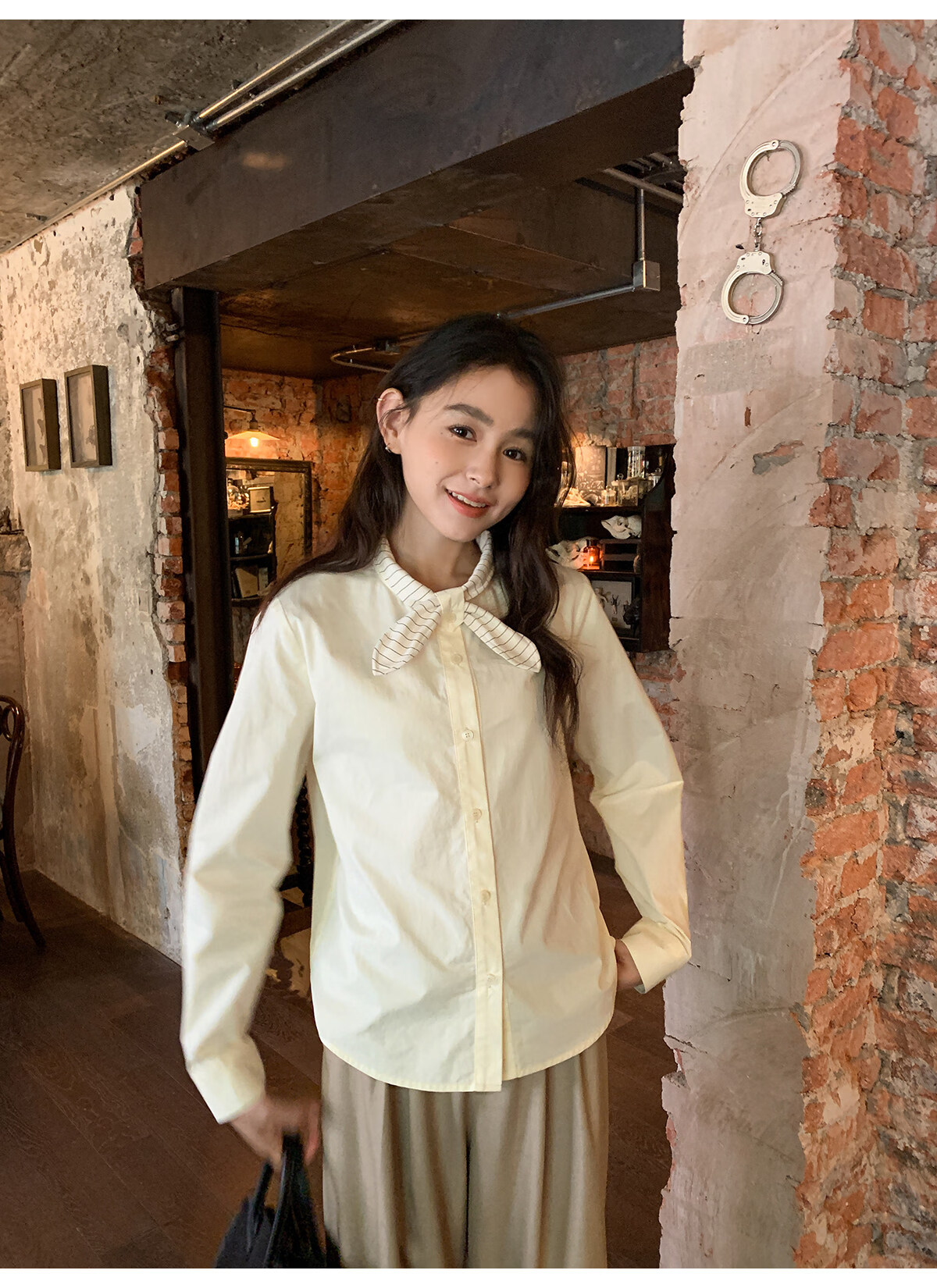 Hello Canon Striped Rabbit Ear Collar Long Sleeve Shirt Women's Retro Niche Design Shirt Temperament Simple Top Light Yellow XS
