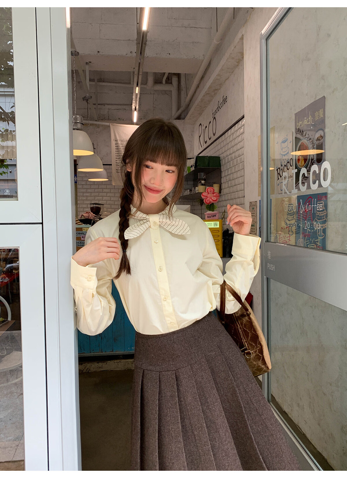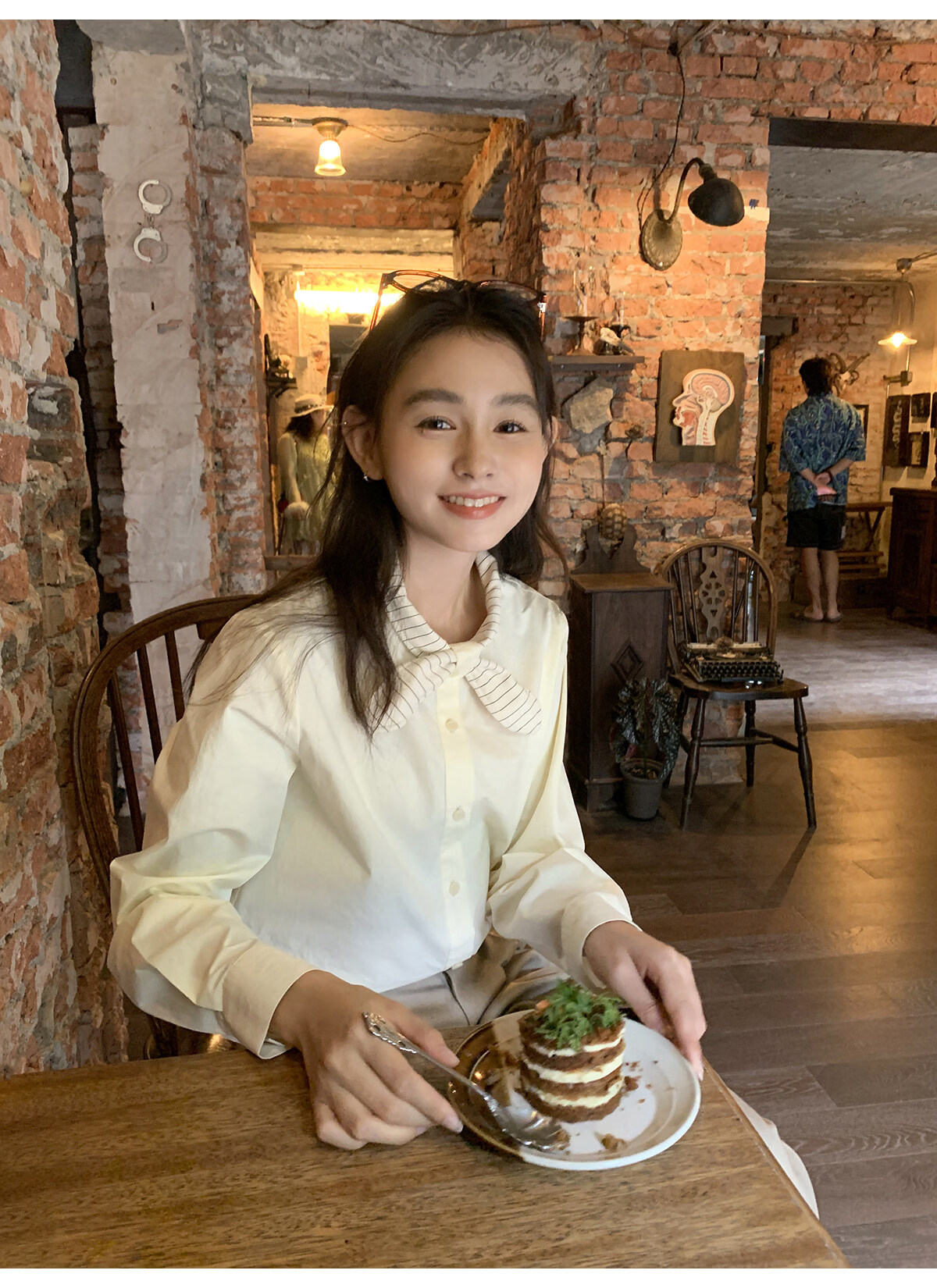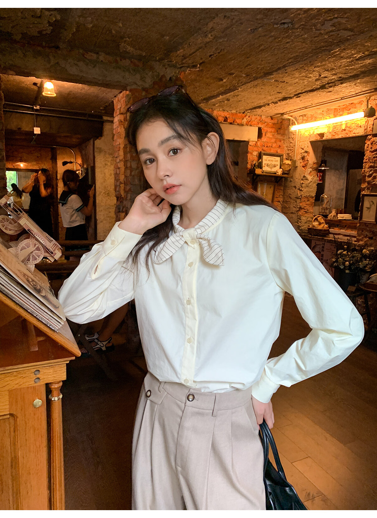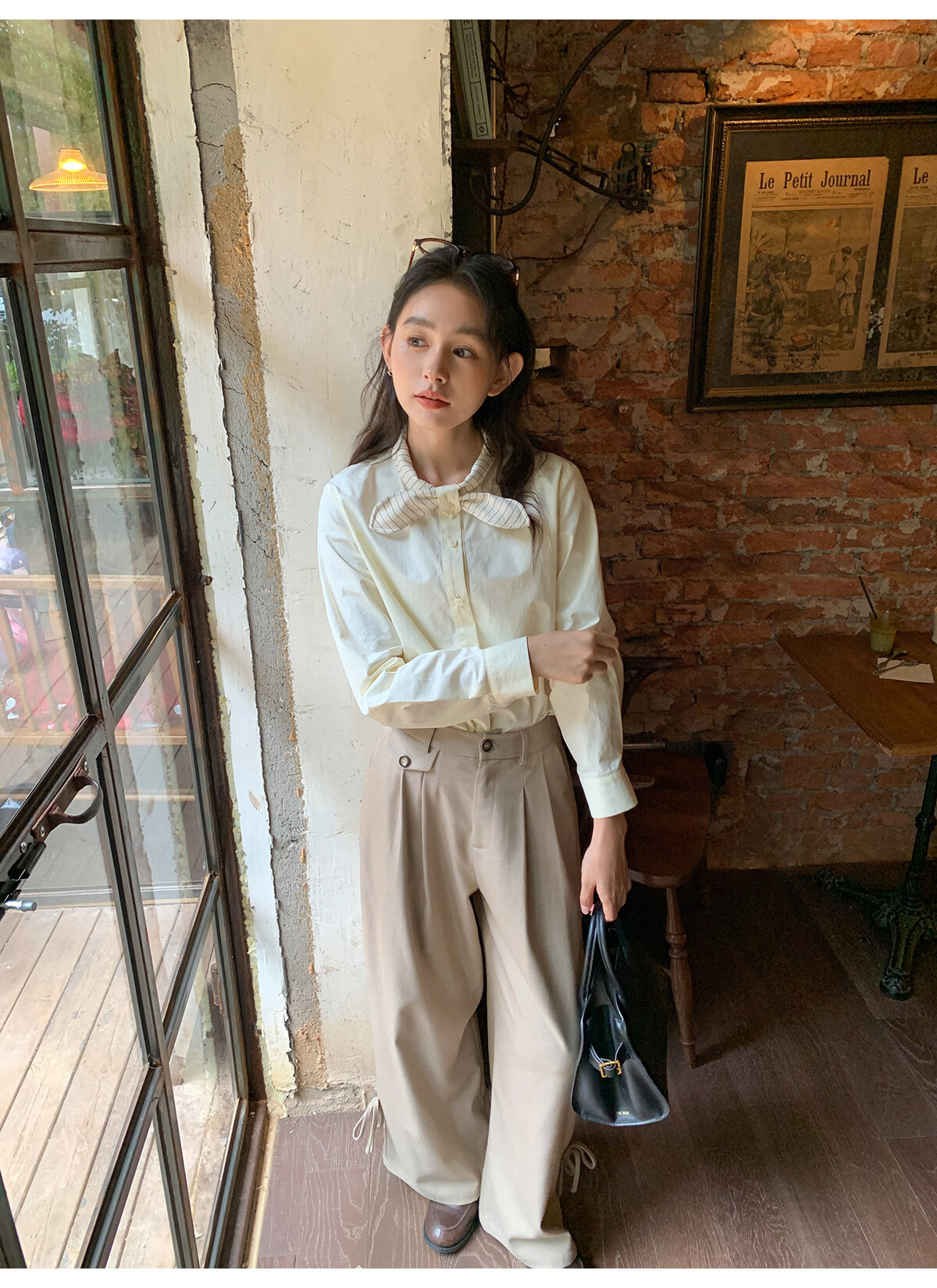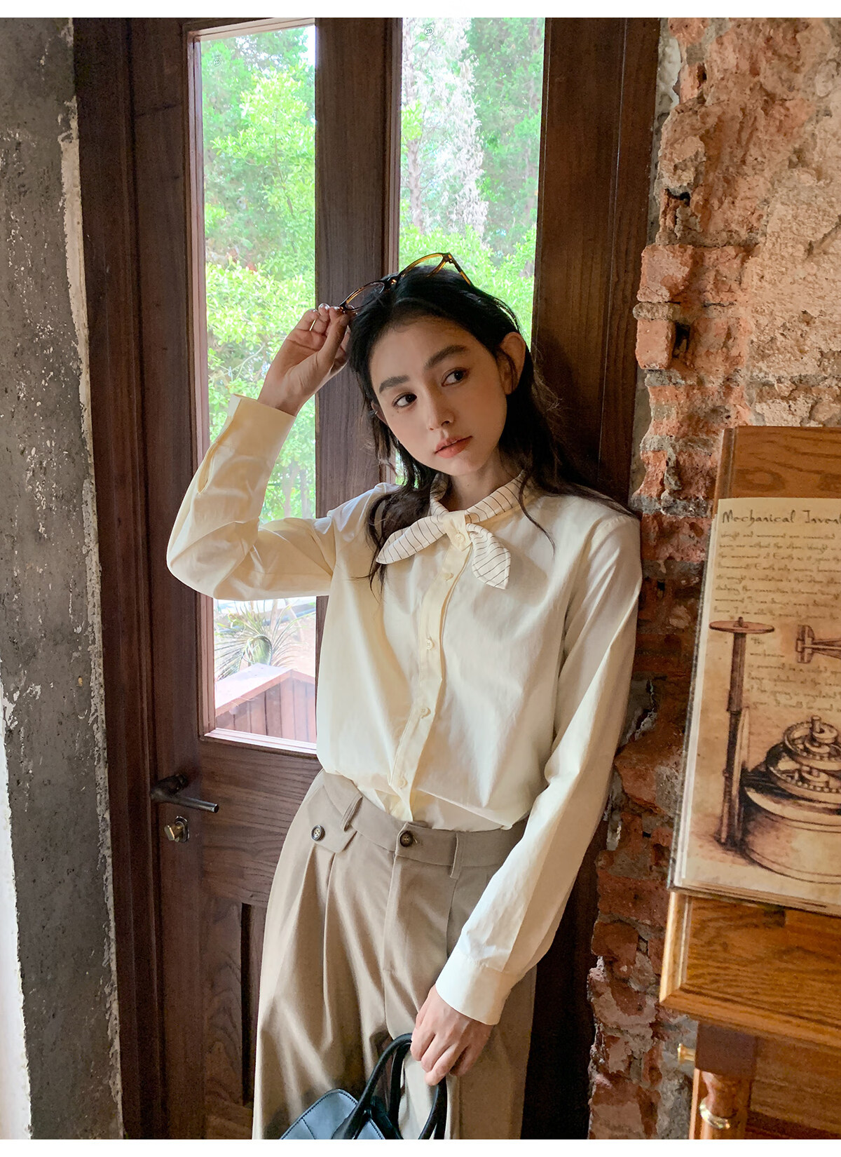 Hello Canon Striped Rabbit Ear Collar Long Sleeve Shirt Women's Retro Niche Design Shirt Temperament Simple Top Light Yellow XS
