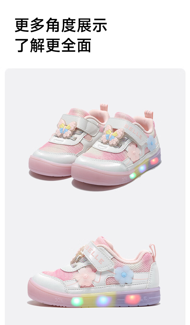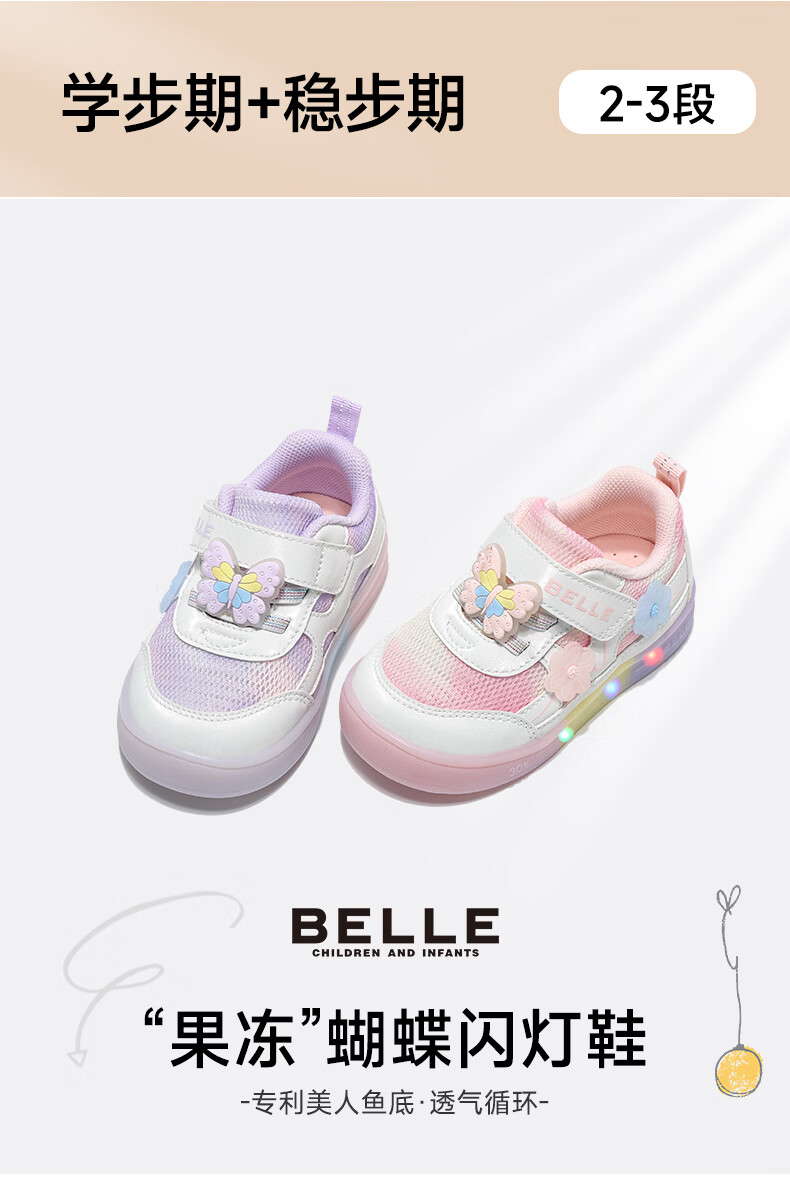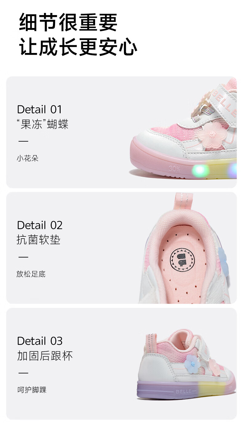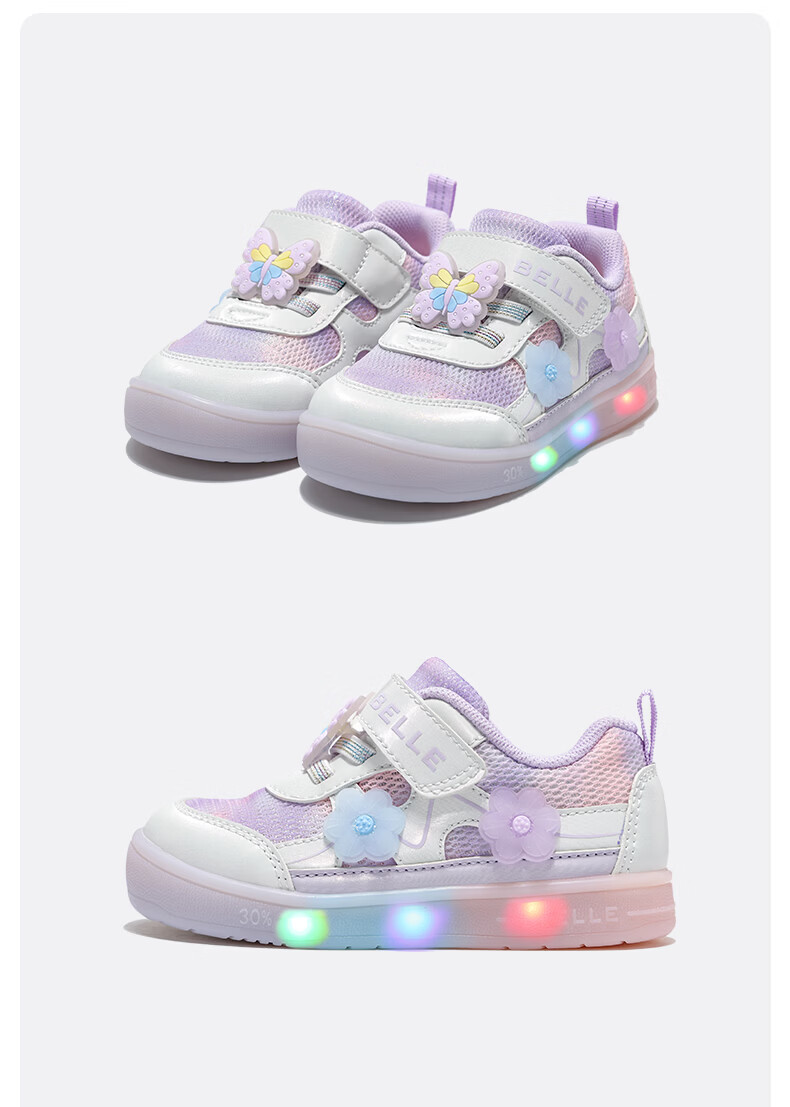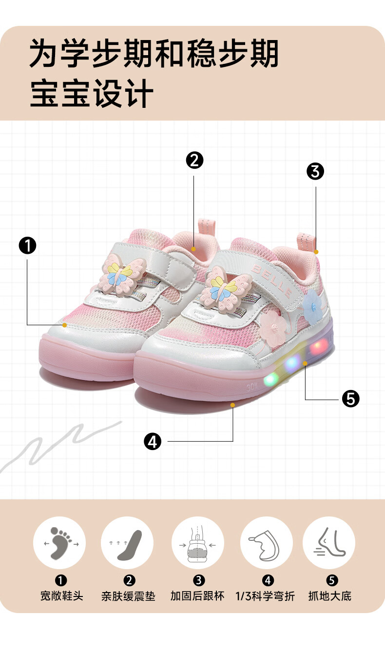 Belle Children's Shoes 26 Spring New Children's Toddler Shoes Girl Butterfly Flash Shoes Soft Sole Lightweight Breathable Baby Casual Shoes Butterfly Flash-White/Pink 21 Suitable for feet about 12.9-13.3cm long