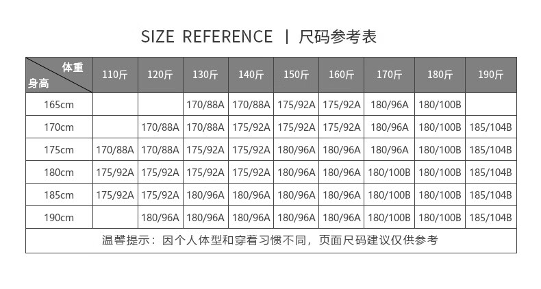 China (cm) 165 / 88-90 170 / 96-98 175 / 108-110 180 / 118-122 185 / 126-130