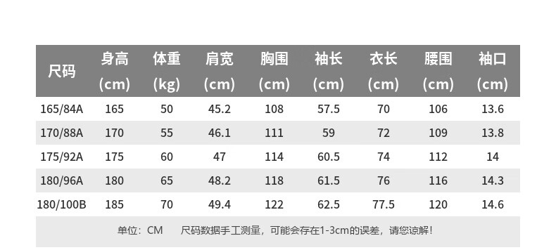 China (cm) 160-165/84-86 165-170 / 88-90 167-172 / 92-96 168-173 / 98-102 170-176 / 106-110
