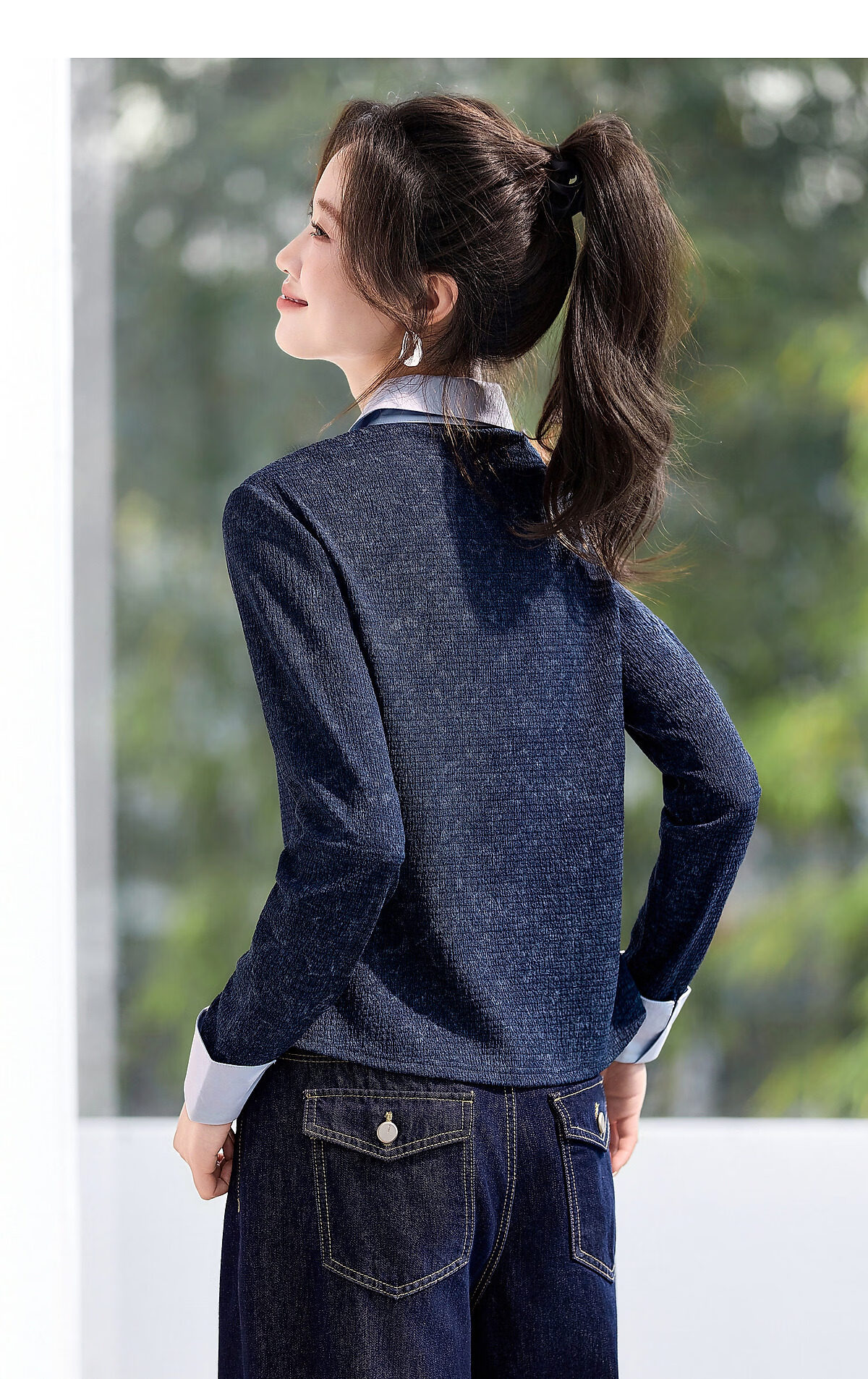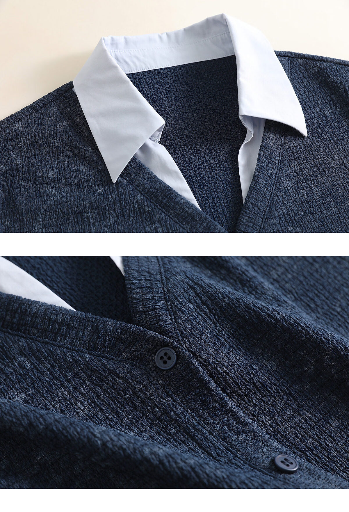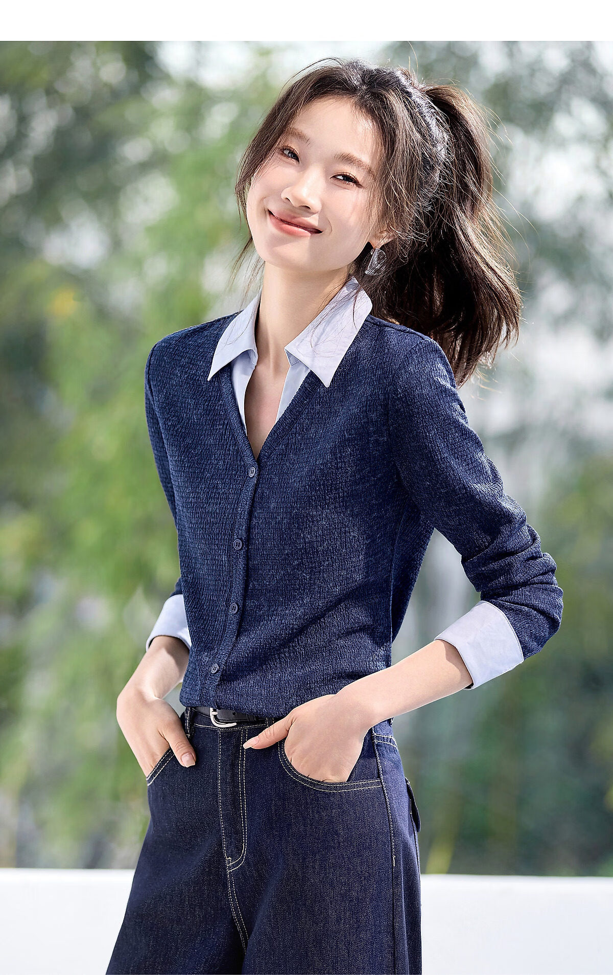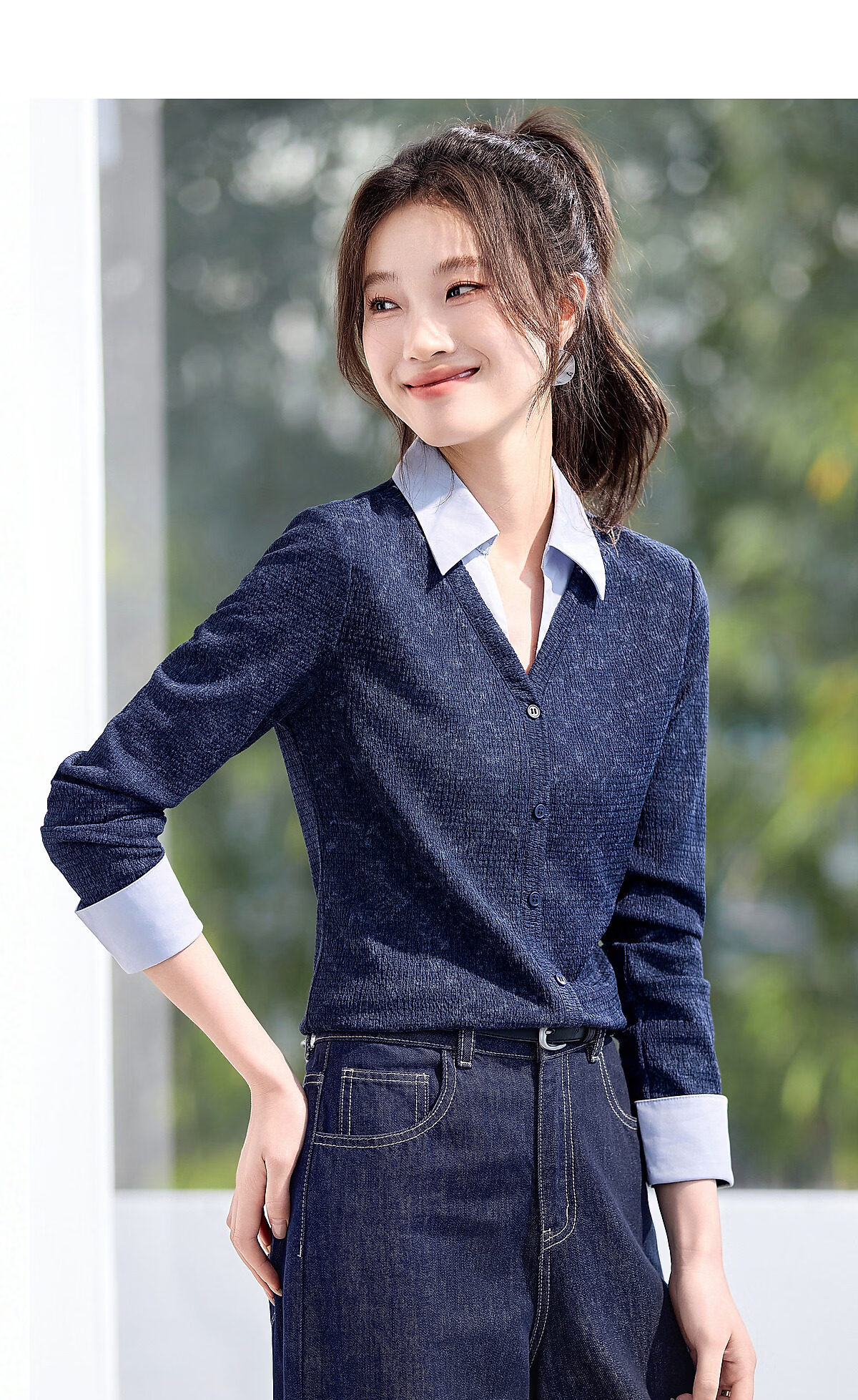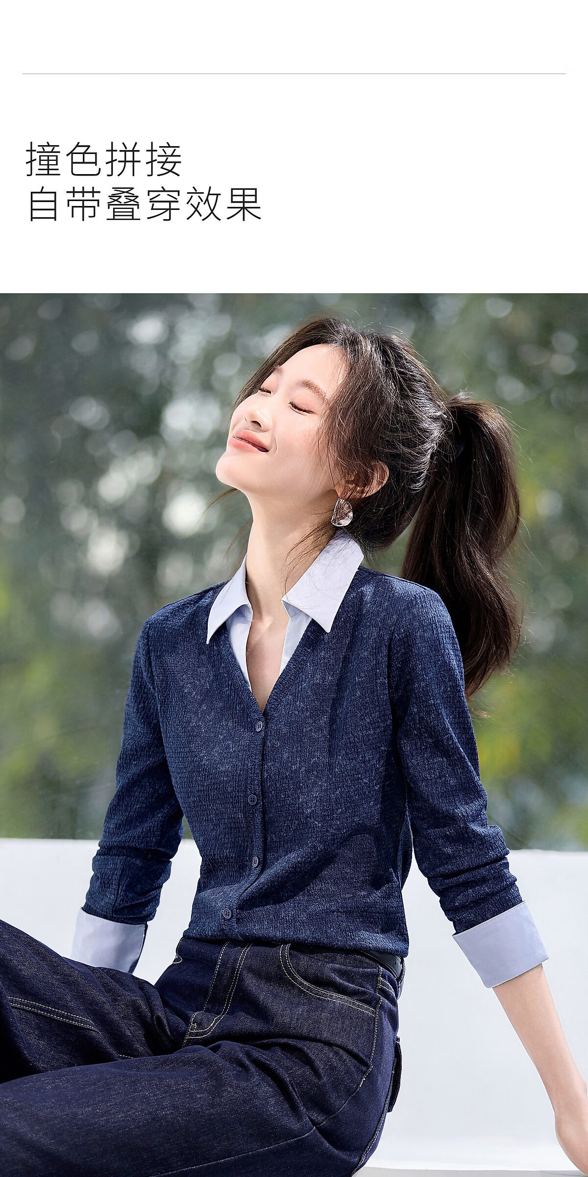 Mohan Yimei Temperament Fashion Top 2026 Spring New V-neck Fake Two-Piece Contrast Color Splicing Slim-fitting Shirt Midnight Blue L