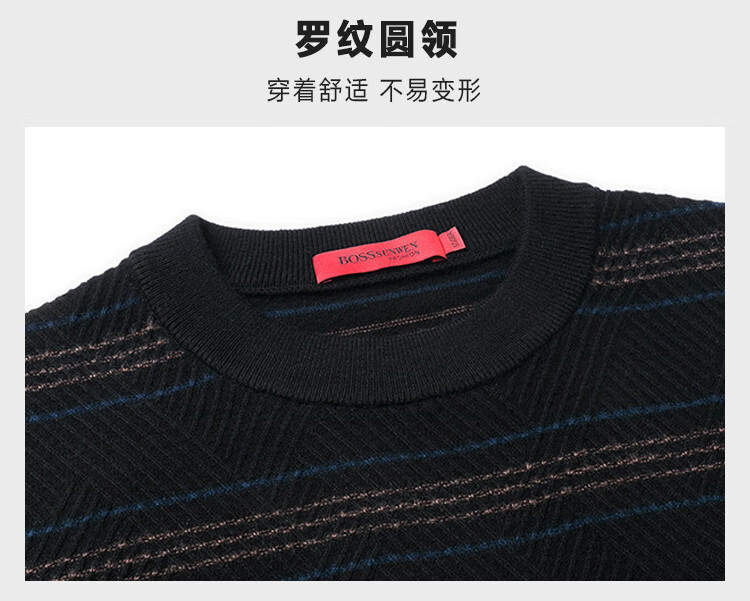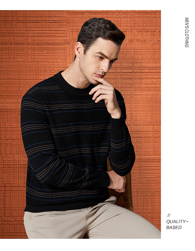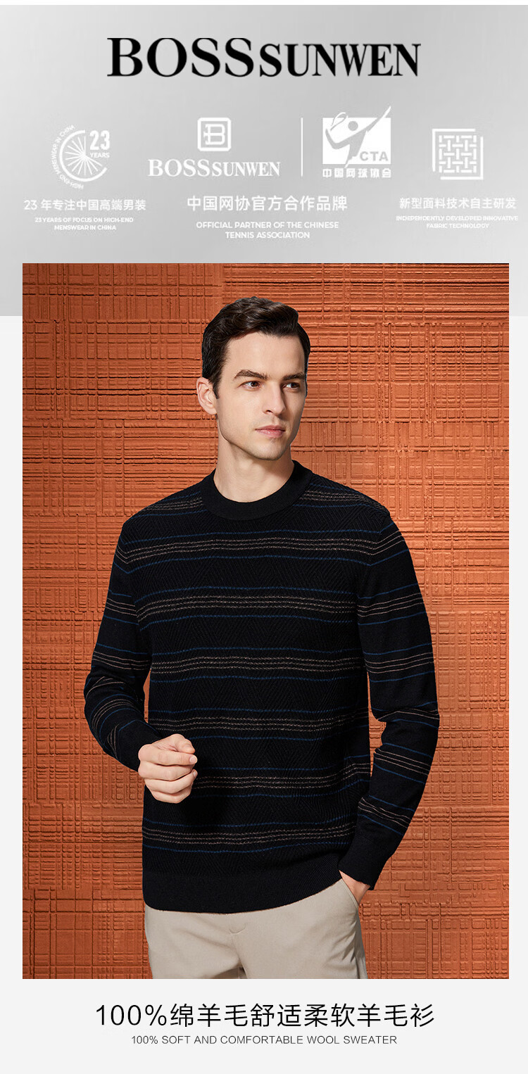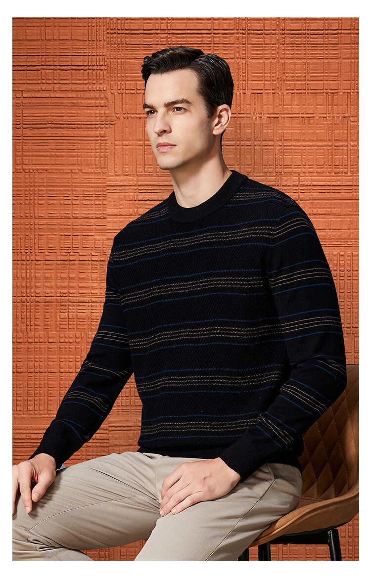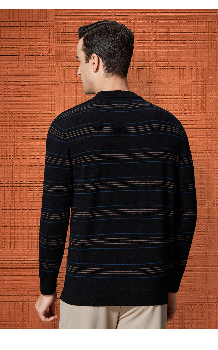 Bosssunwen 100% sheep wool recommended for spring business casual skin-friendly soft contrast striped round neck men's wool sweater black M
