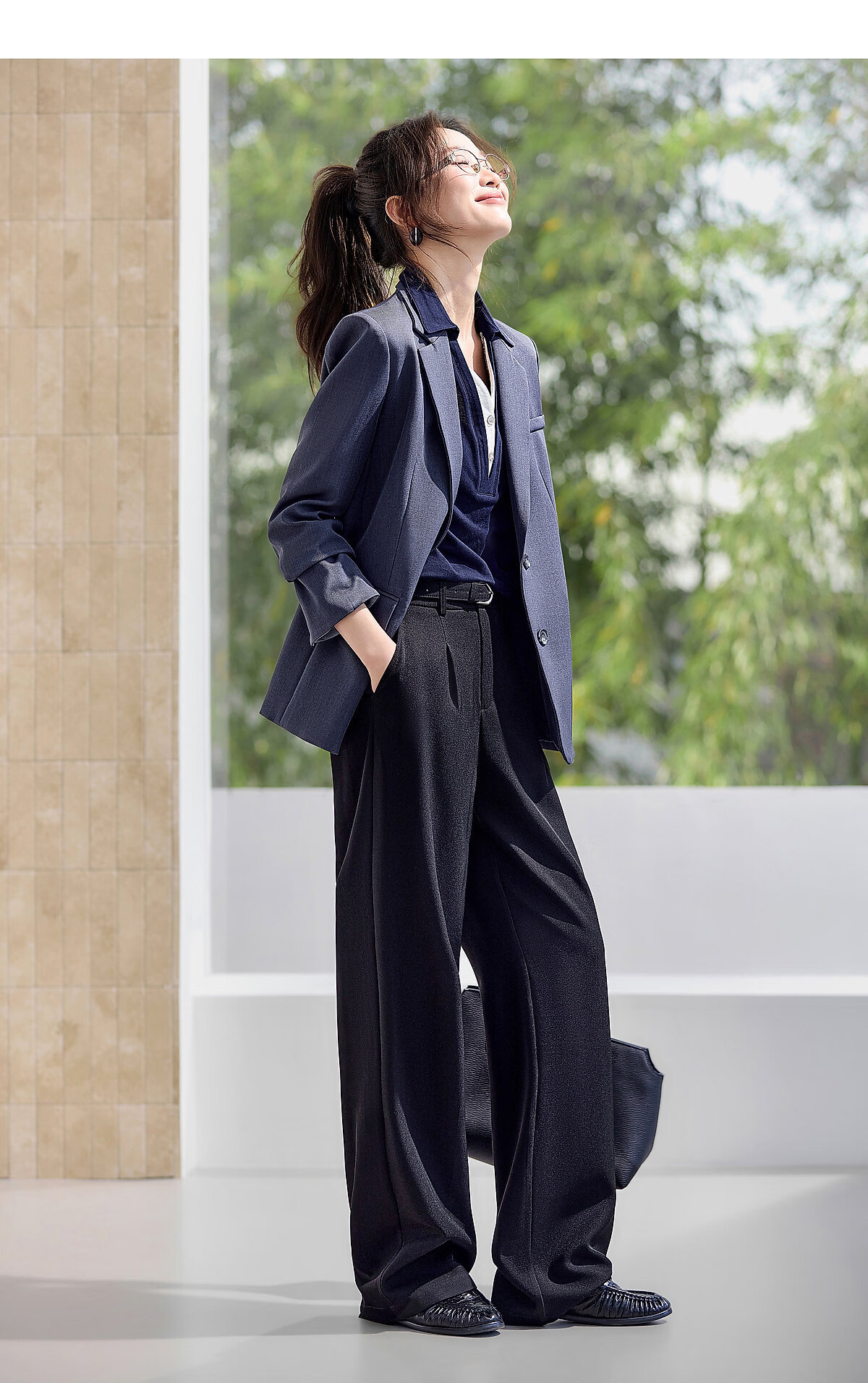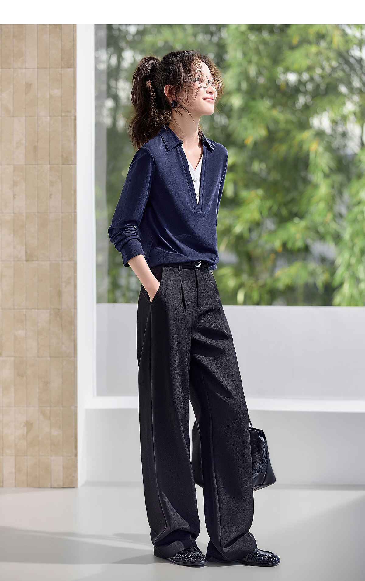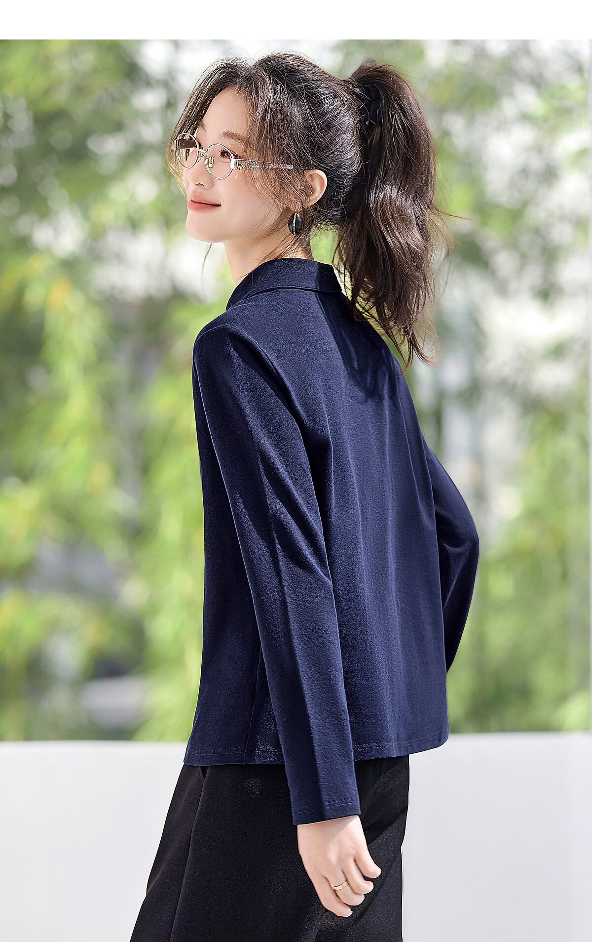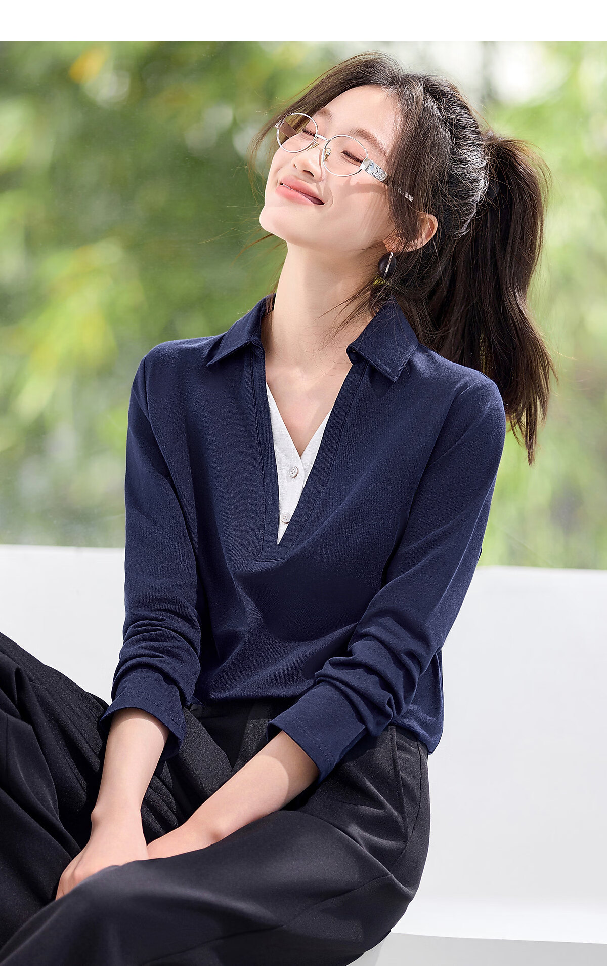 Mohan Yimei Top 2026 Spring New POLO Fake Two-Piece Contrast Color V-Neck Slim Versatile Slim Long-Sleeved Shirt Navy S