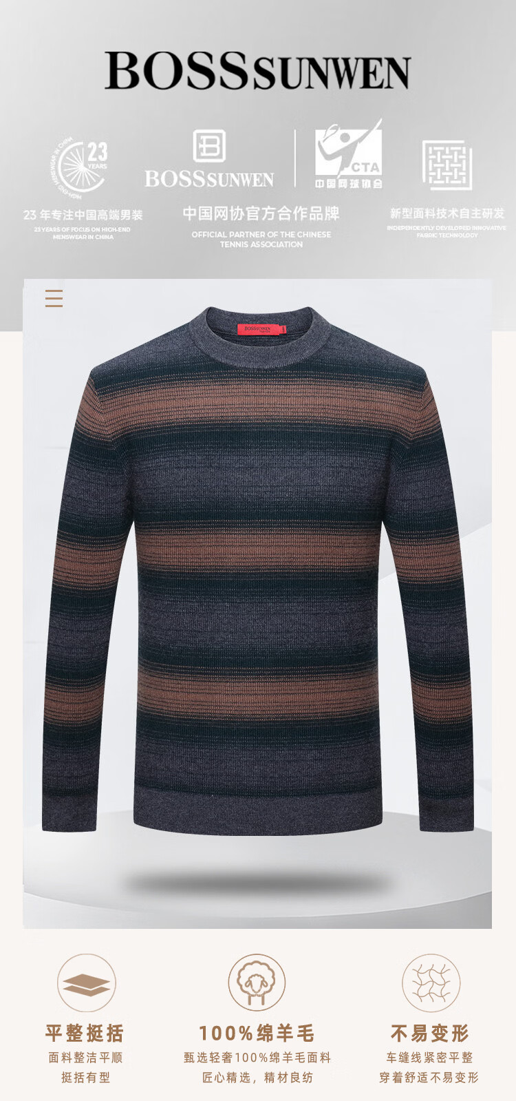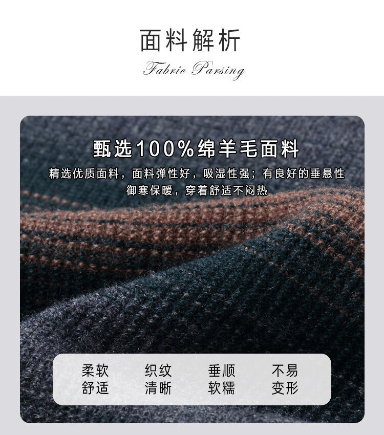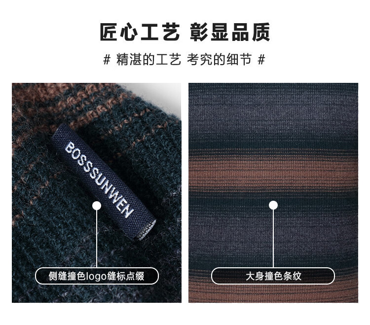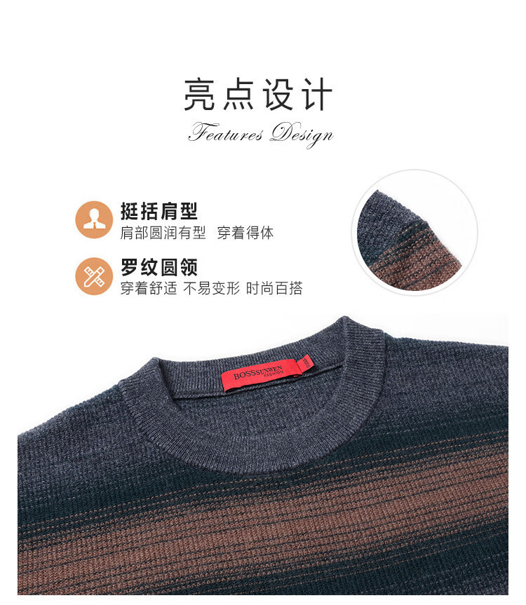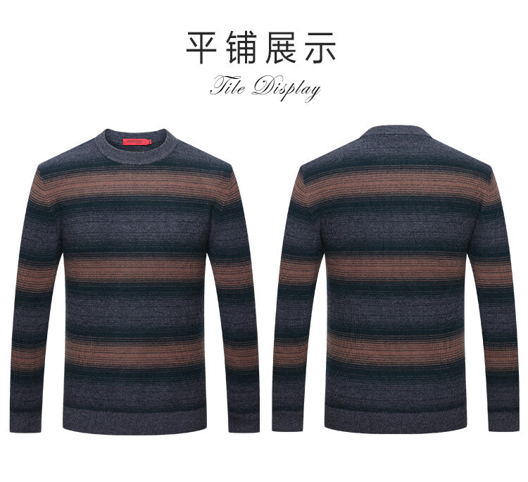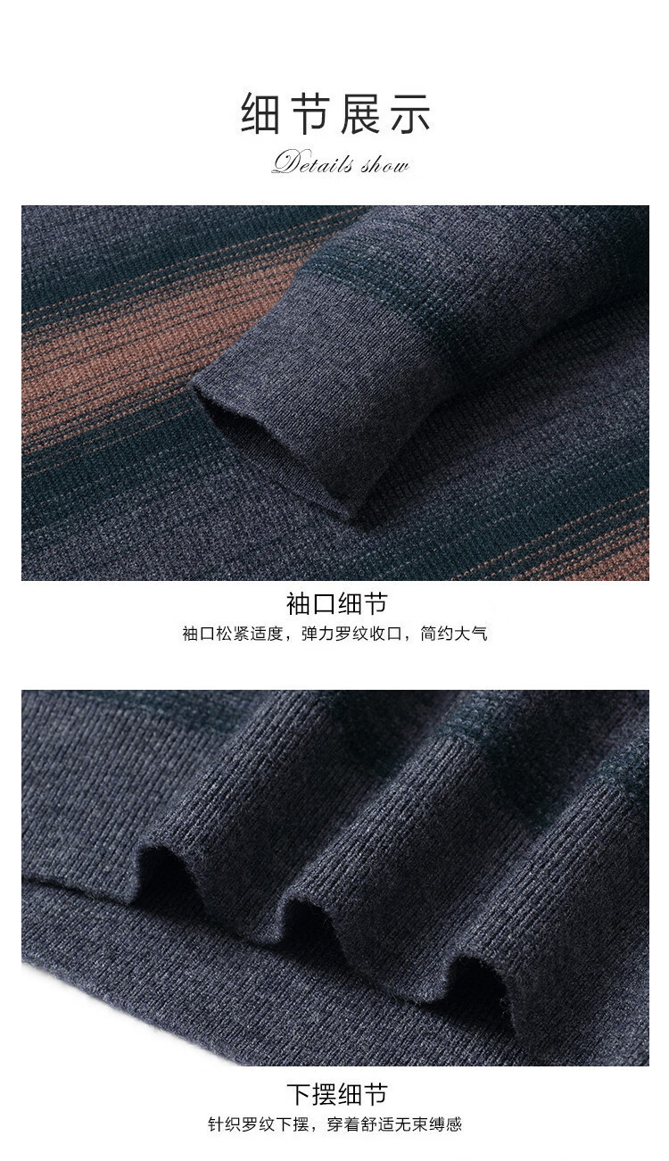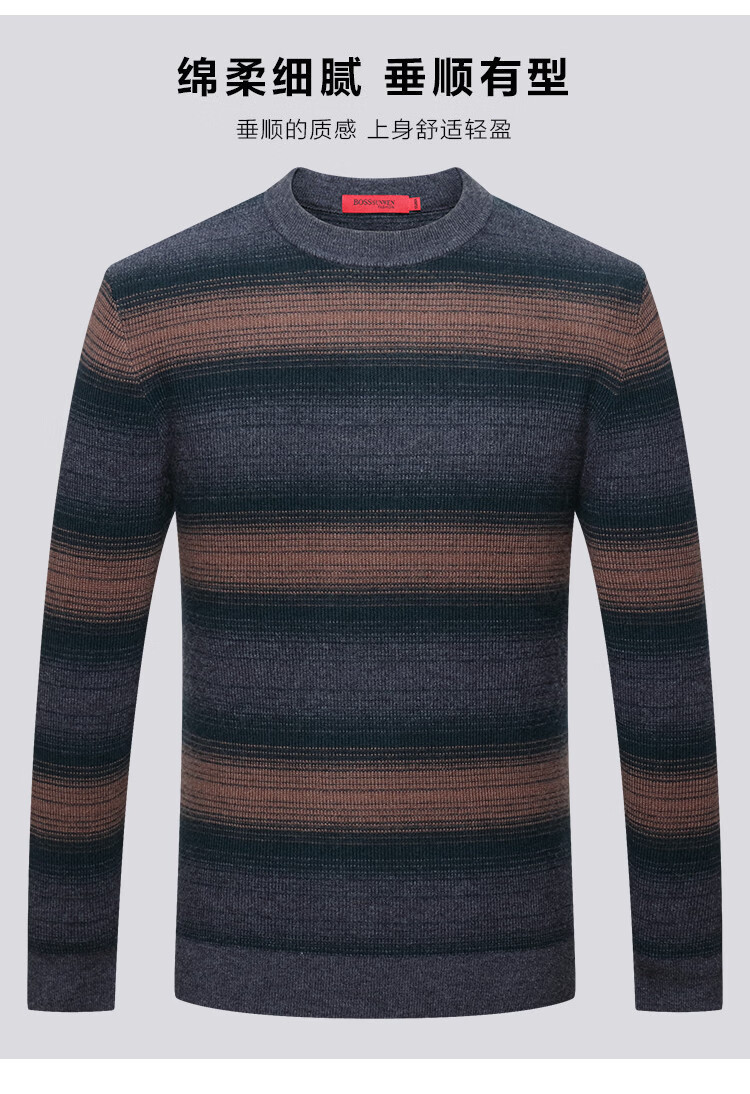 Bosssunwen 100% sheep wool new spring style skin-friendly breathable contrast jacquard men's long-sleeved round neck cardigan gray striped M