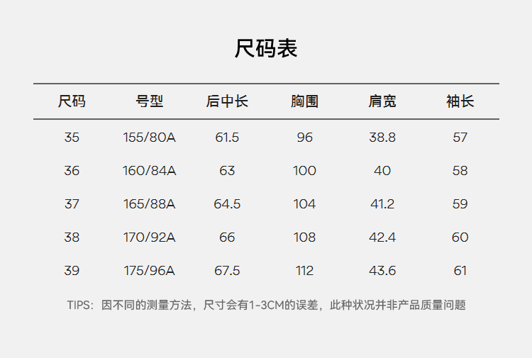 China (cm) 160-165/84-86 165-170 / 88-90 167-172 / 92-96 168-173 / 98-102 170-176 / 106-110