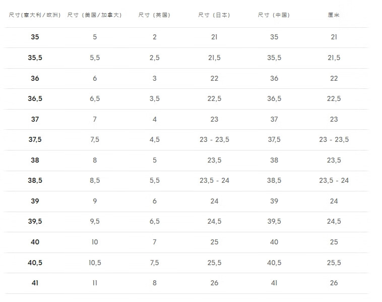 China (cm) 36 - 37 38 - 39 40 - 42 43 - 44 45 - 47