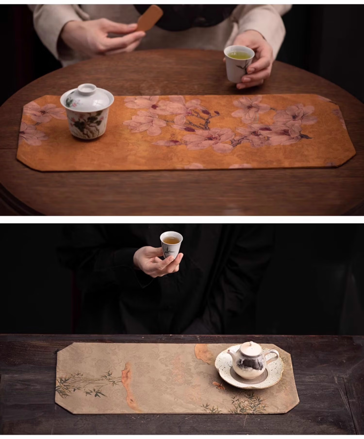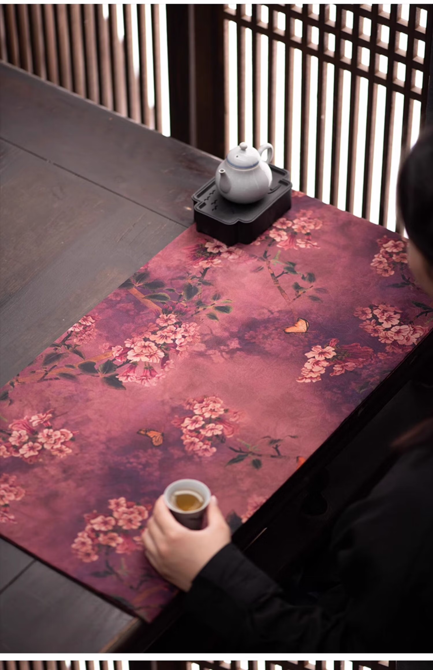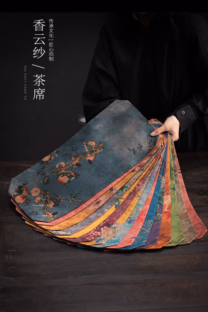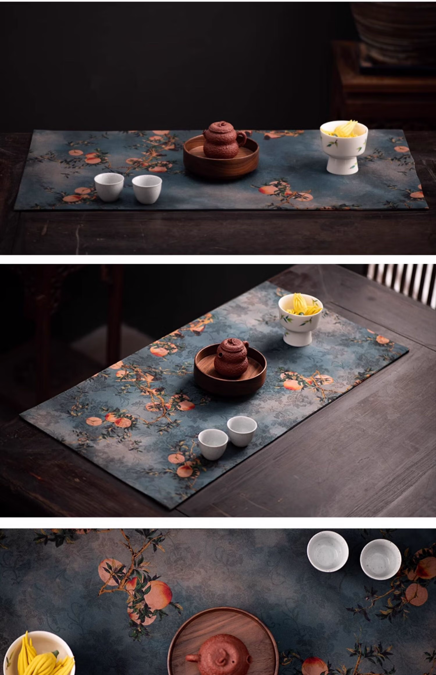 He Jiagong Xiangyun gauze waterproof tea towel tea party tablecloth Zen retro rectangular table runner dry bubble mat Chinese style light luxury Xiangyun gauze flat peach-dark blue (about 50*22cm)