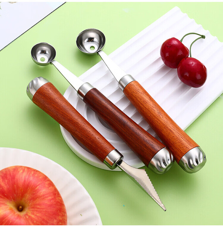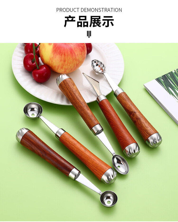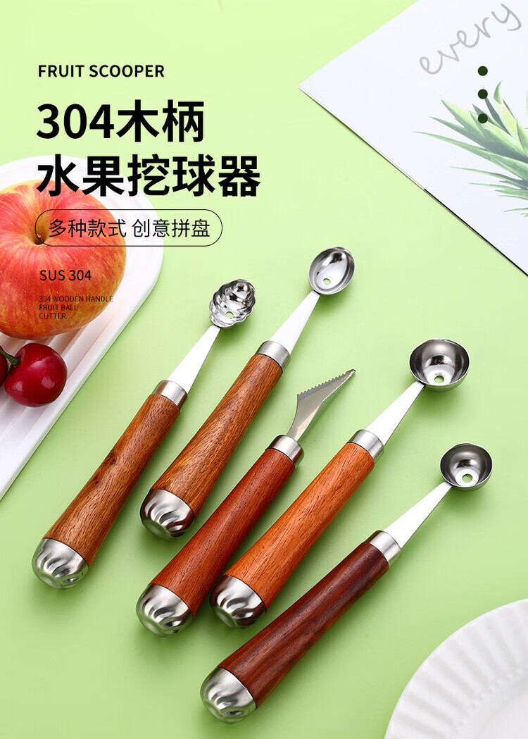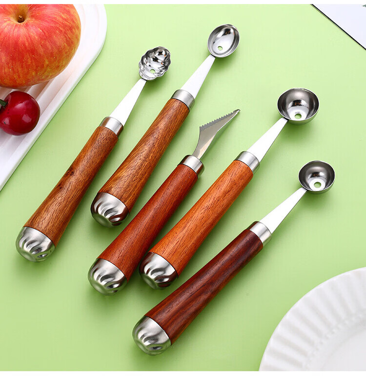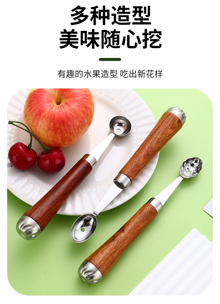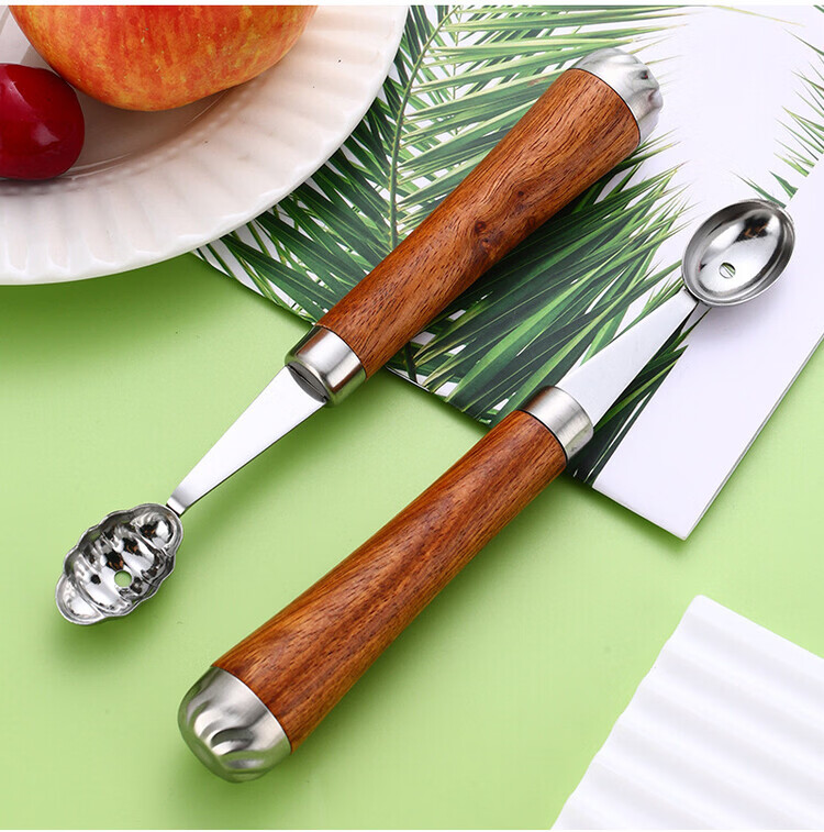Miaopule 304 fruit scooper, solid wood handle carved knife, ice cream scooper, thickened stainless steel fruit plate gadget, small pulp spoon