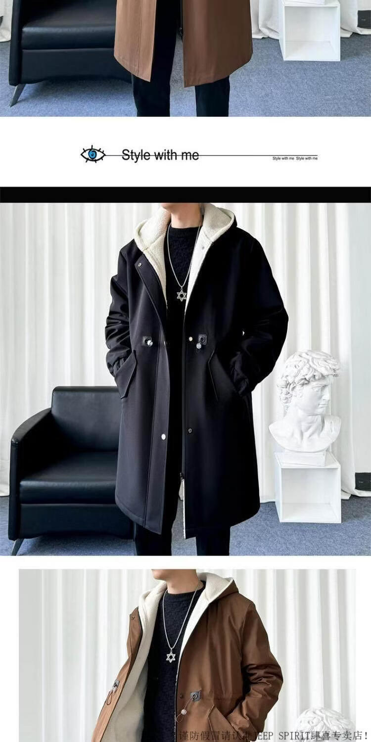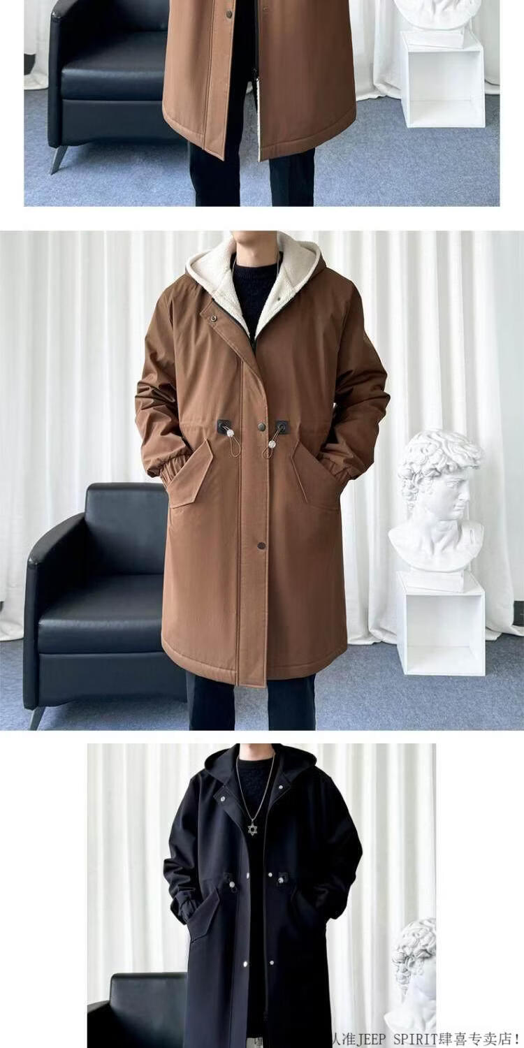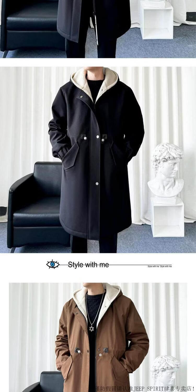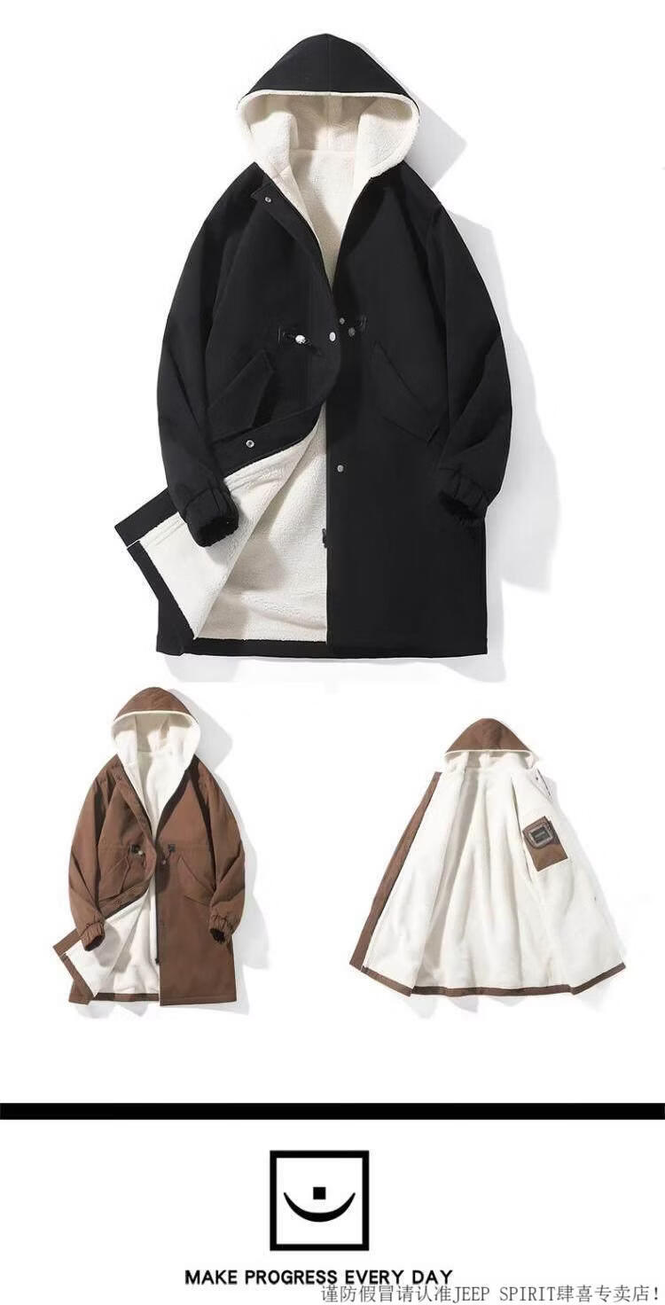 JEEP SPIRIT风衣外套男款士冬秋冬季加绒加厚羊羔毛绒棉衣棉服中长款派克大衣 黑色 常规 M 宽松版型