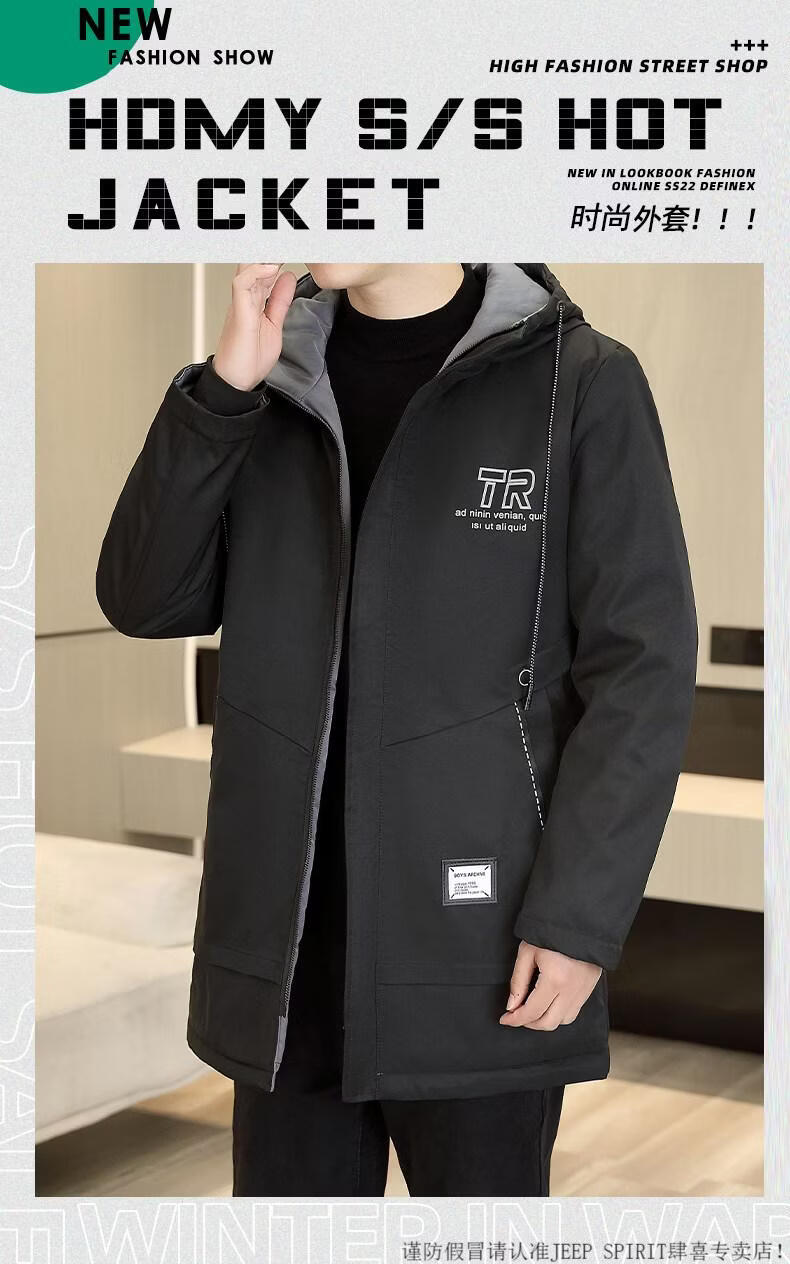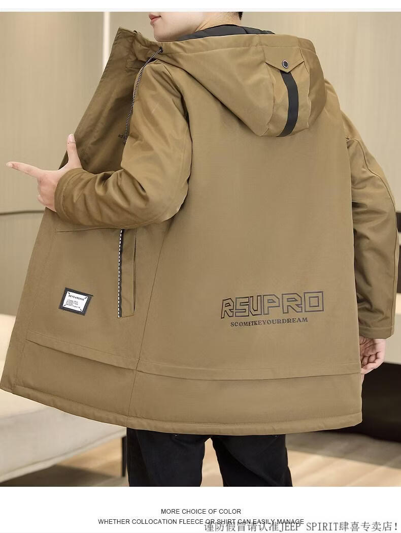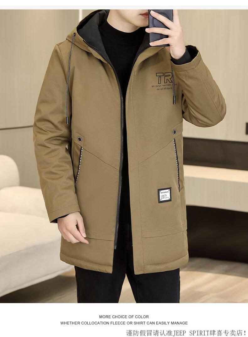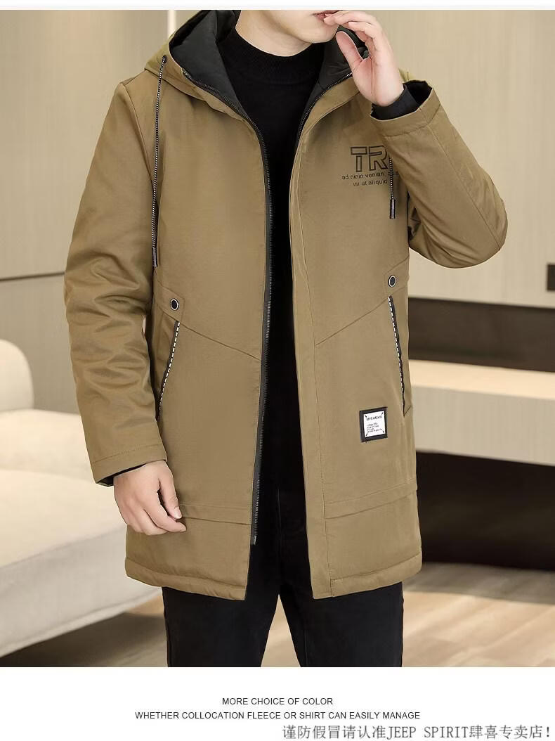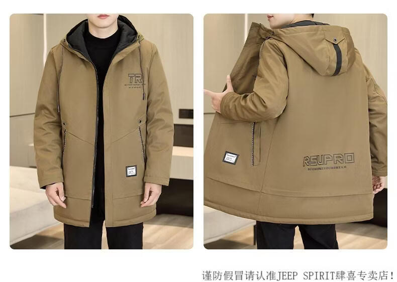 JEEP SPIRIT autumn and winter mid-length windbreaker men's hooded plus velvet thickened parka cotton clothing trendy handsome casual jacket Khaki M