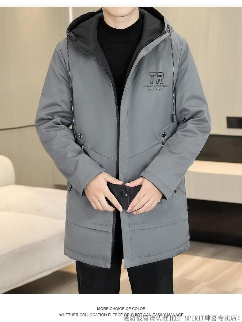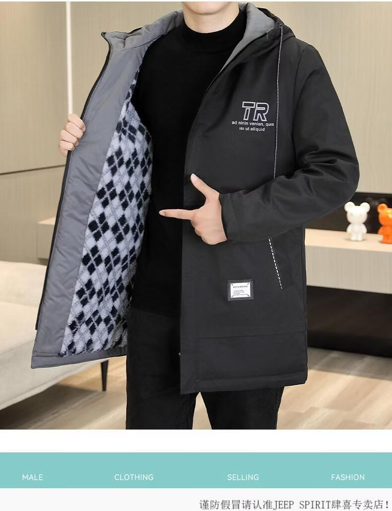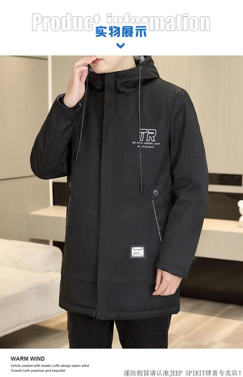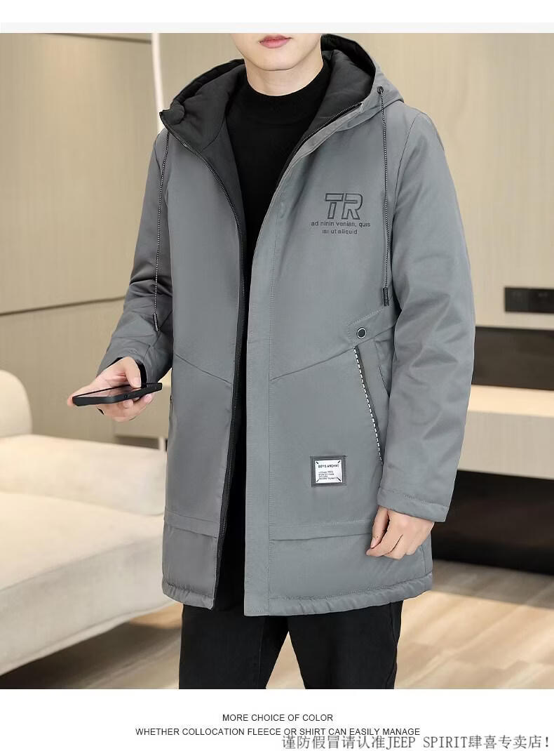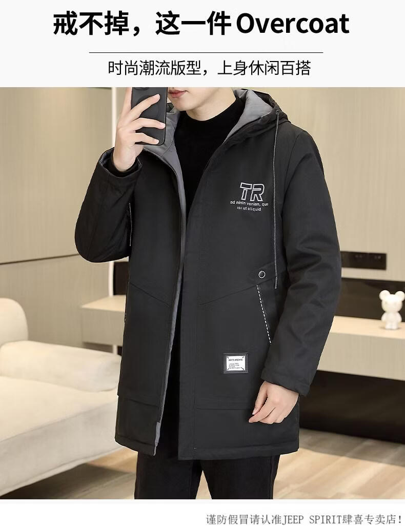 JEEP SPIRIT autumn and winter mid-length windbreaker men's hooded plus velvet thickened parka cotton clothing trendy handsome casual jacket Khaki M