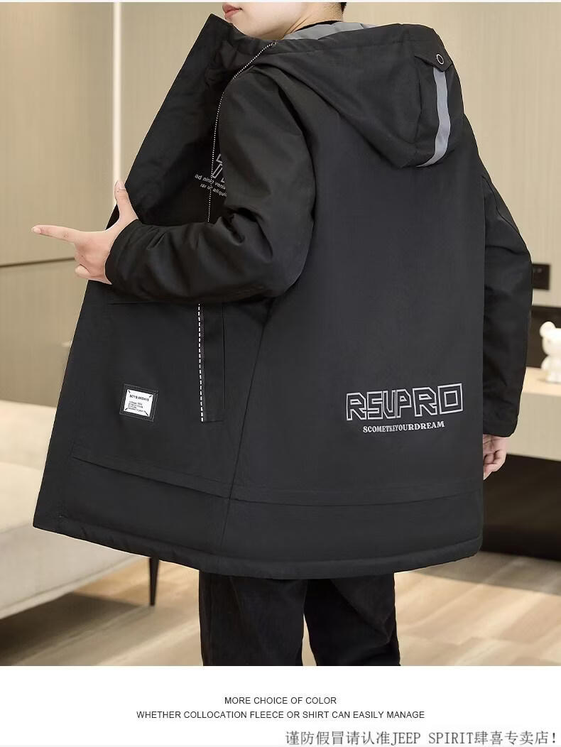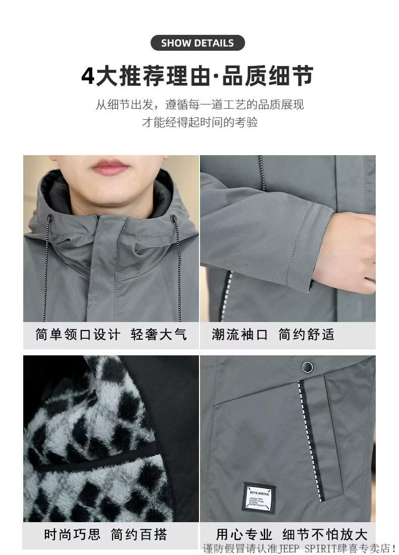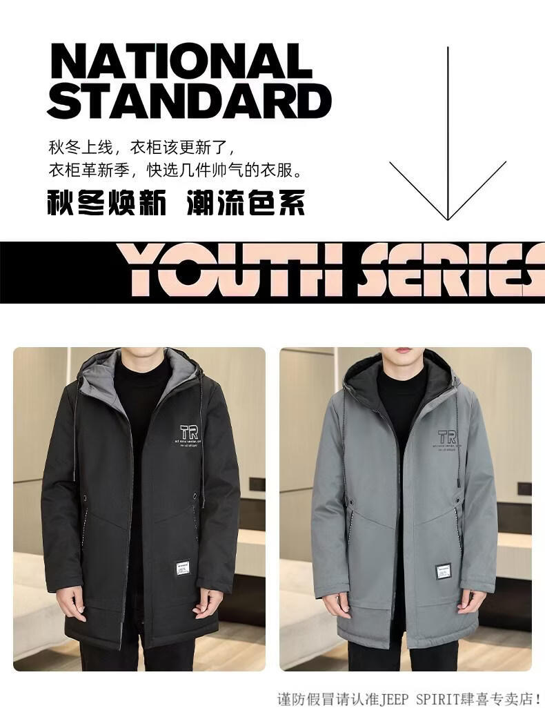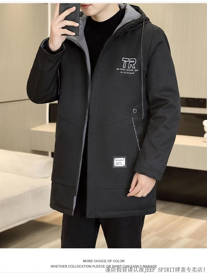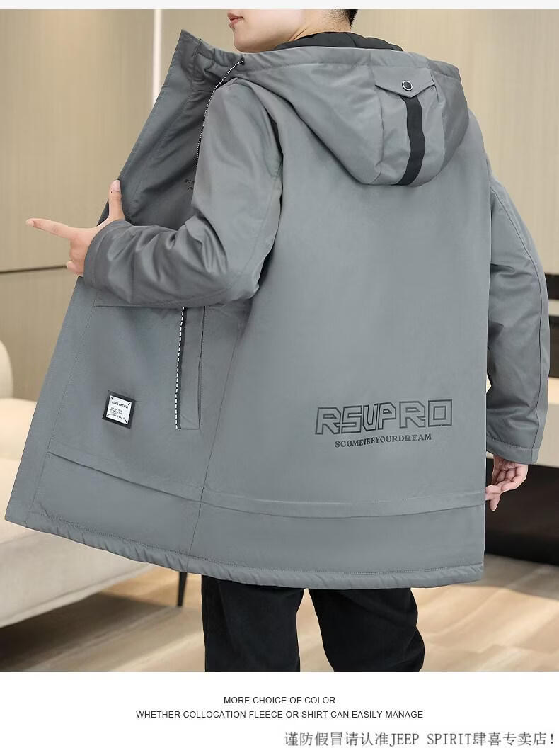 JEEP SPIRIT autumn and winter mid-length windbreaker men's hooded plus velvet thickened parka cotton clothing trendy handsome casual jacket Khaki M