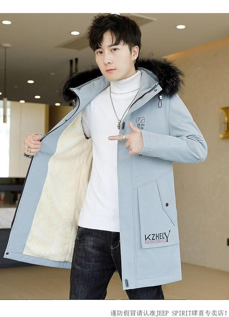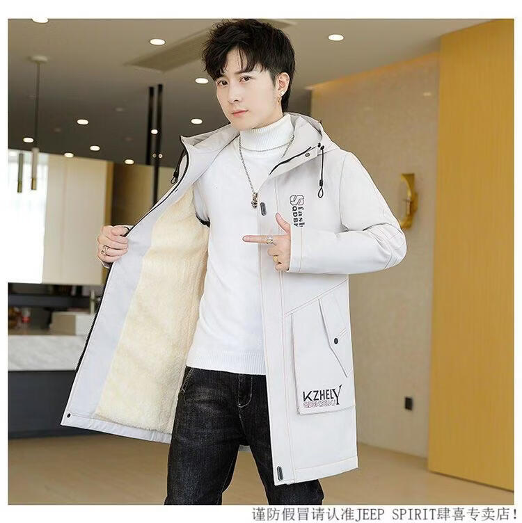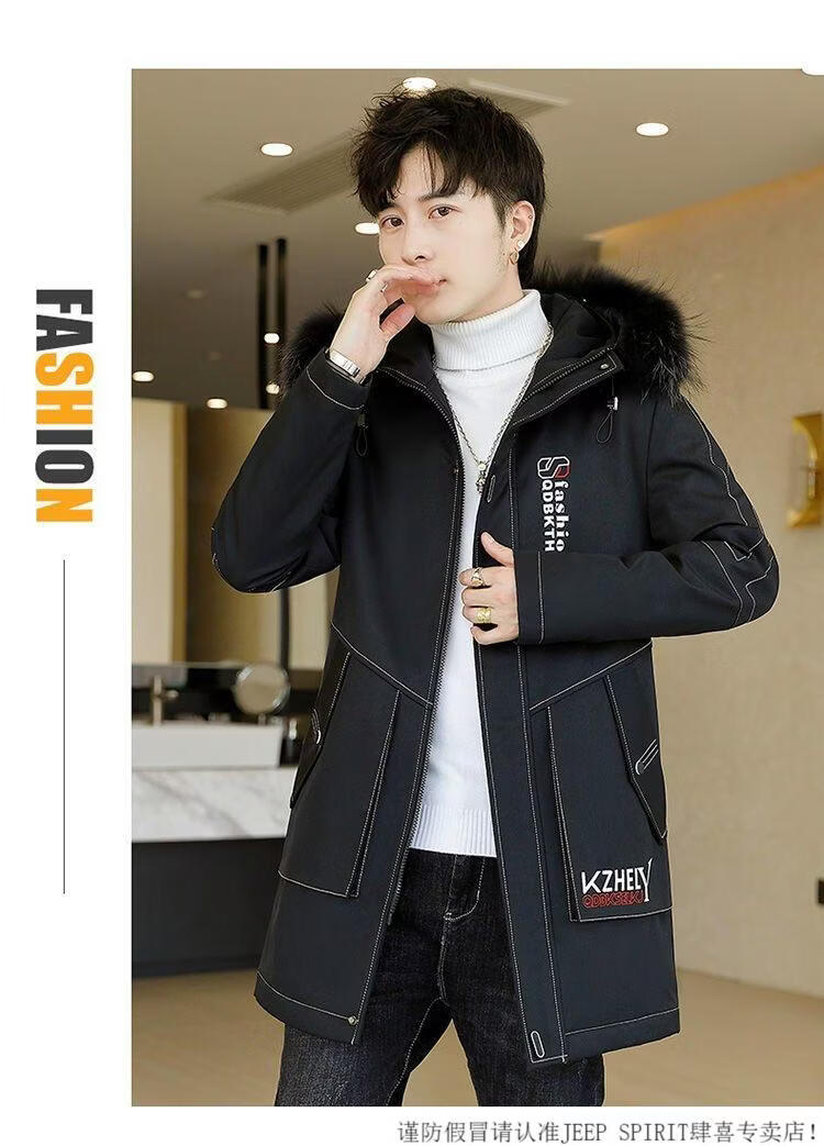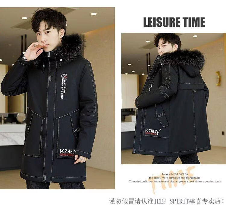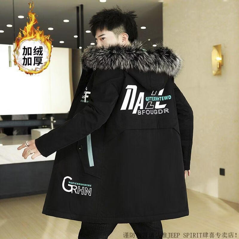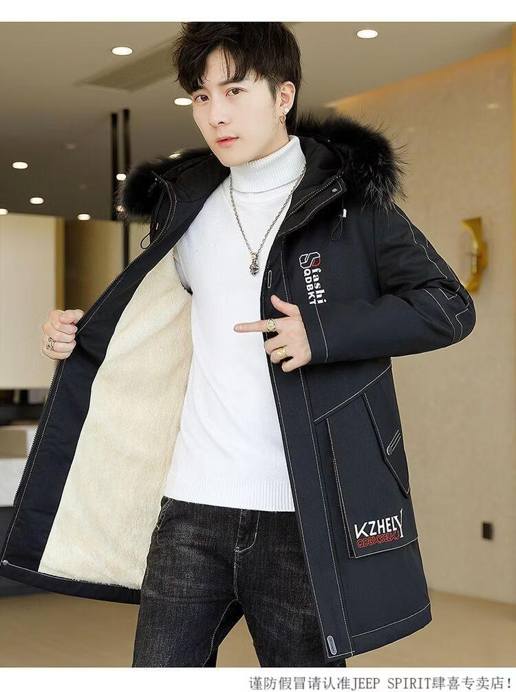 JEEP SPIRIT mid-length windbreaker autumn and winter plus velvet thickened jacket men's simple trendy fashion top winter clothing two-piece set 1/GF plus velvet fur collar-Black M