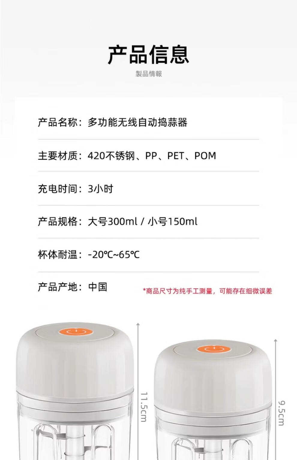 Tuojin imported high-quality garlic artifact from Germany, electric garlic press, household wireless, cordless garlic grinder, minced garlic, small, large, upgraded high-speed motor_large-capacity battery 300ml