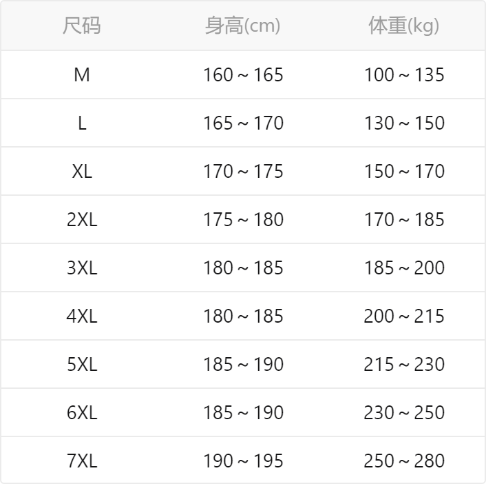 China (cm) 165 / 88-90 170 / 96-98 175 / 108-110 180 / 118-122 185 / 126-130