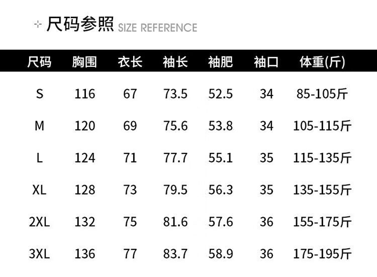 China (cm) 165 / 88-90 170 / 96-98 175 / 108-110 180 / 118-122 185 / 126-130