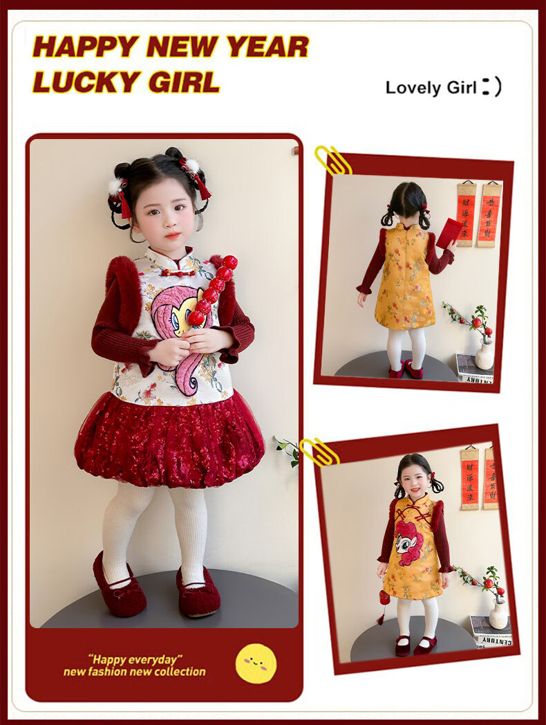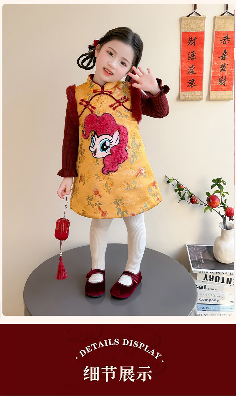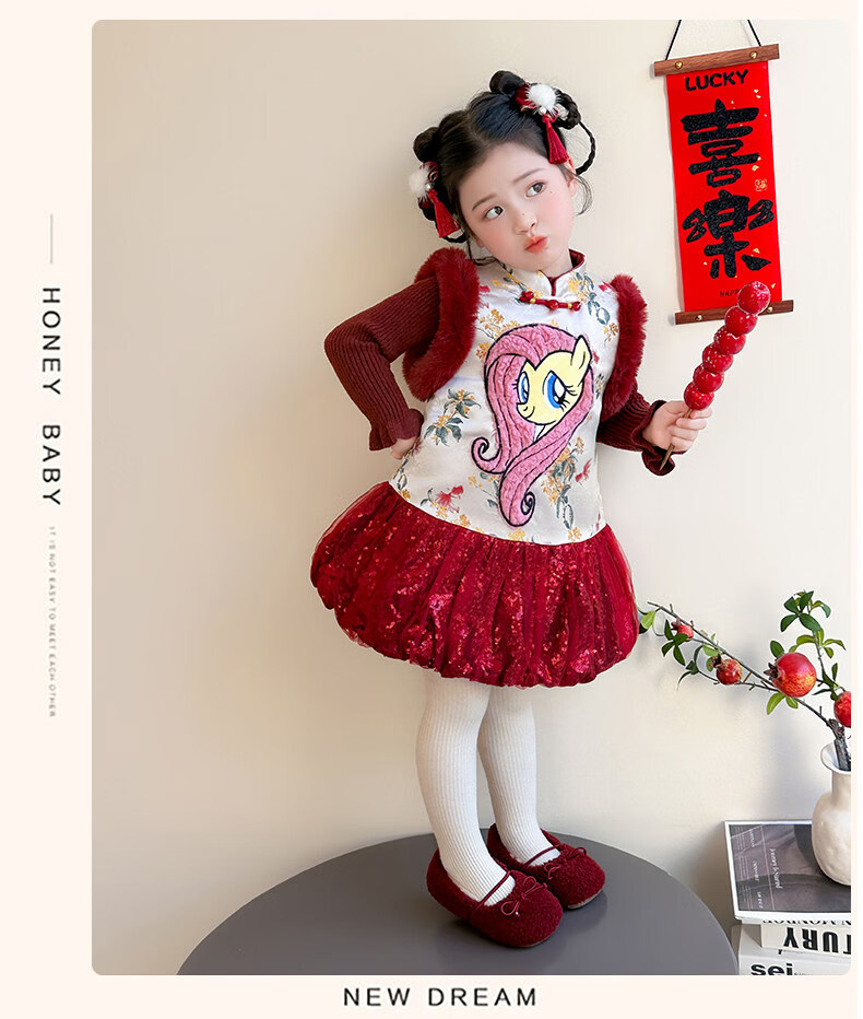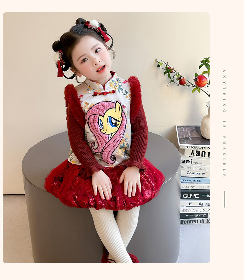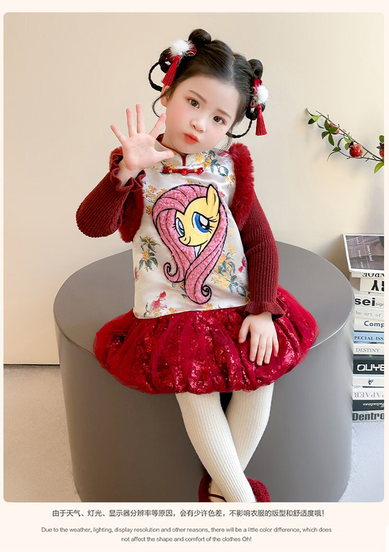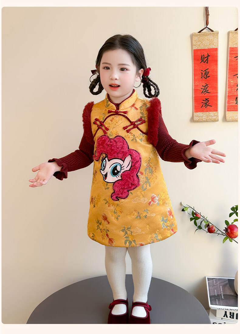 Disney My Little Pony Thickened New Year's Eve Dress Winter 2026 New Girls Red Velvet and Cotton Warm Suit Red Skirt + Inner 140 cm