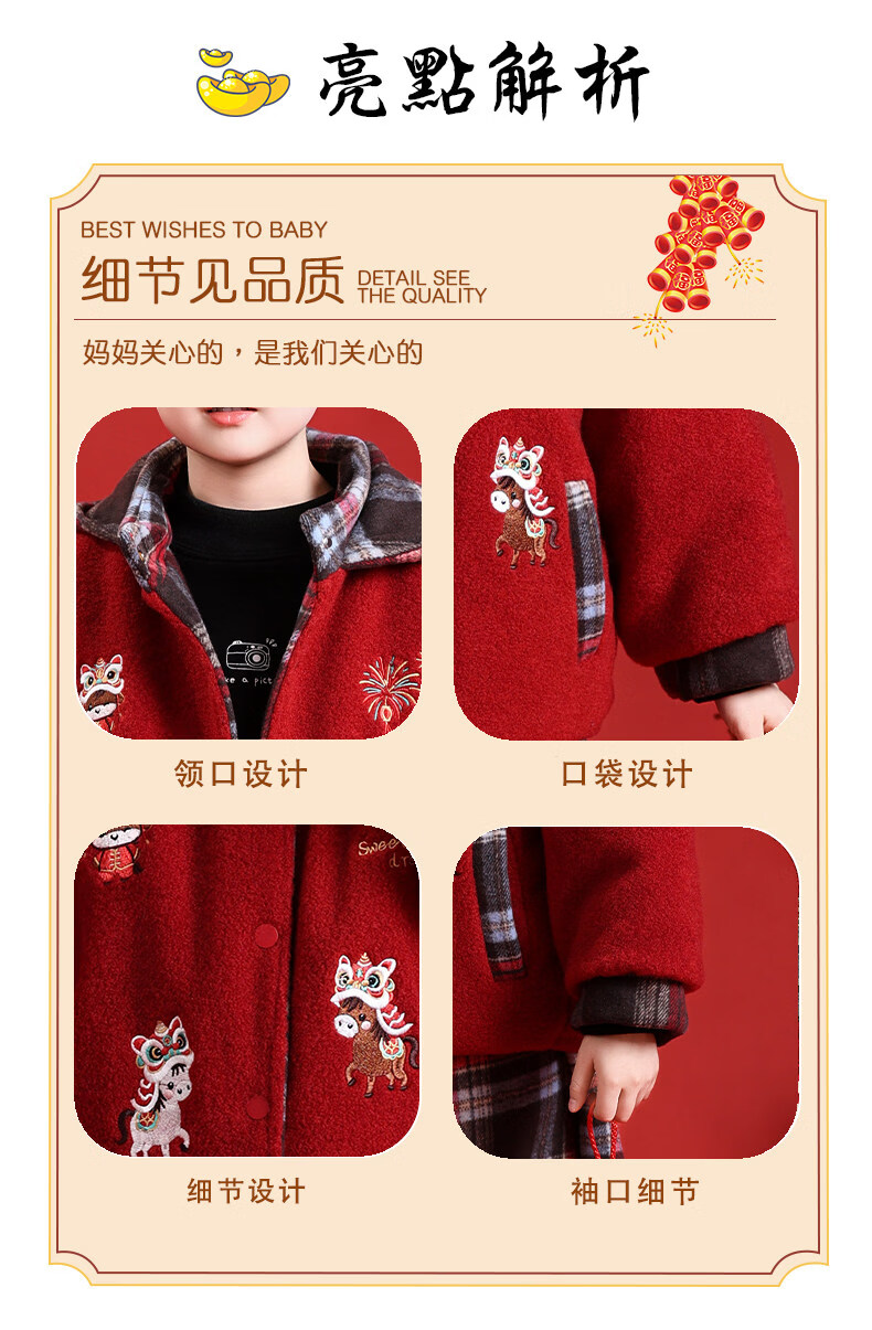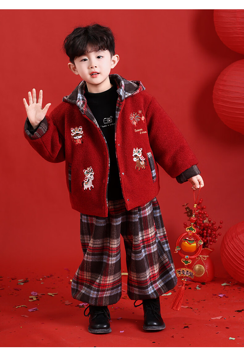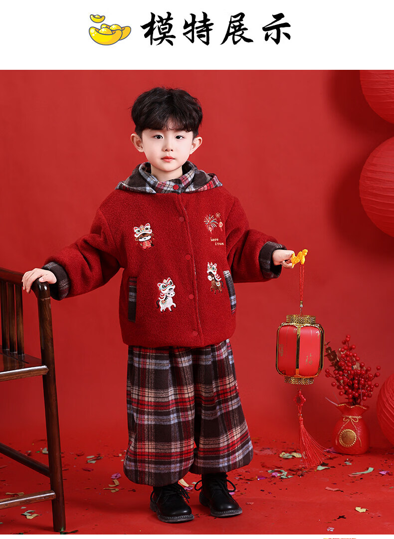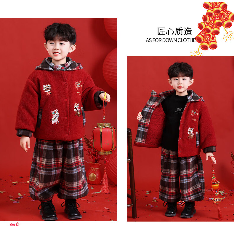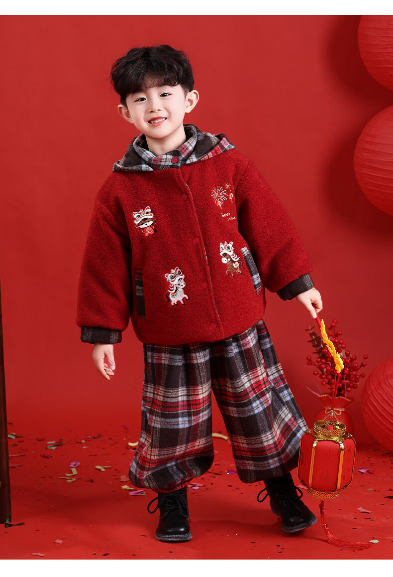 HAL.DUCK New Year's greetings boys' winter thickened cotton suit children's 2026 Year of the Horse red festive boy's winter jacket red 130 cm