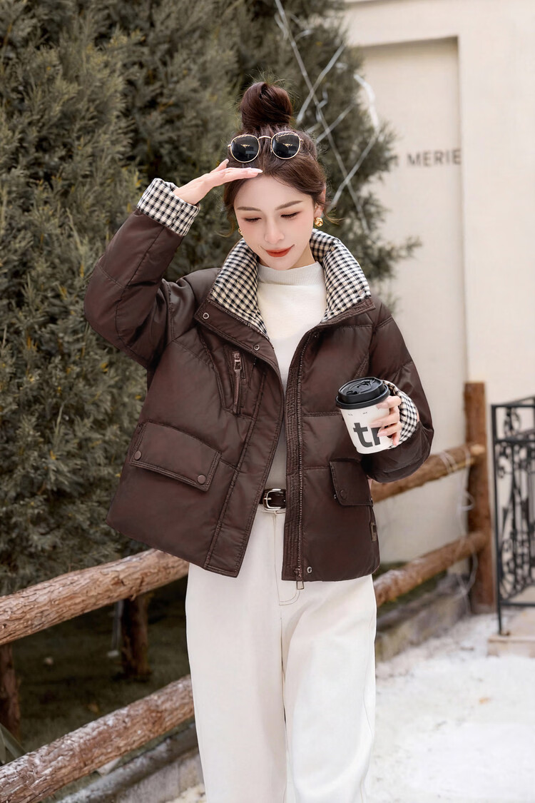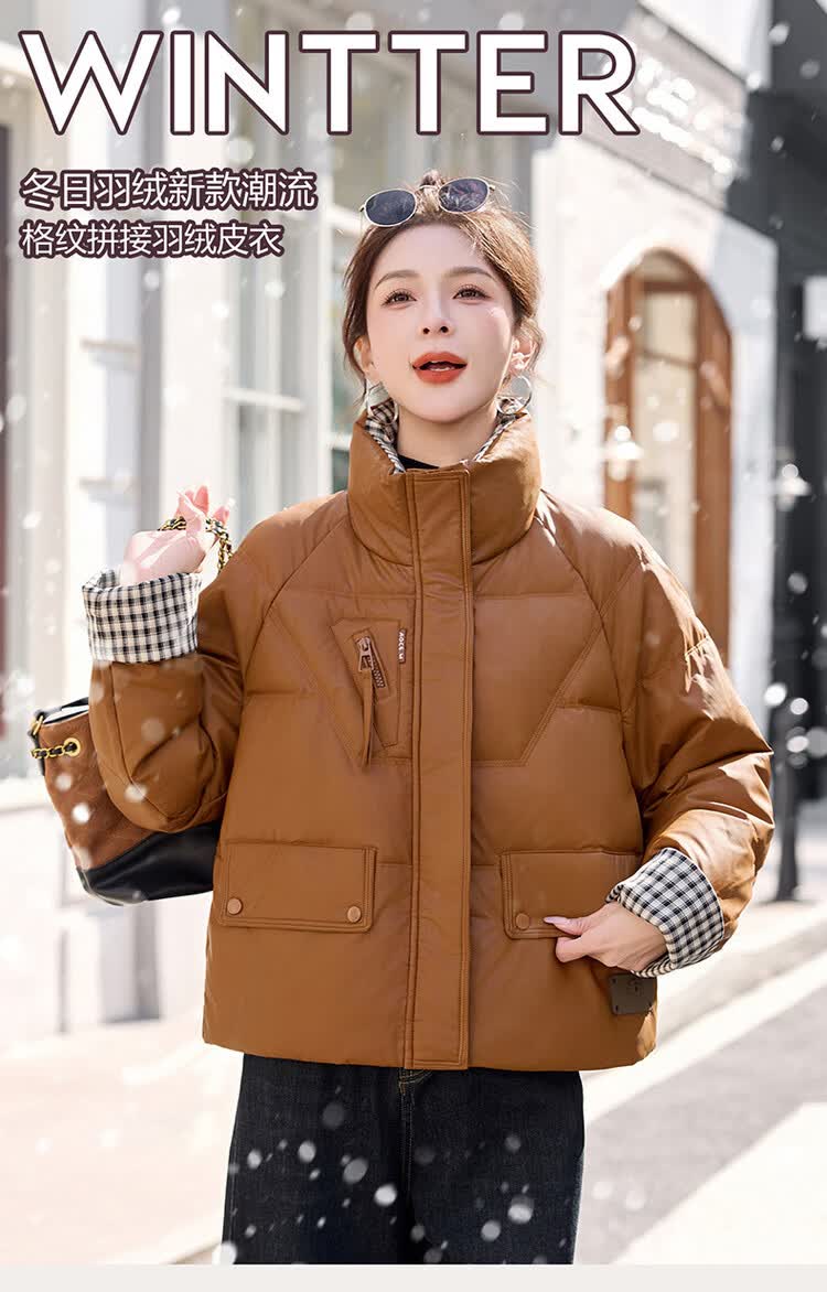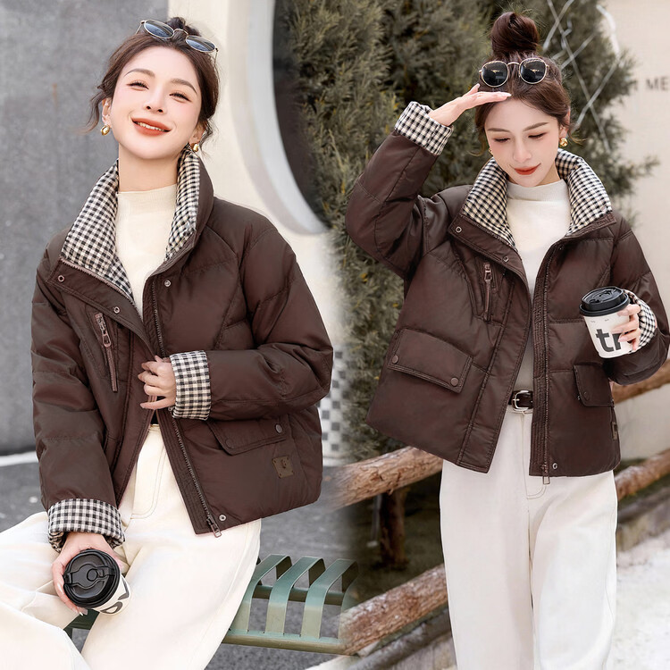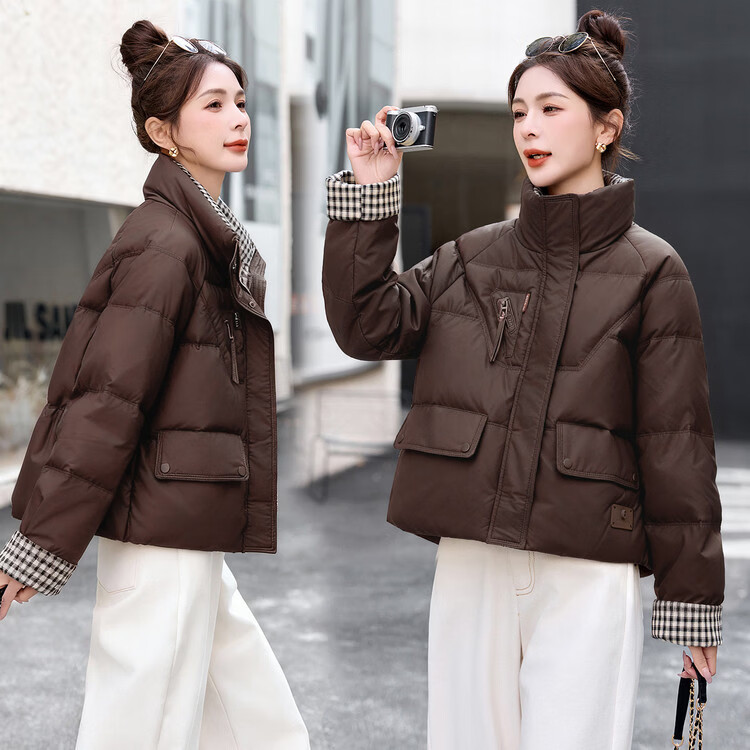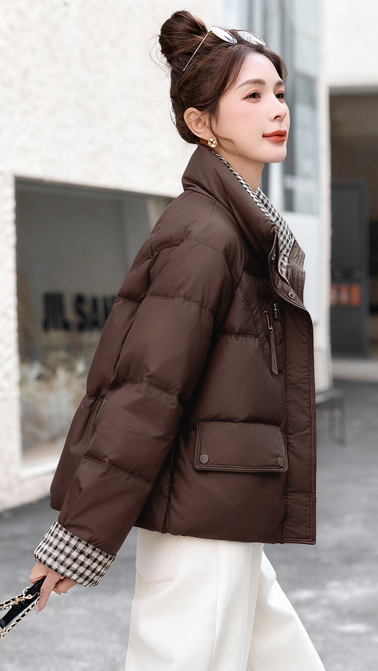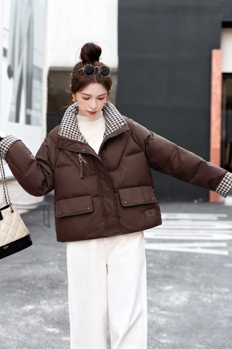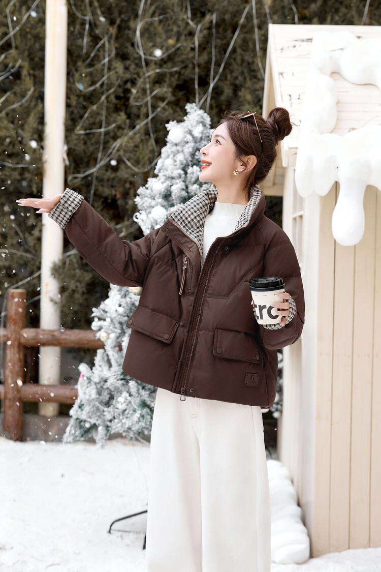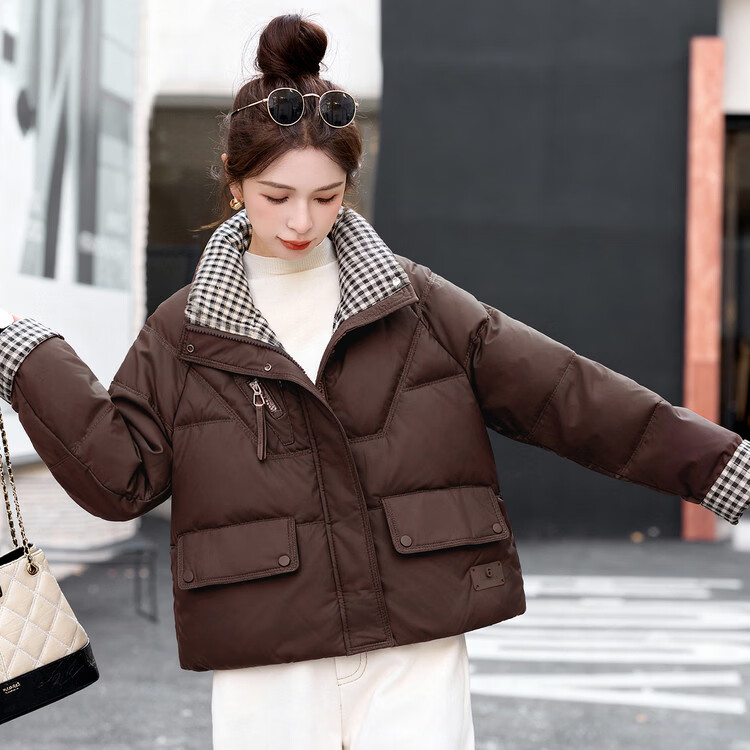 Hengyuanxiang Plaid Splicing Stand Collar Down Jacket Women's Short 2026 Winter New Style Small Thickened Warm White Duck Down Jacket Brown M