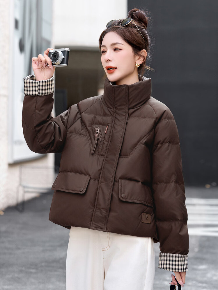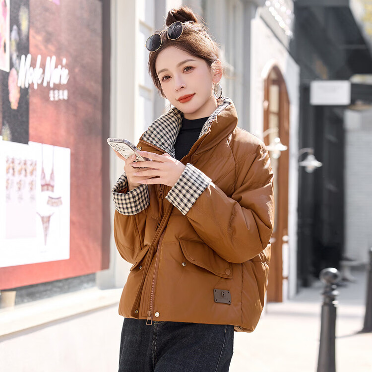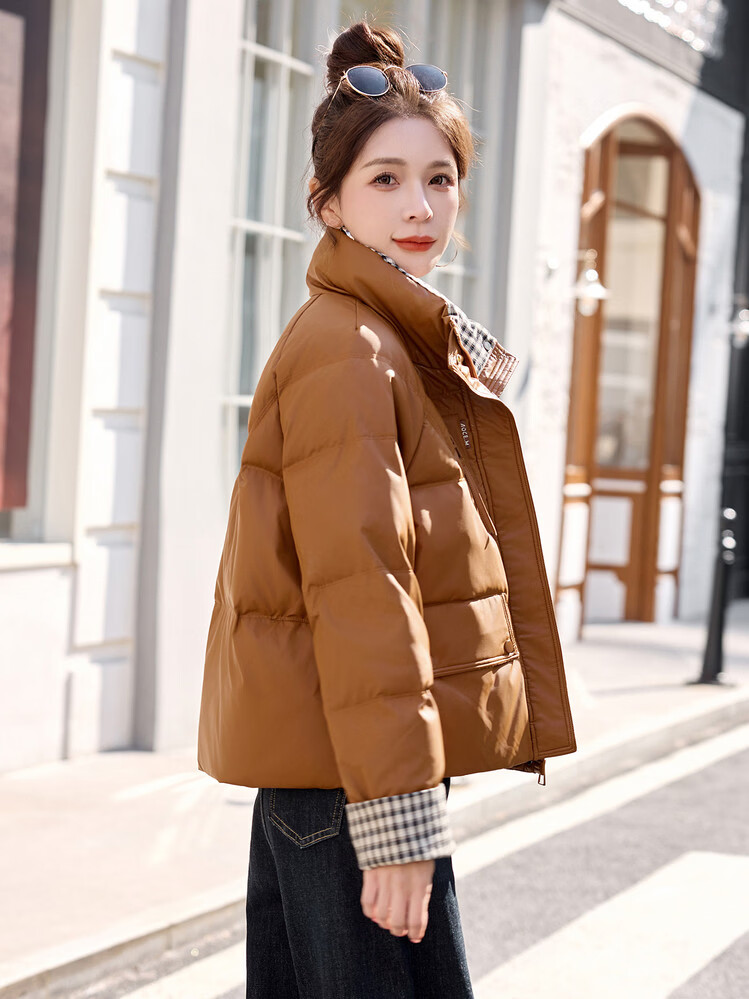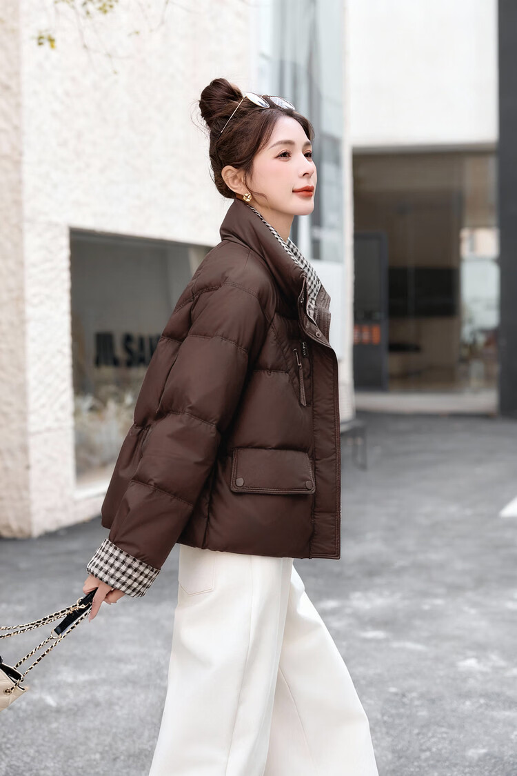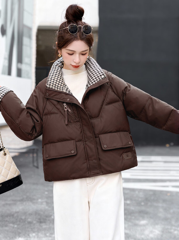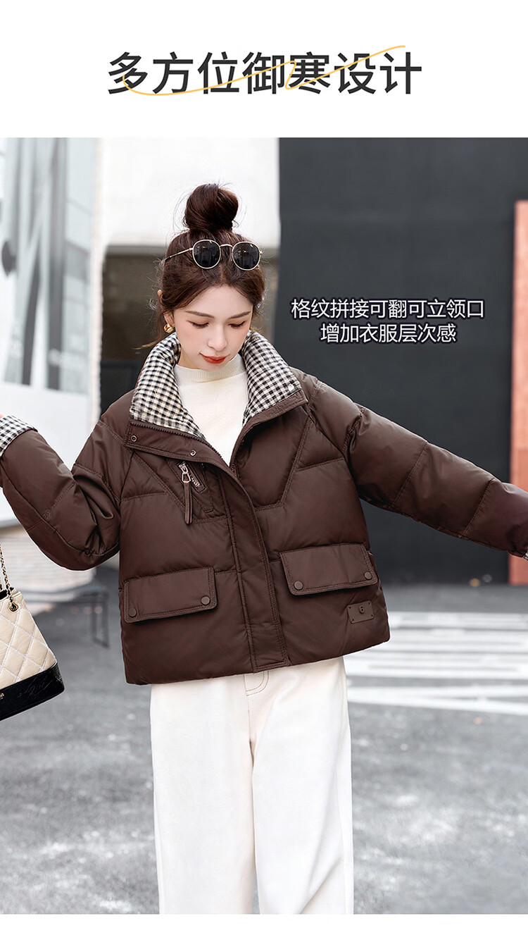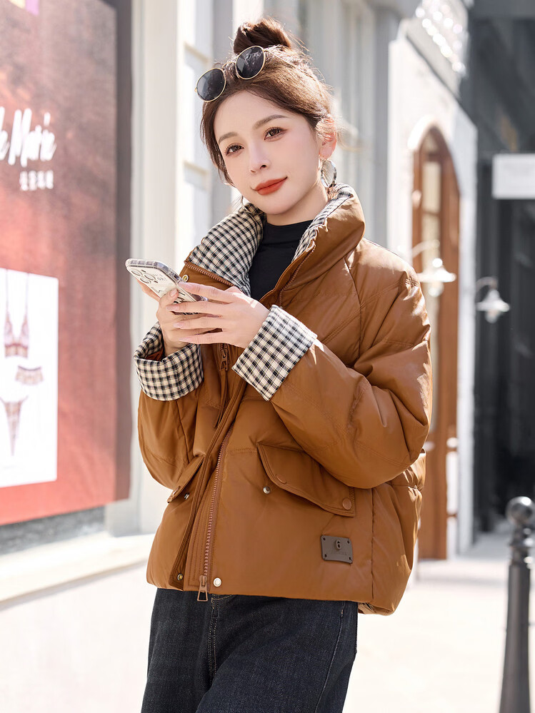 Hengyuanxiang Plaid Splicing Stand Collar Down Jacket Women's Short 2026 Winter New Style Small Thickened Warm White Duck Down Jacket Brown M