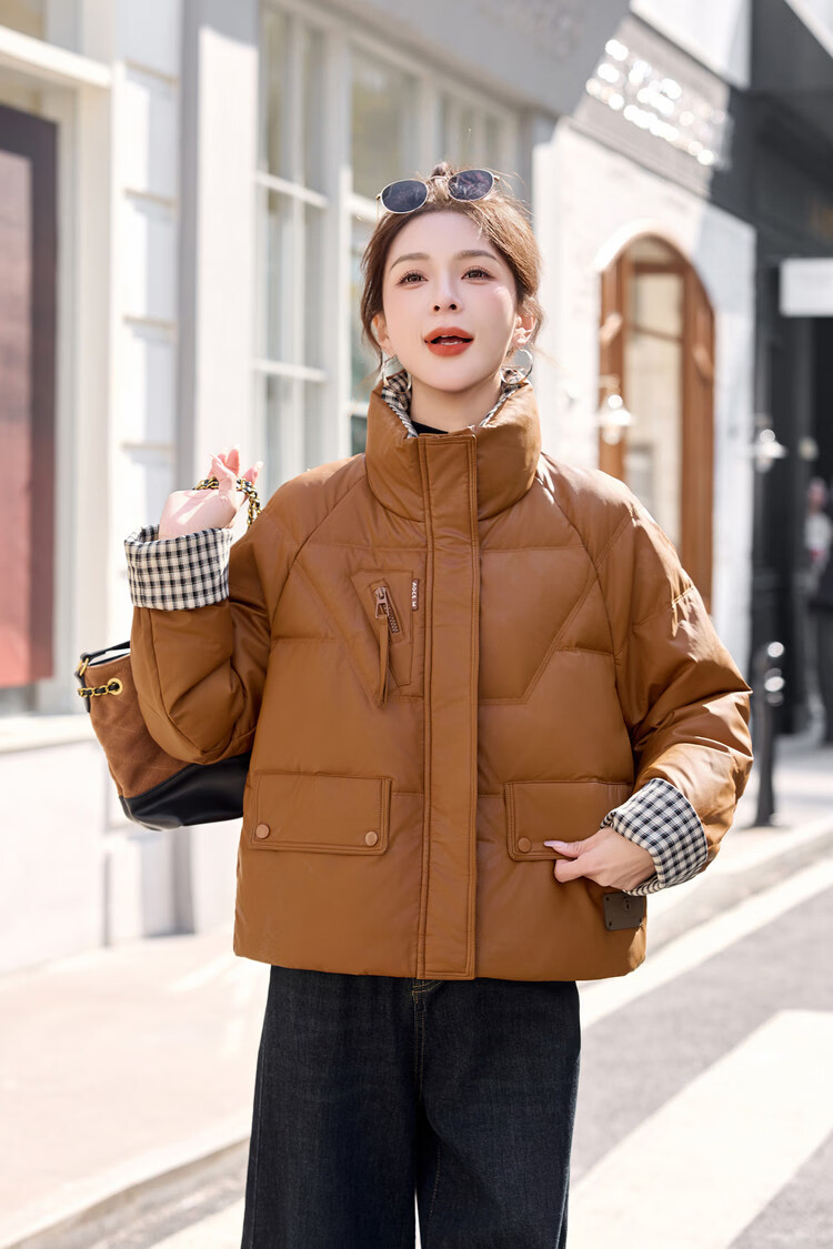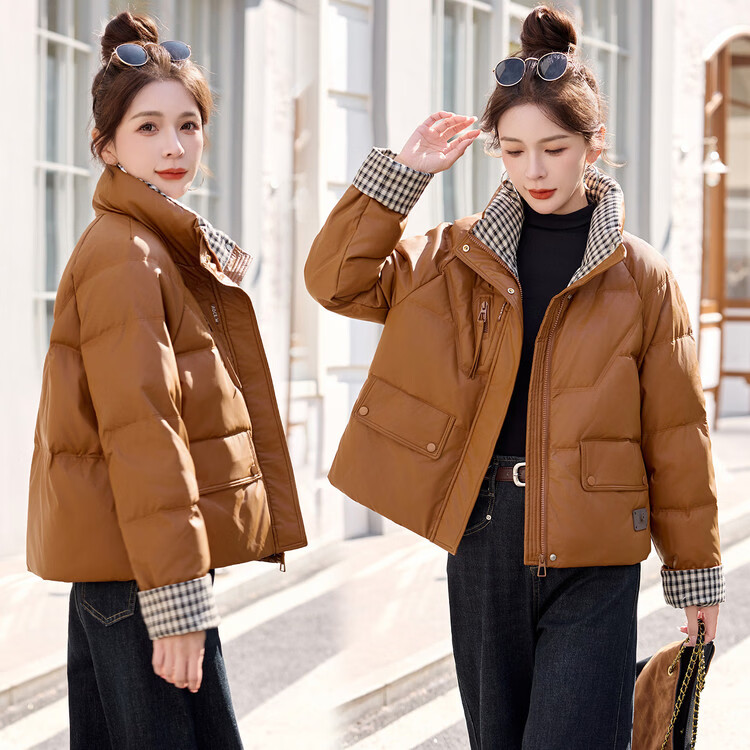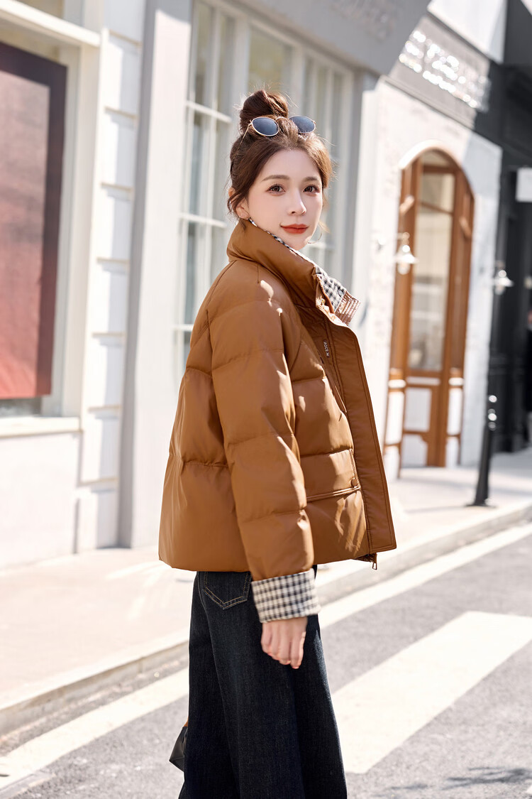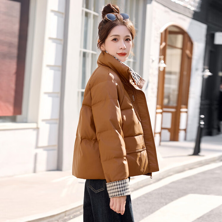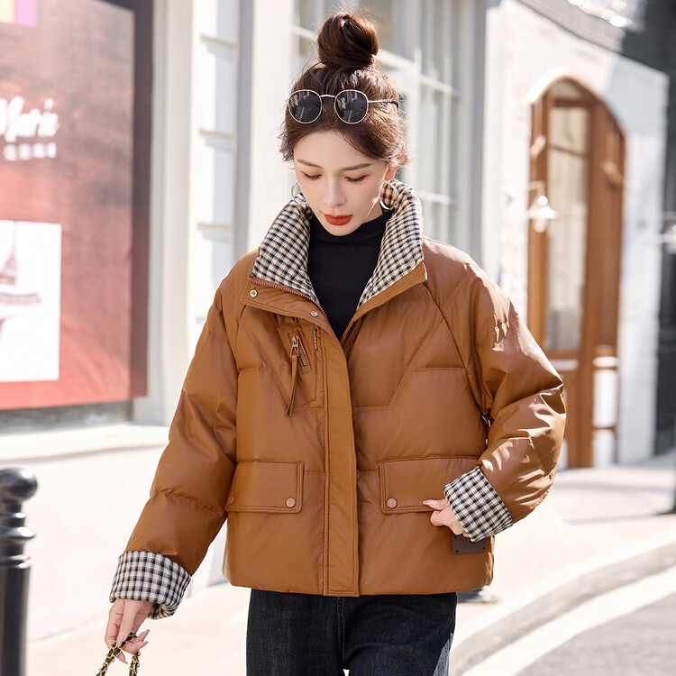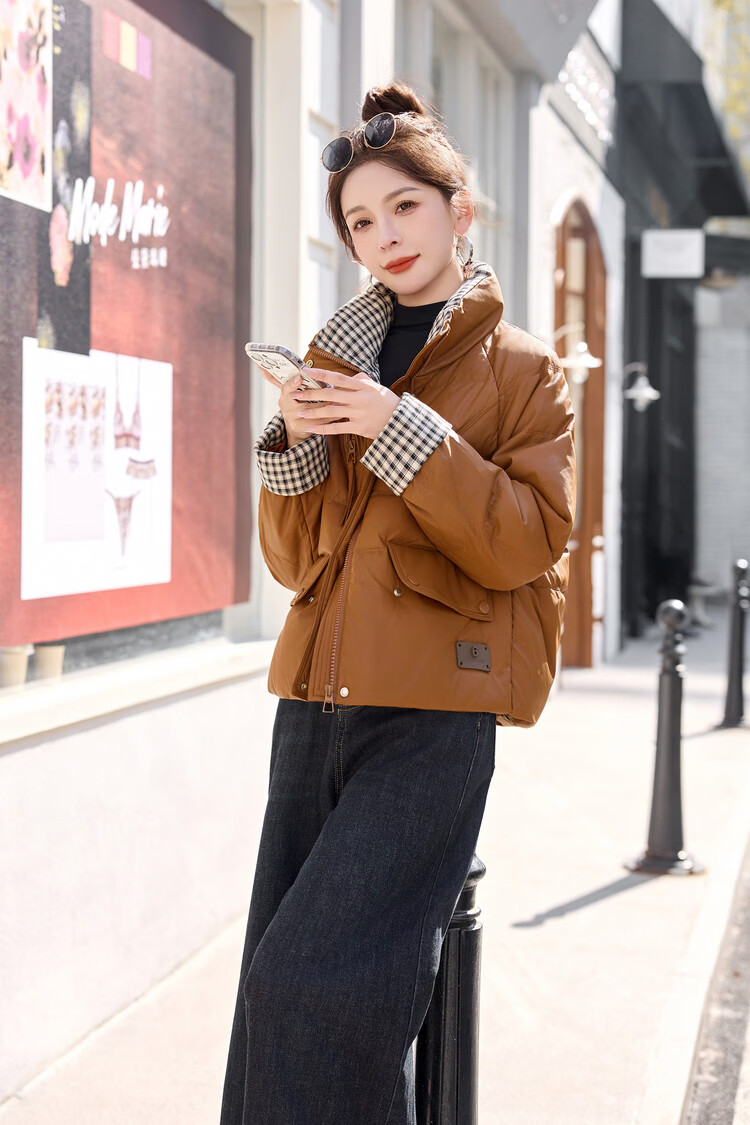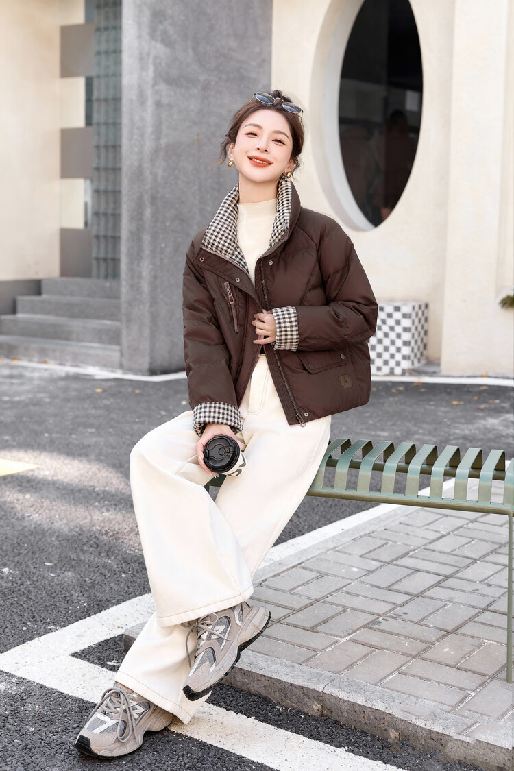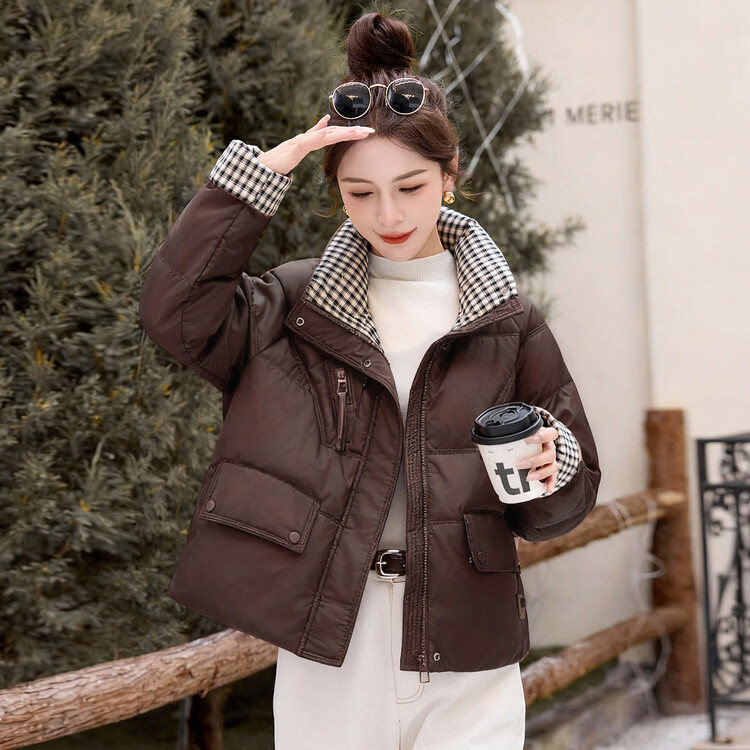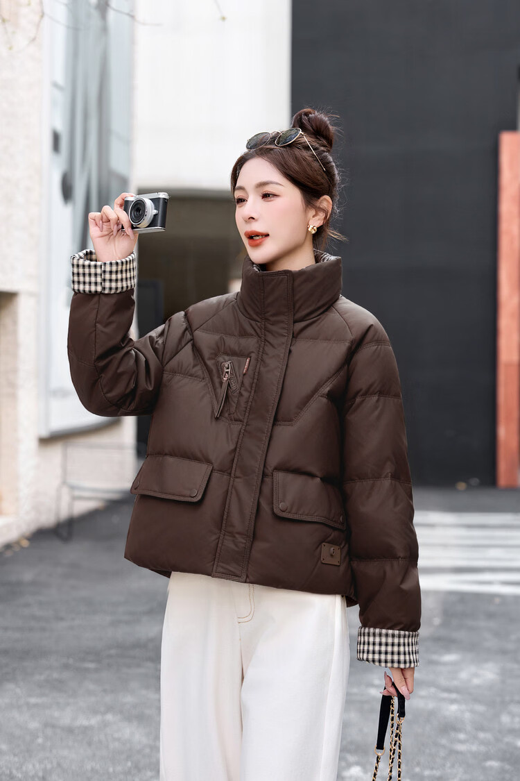 Hengyuanxiang Plaid Splicing Stand Collar Down Jacket Women's Short 2026 Winter New Style Small Thickened Warm White Duck Down Jacket Brown M