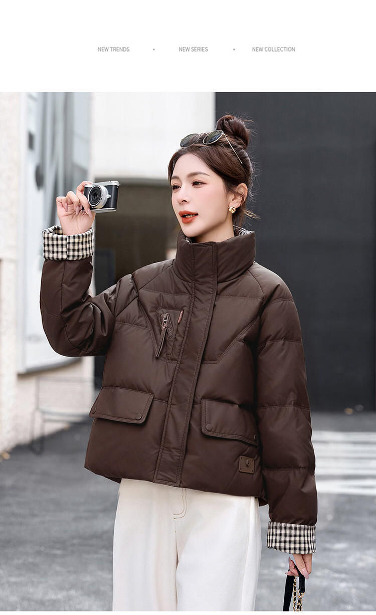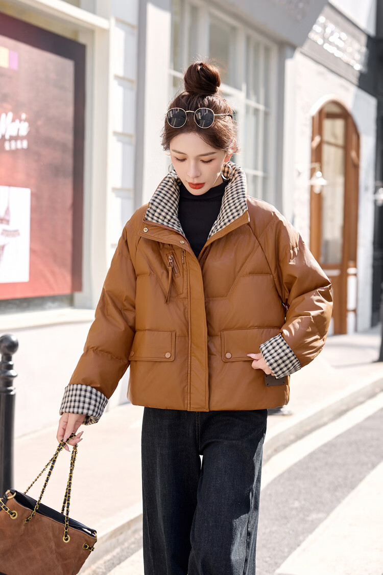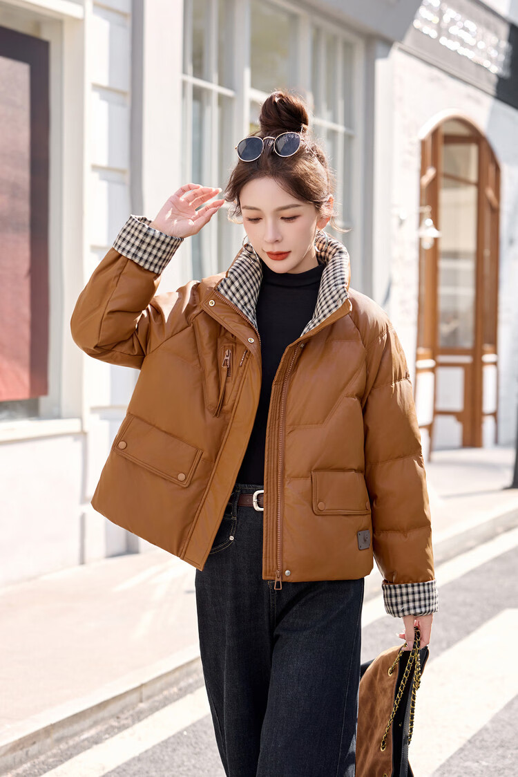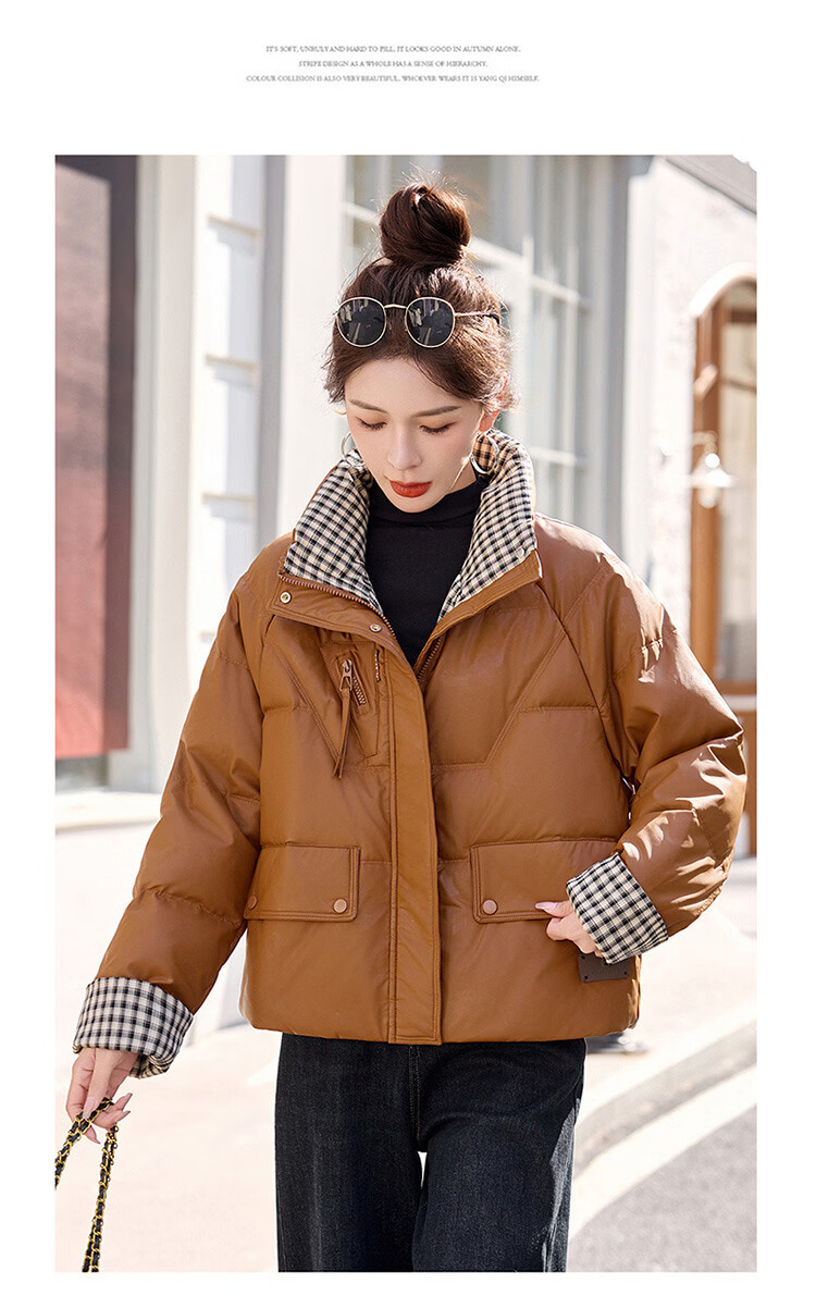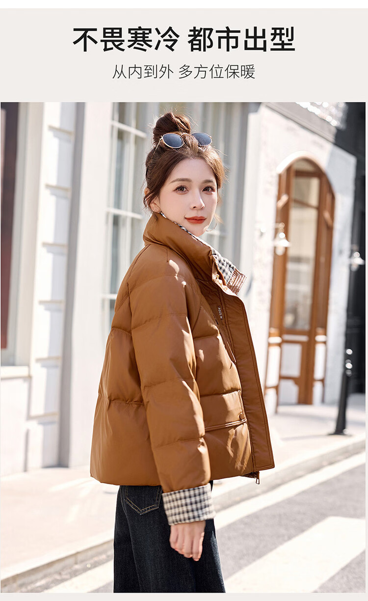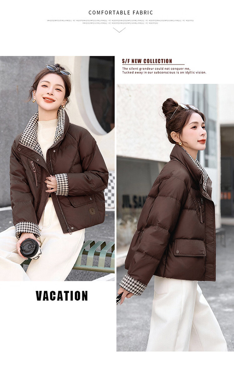 Hengyuanxiang Plaid Splicing Stand Collar Down Jacket Women's Short 2026 Winter New Style Small Thickened Warm White Duck Down Jacket Brown M