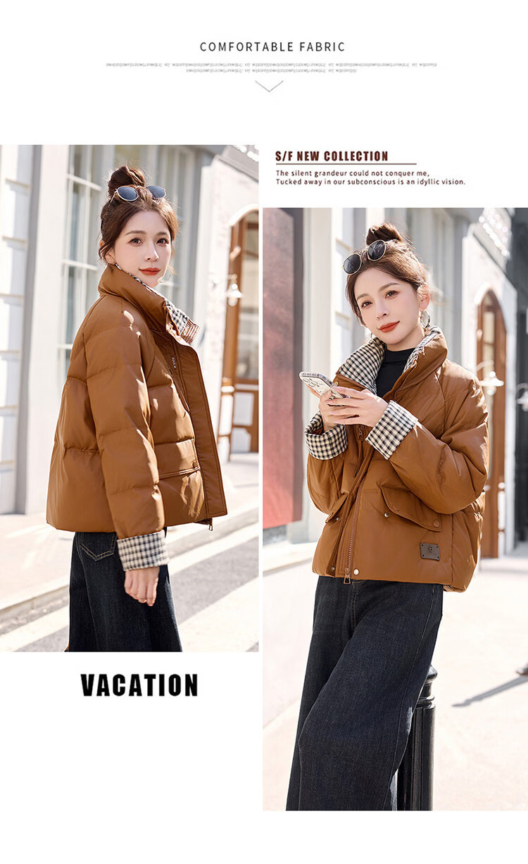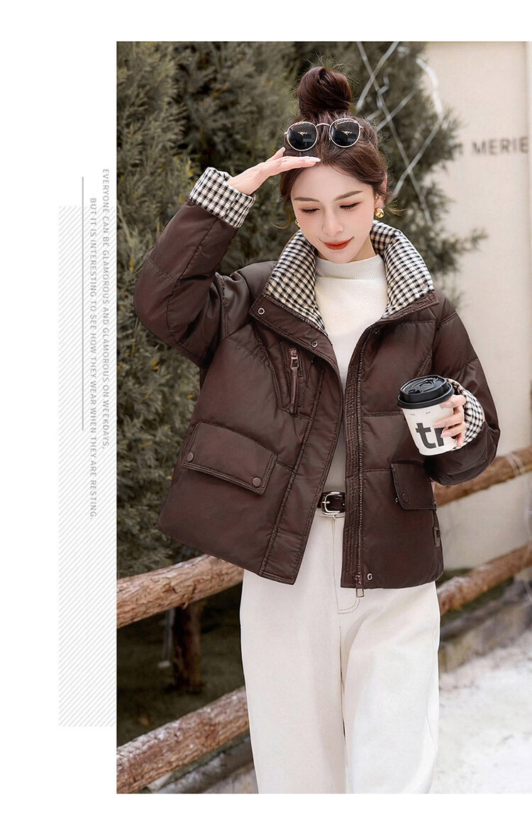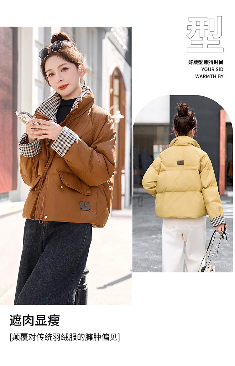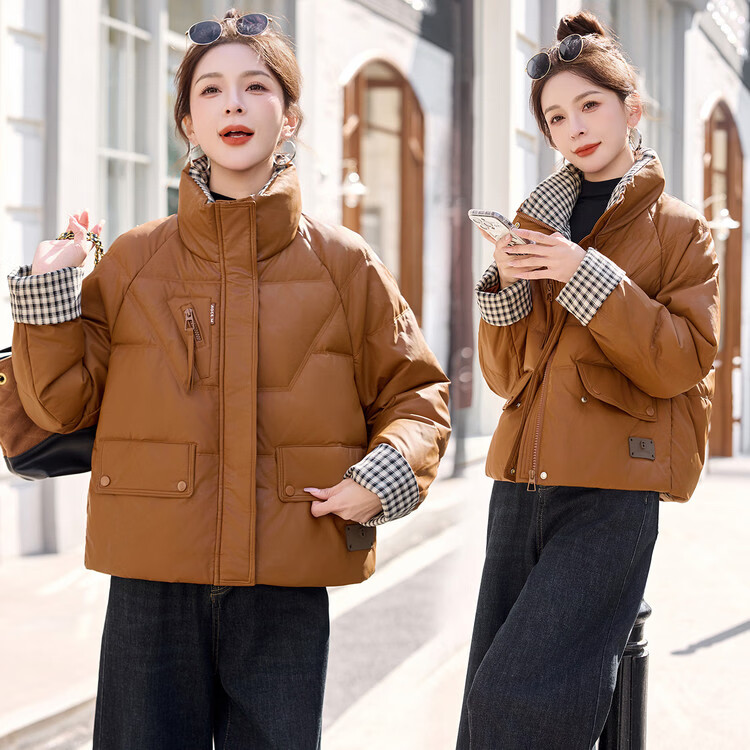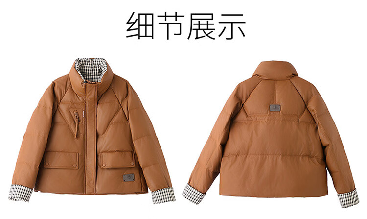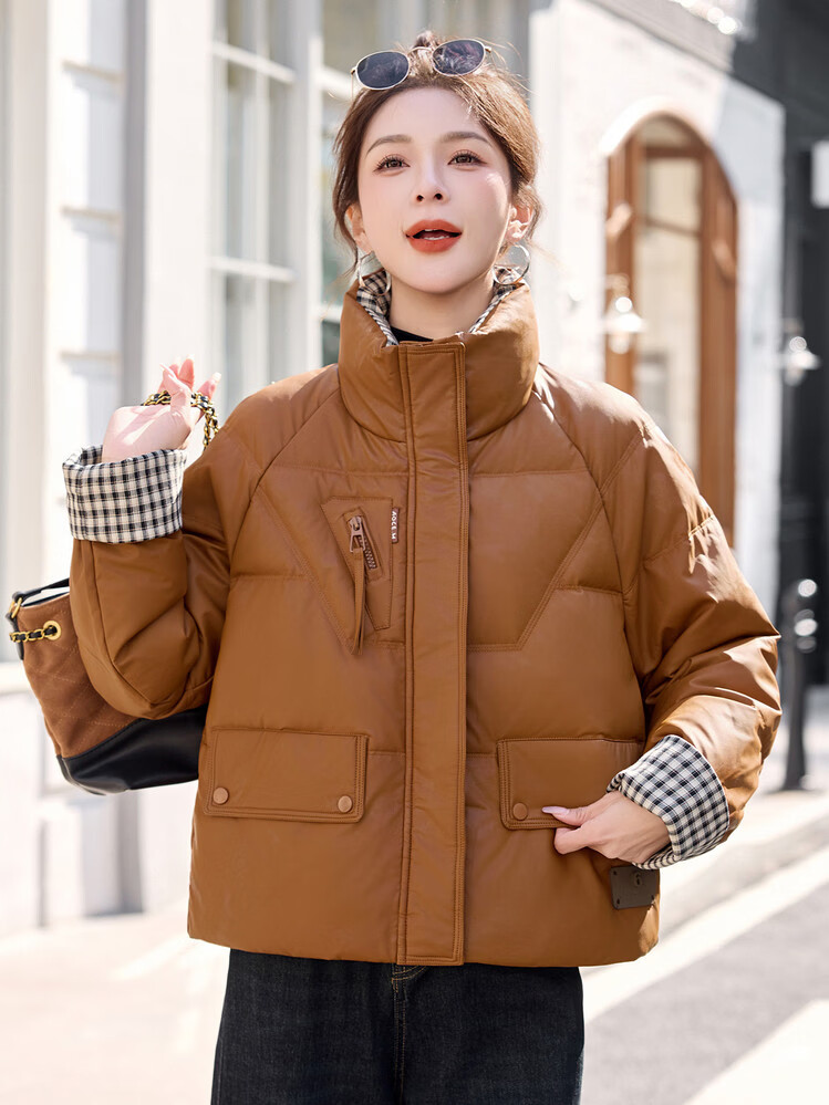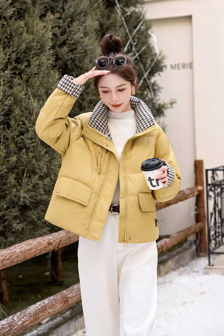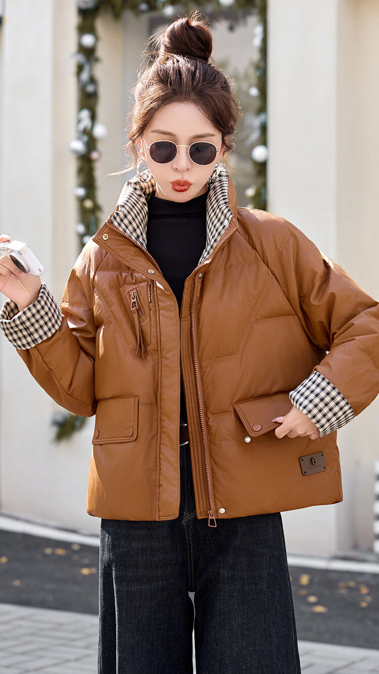 Hengyuanxiang Plaid Splicing Stand Collar Down Jacket Women's Short 2026 Winter New Style Small Thickened Warm White Duck Down Jacket Brown M