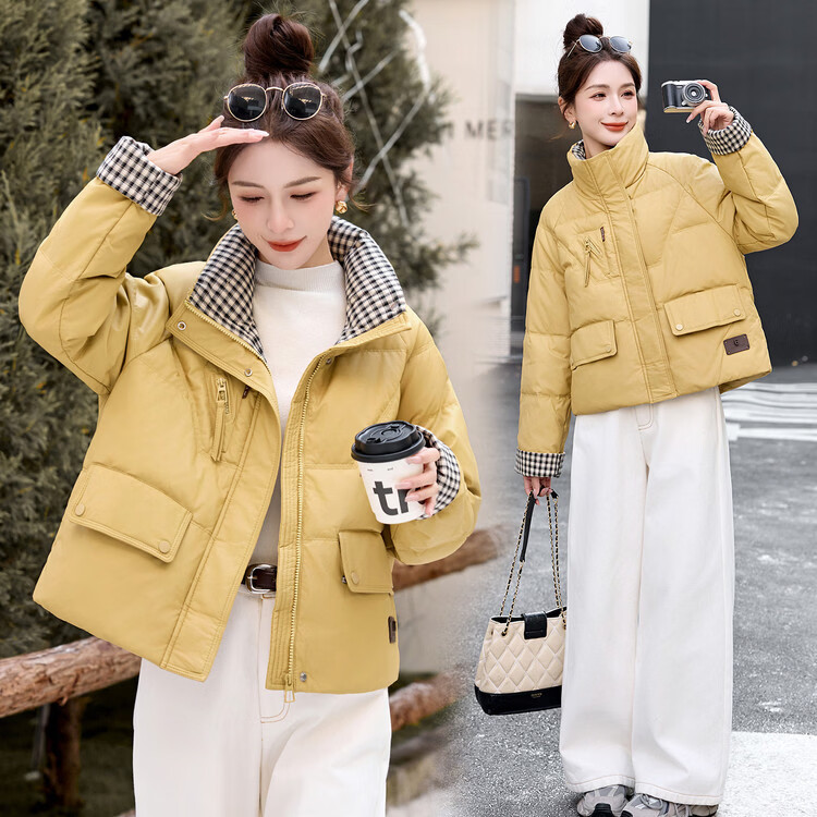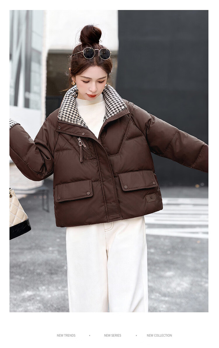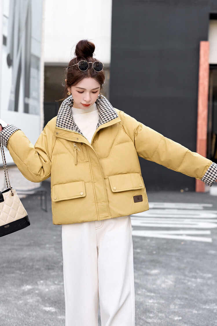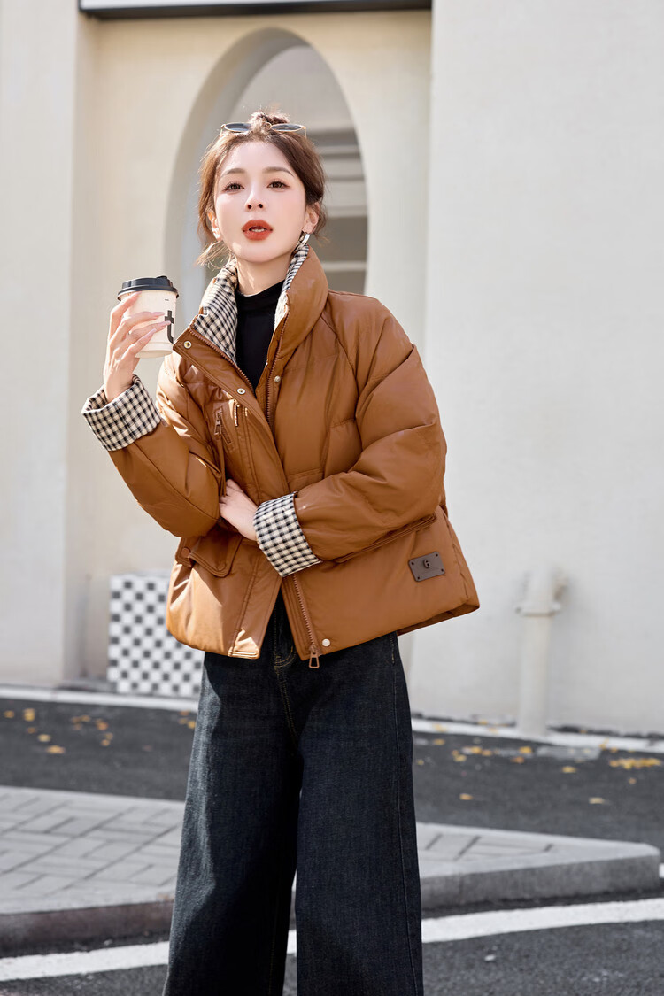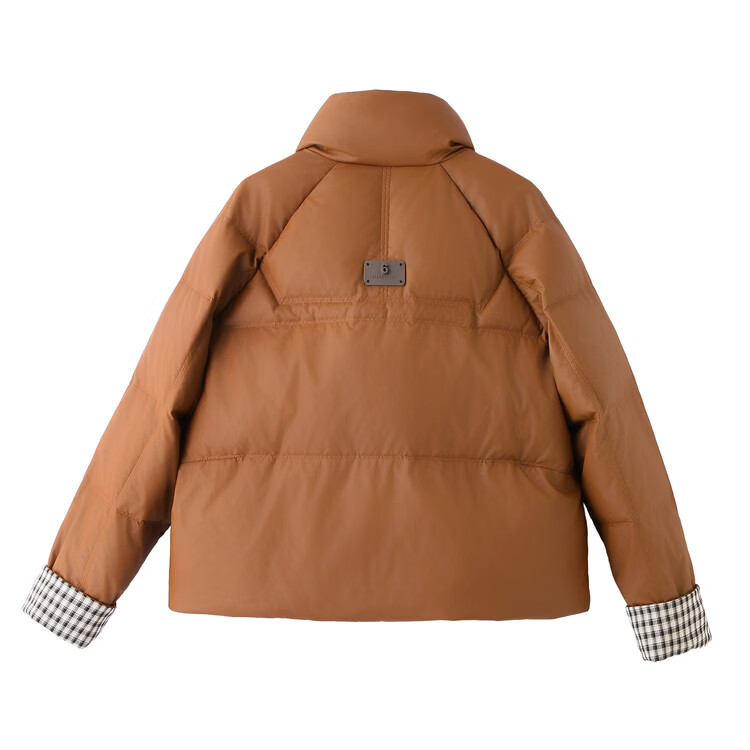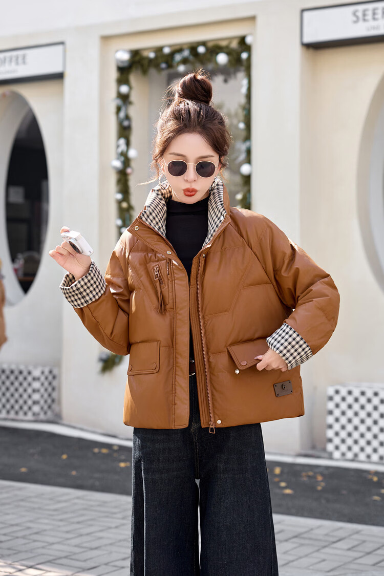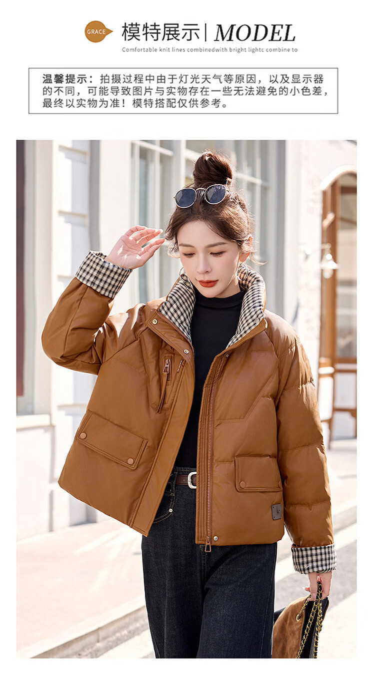 Hengyuanxiang Plaid Splicing Stand Collar Down Jacket Women's Short 2026 Winter New Style Small Thickened Warm White Duck Down Jacket Brown M