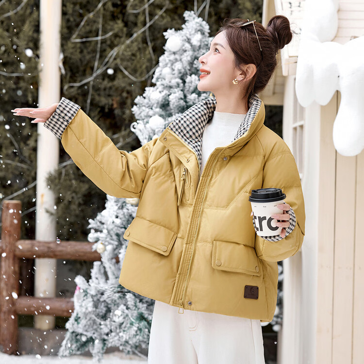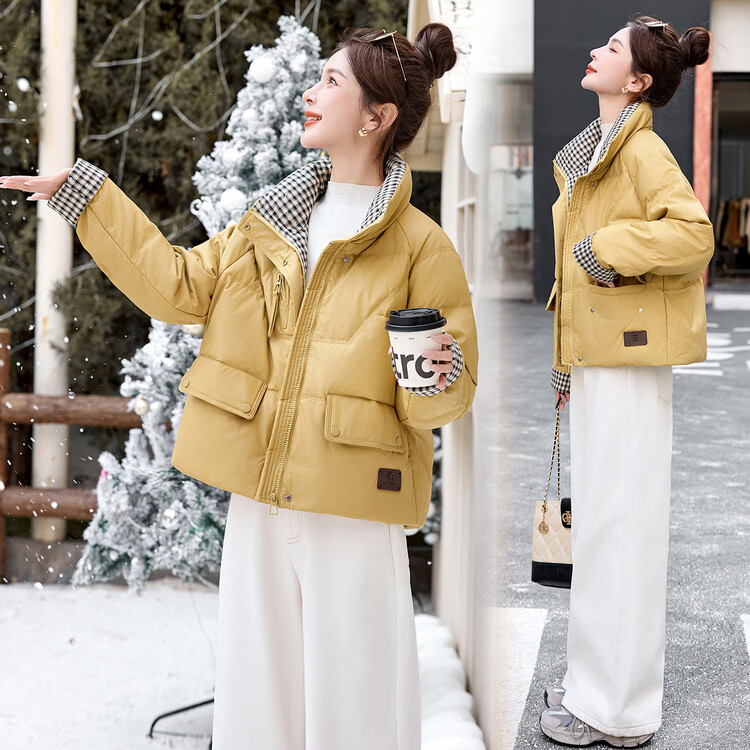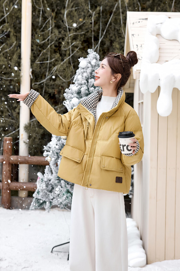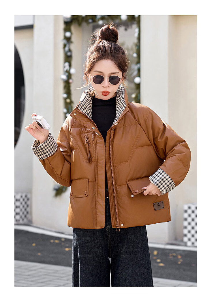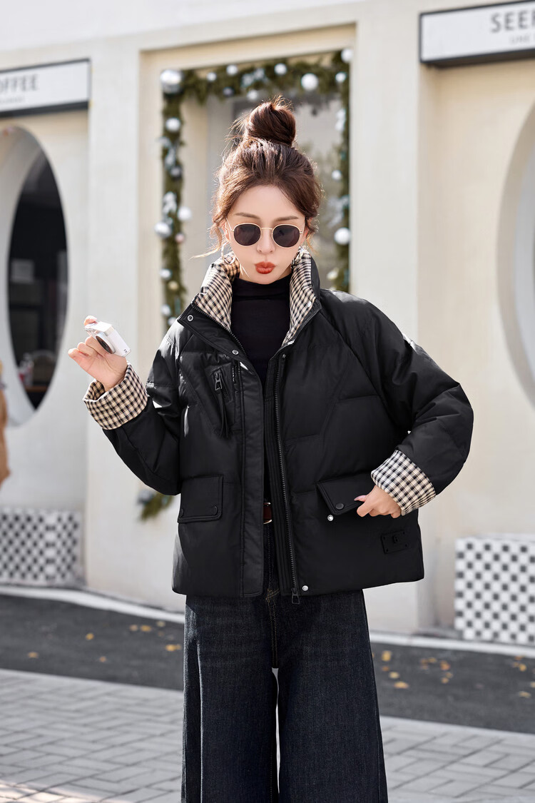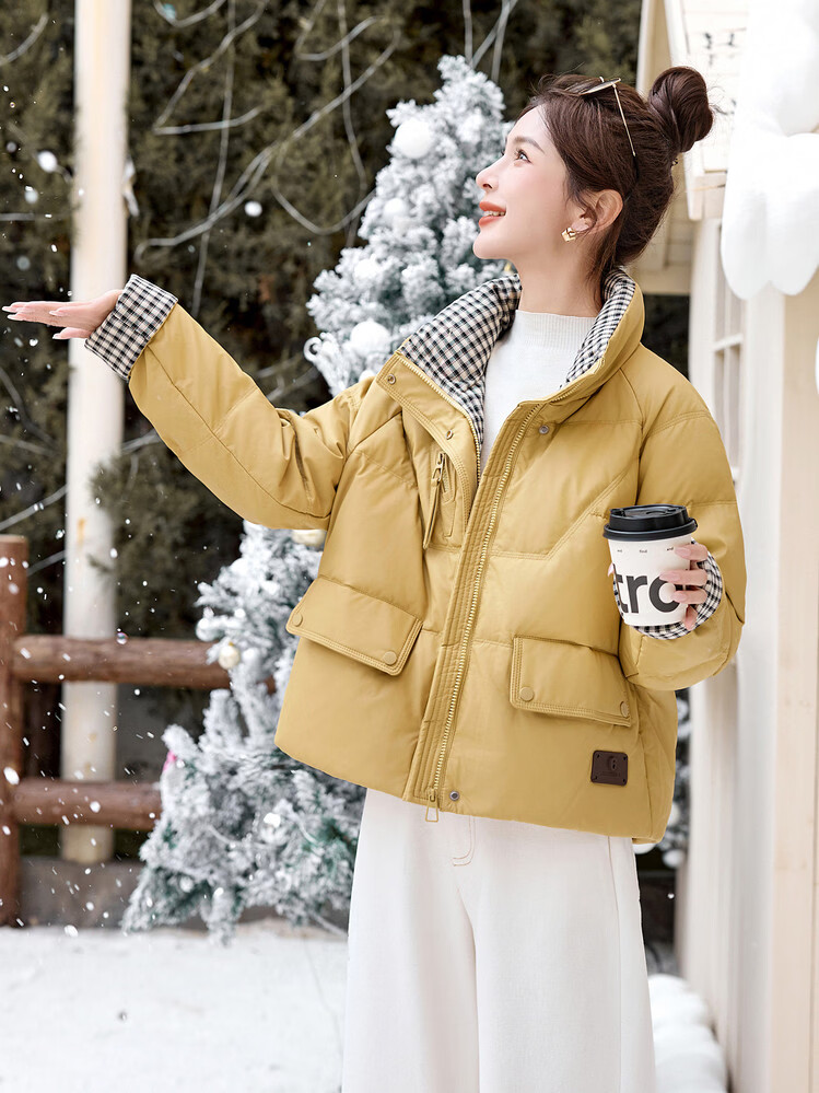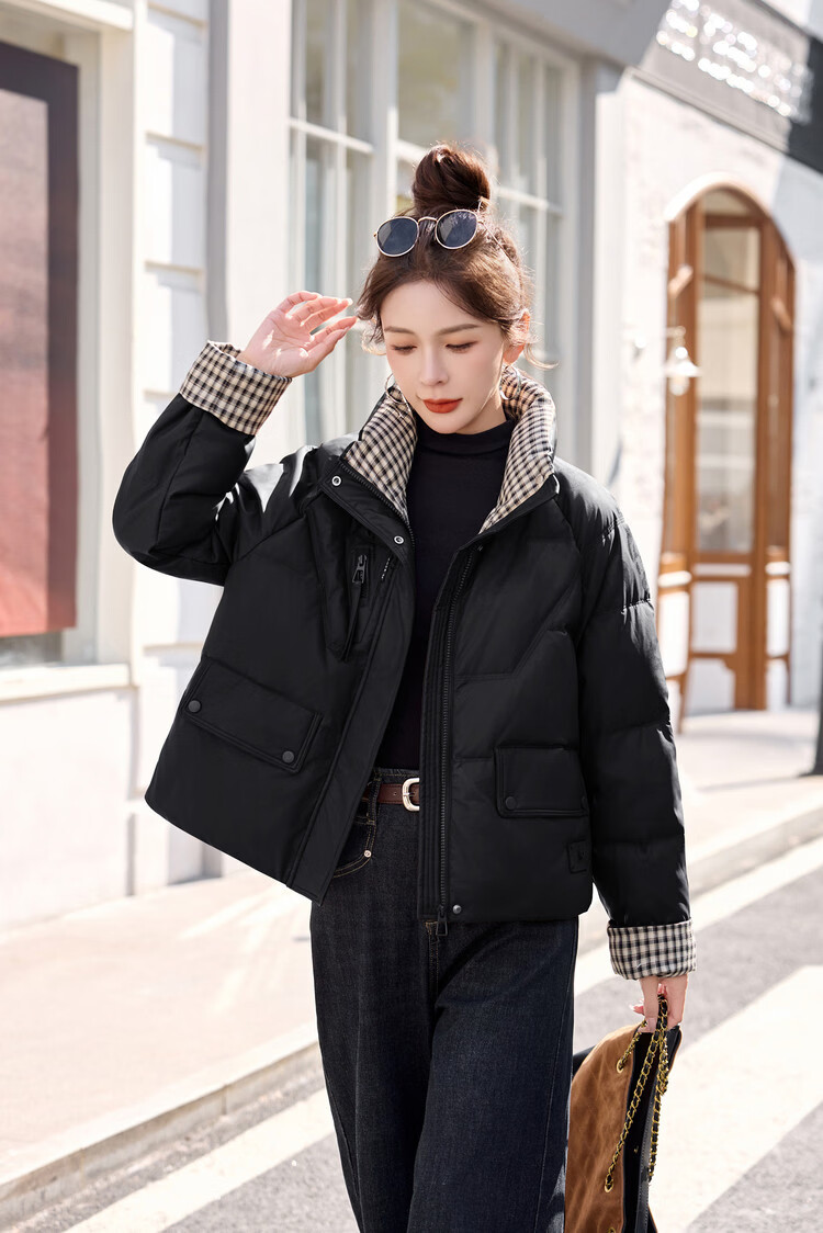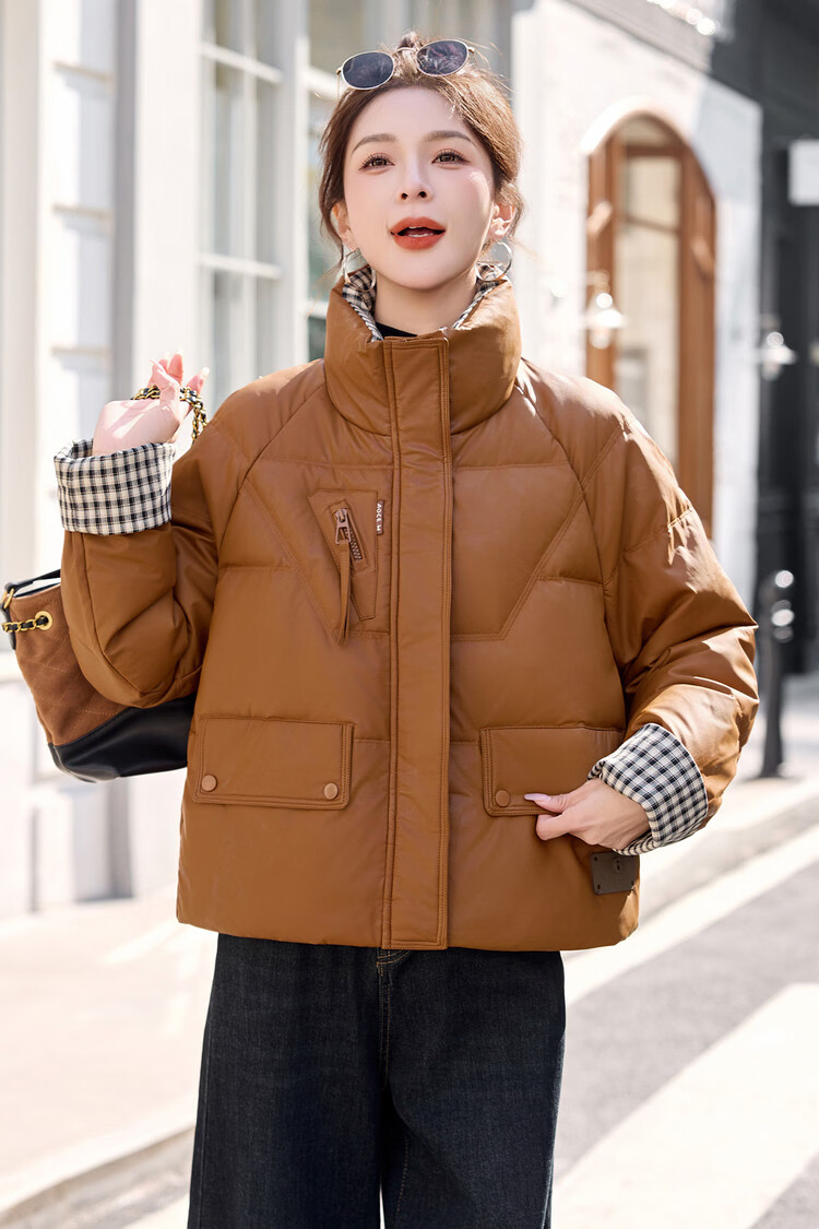 Hengyuanxiang Plaid Splicing Stand Collar Down Jacket Women's Short 2026 Winter New Style Small Thickened Warm White Duck Down Jacket Brown M