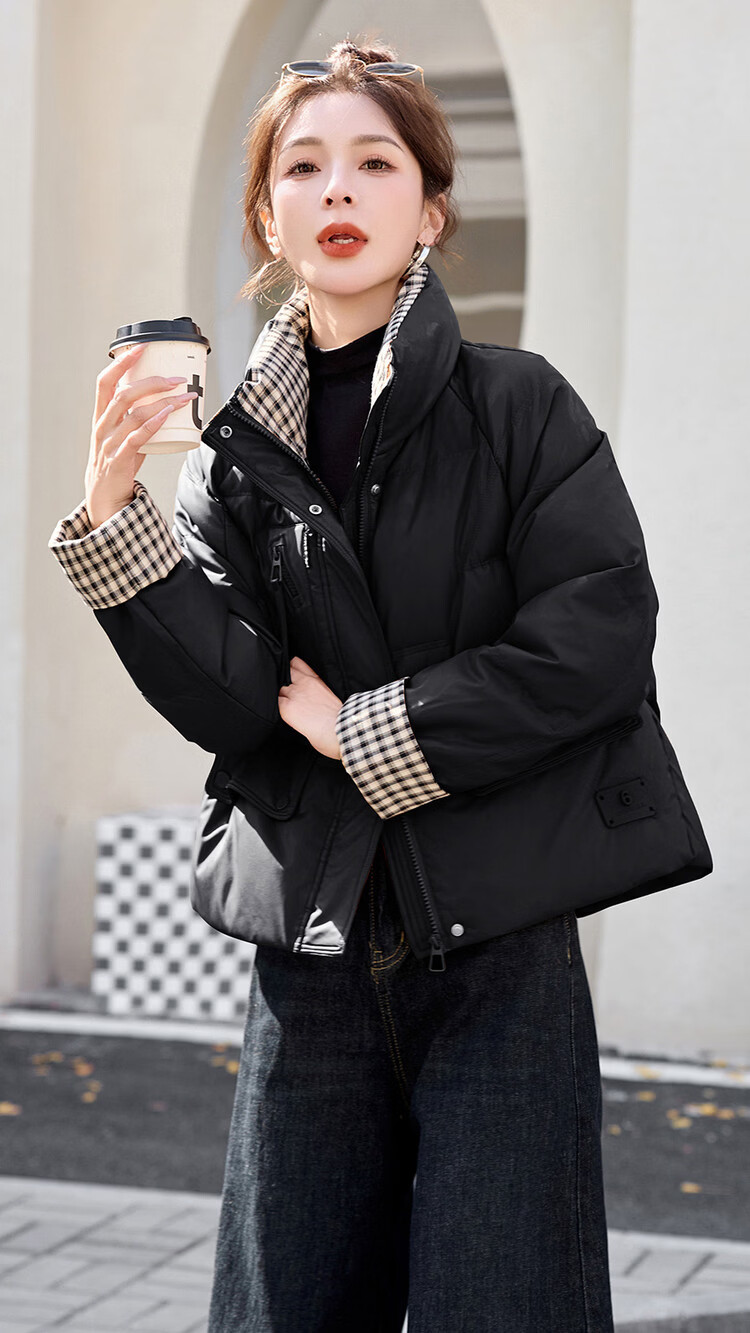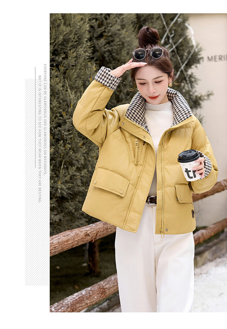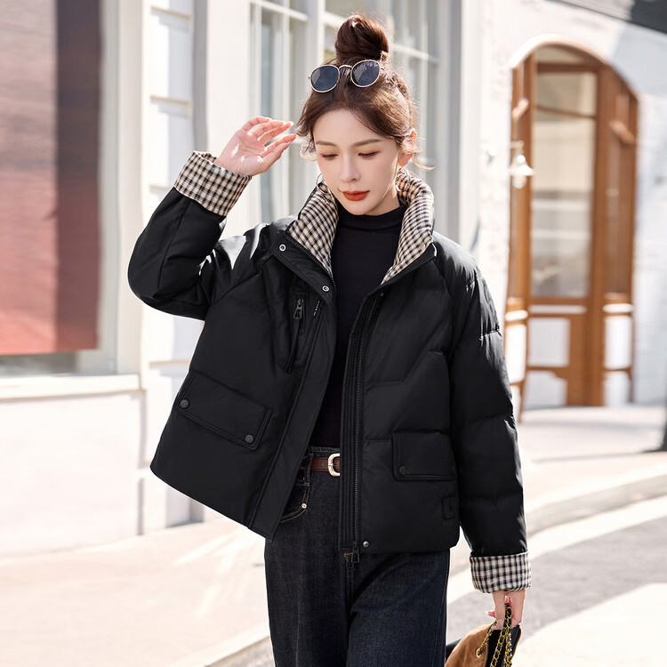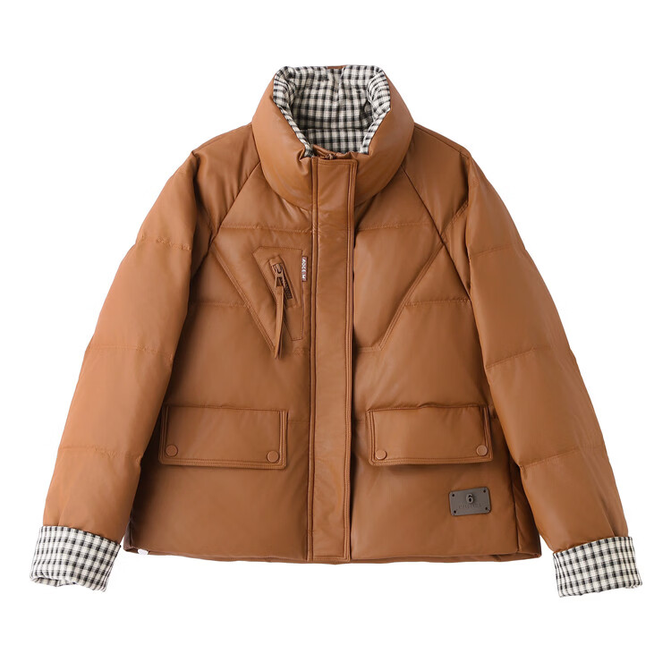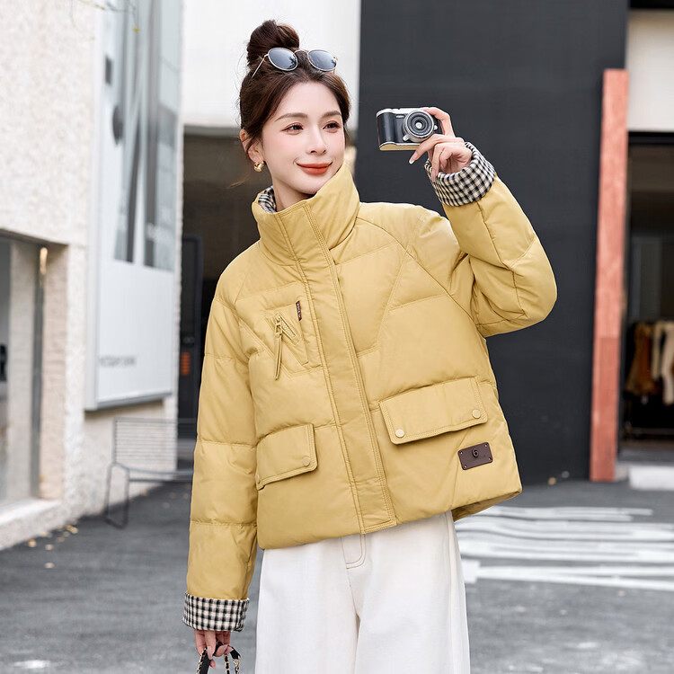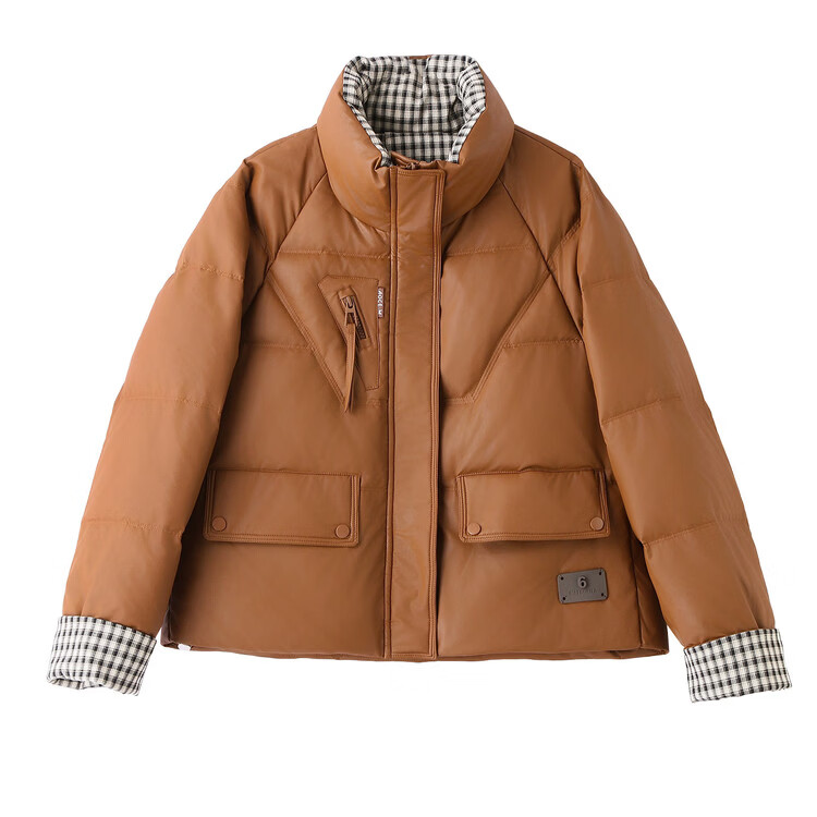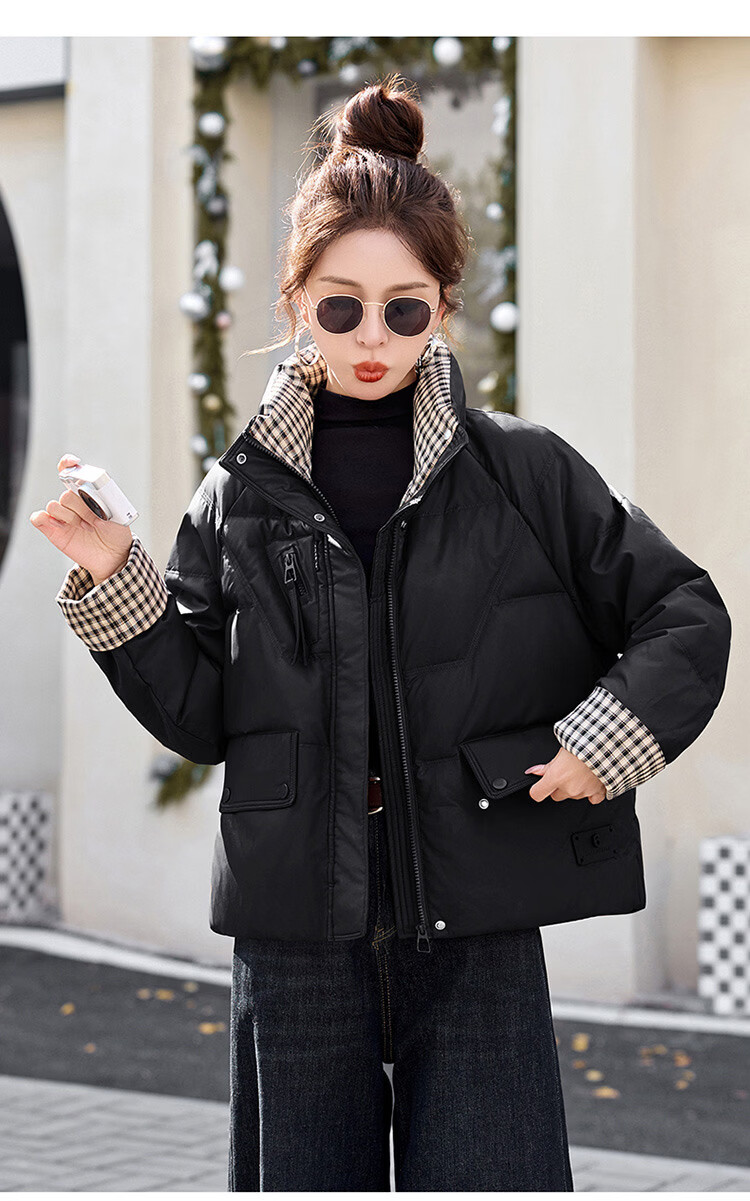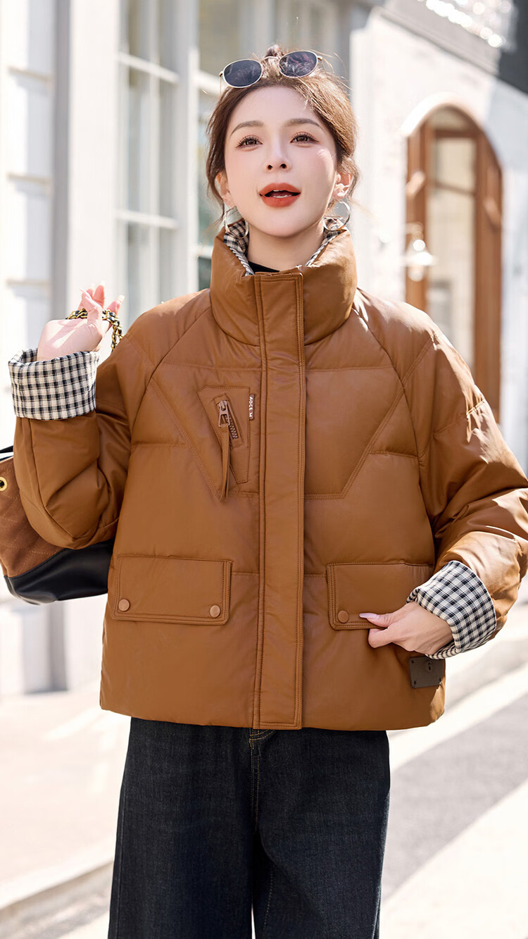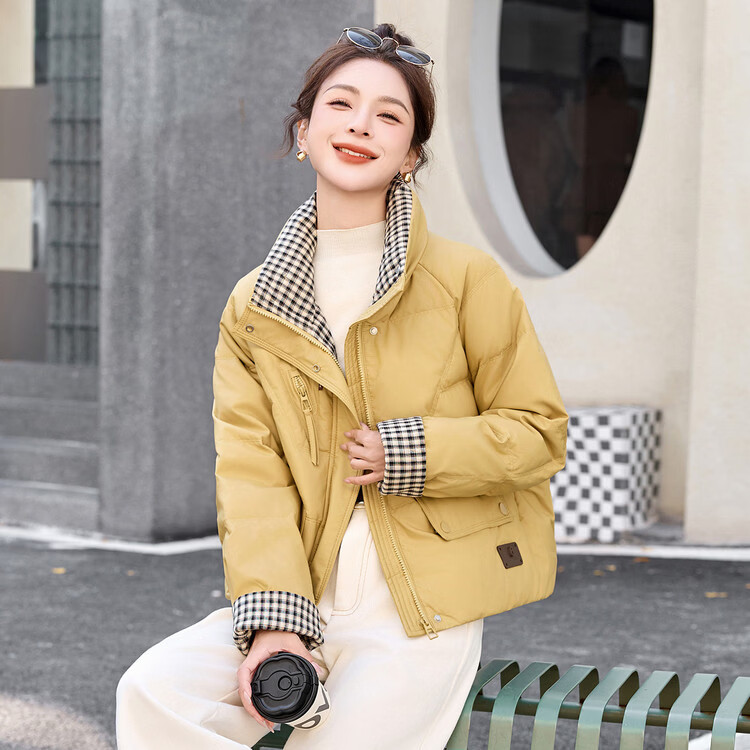 Hengyuanxiang Plaid Splicing Stand Collar Down Jacket Women's Short 2026 Winter New Style Small Thickened Warm White Duck Down Jacket Brown M