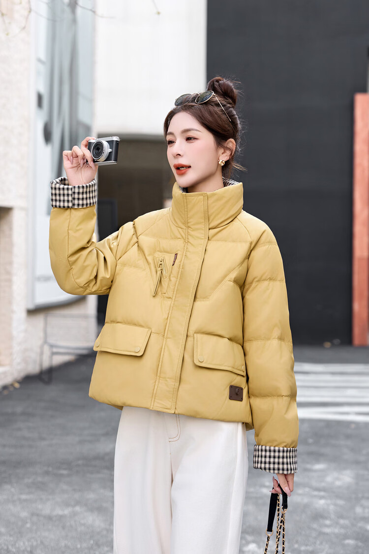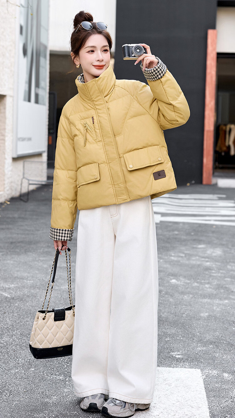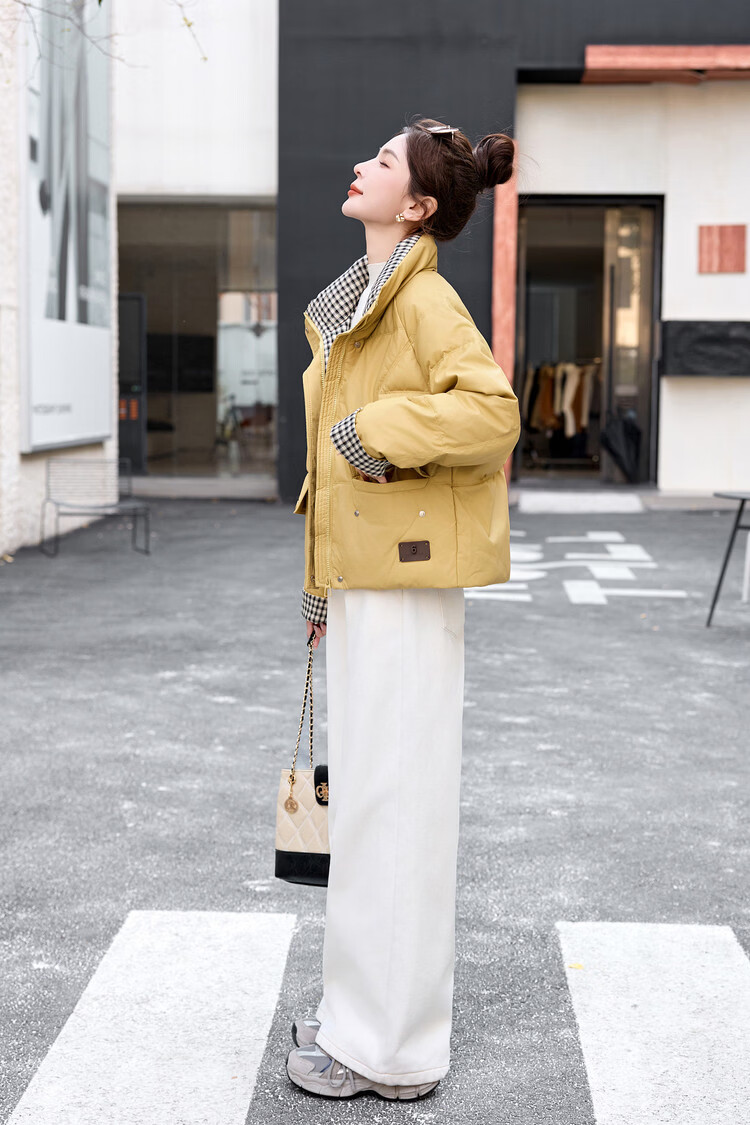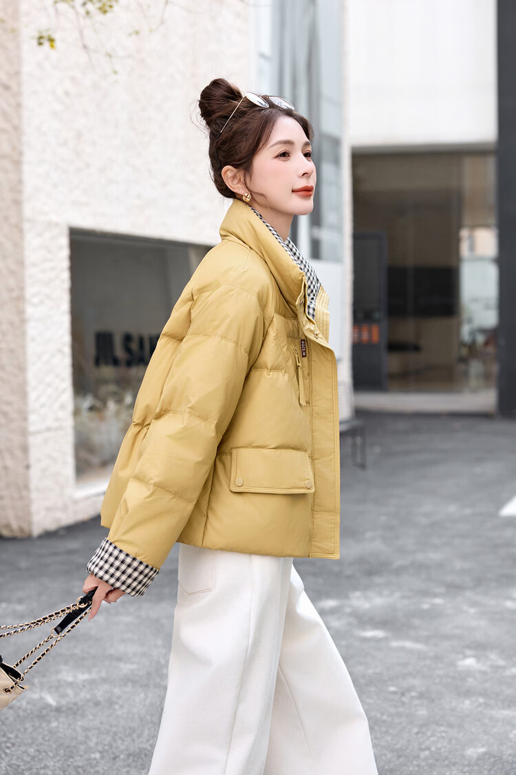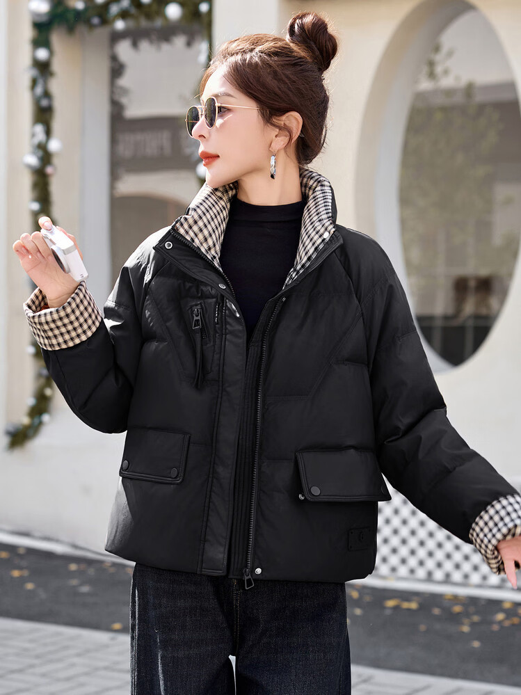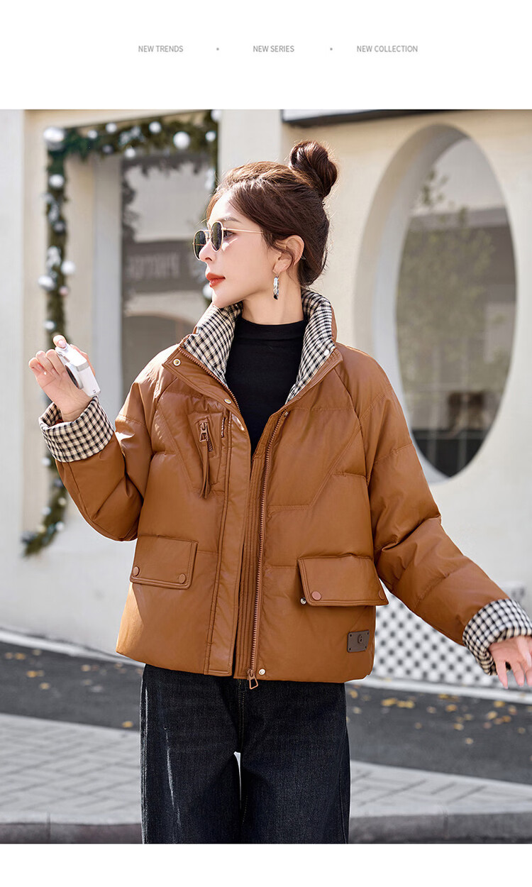 Hengyuanxiang Plaid Splicing Stand Collar Down Jacket Women's Short 2026 Winter New Style Small Thickened Warm White Duck Down Jacket Brown M