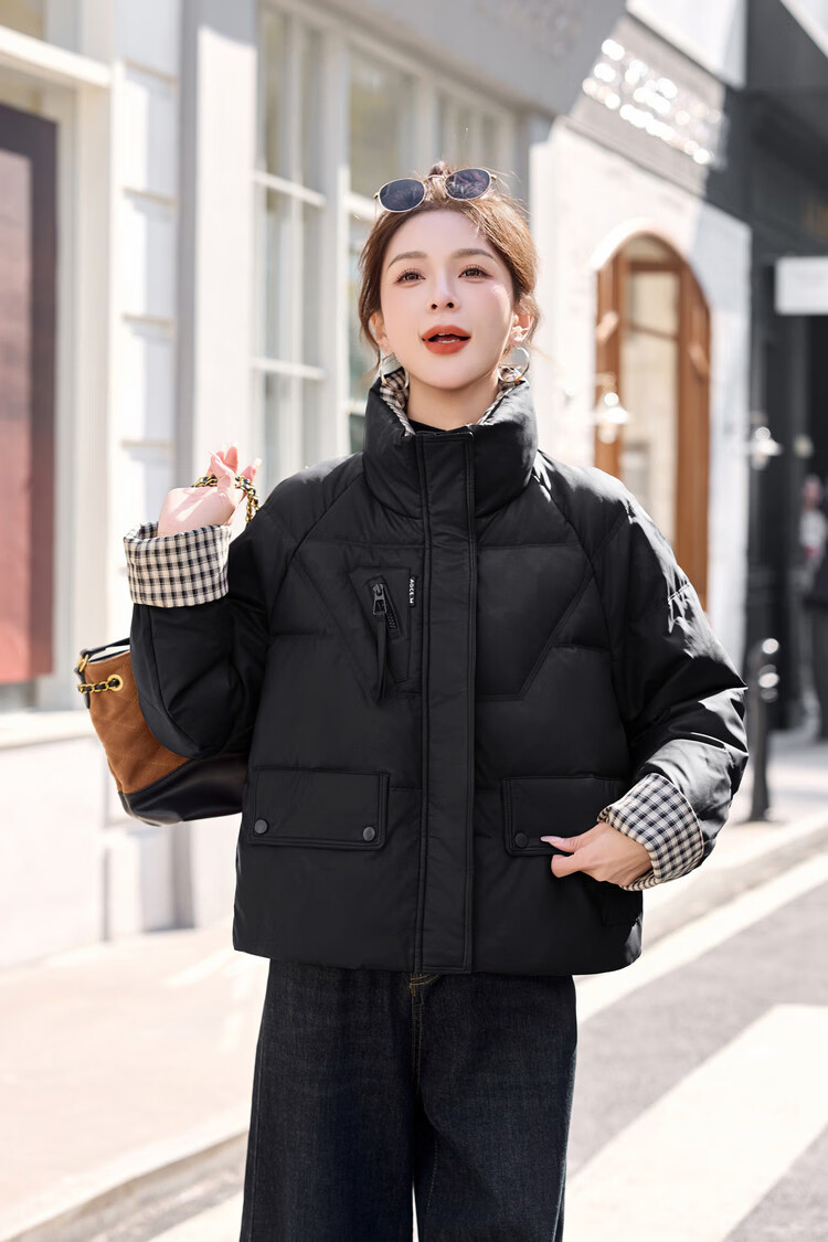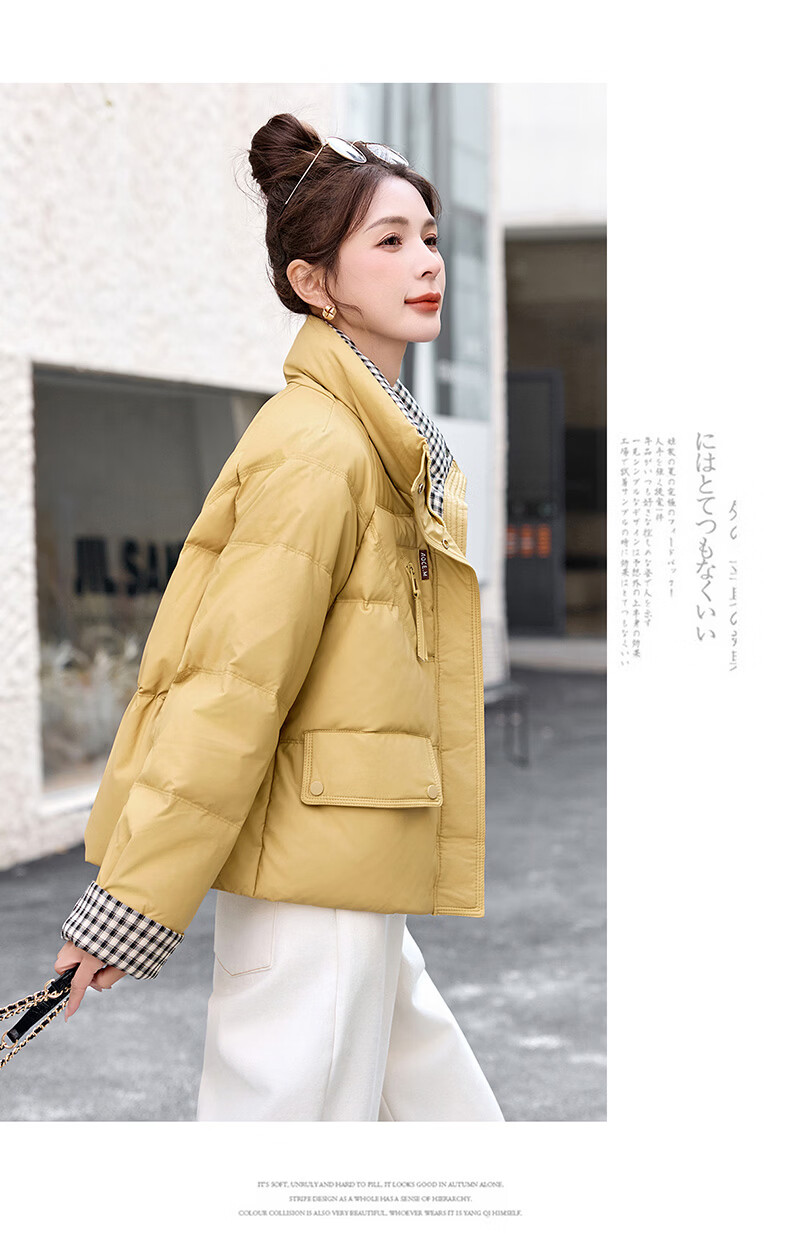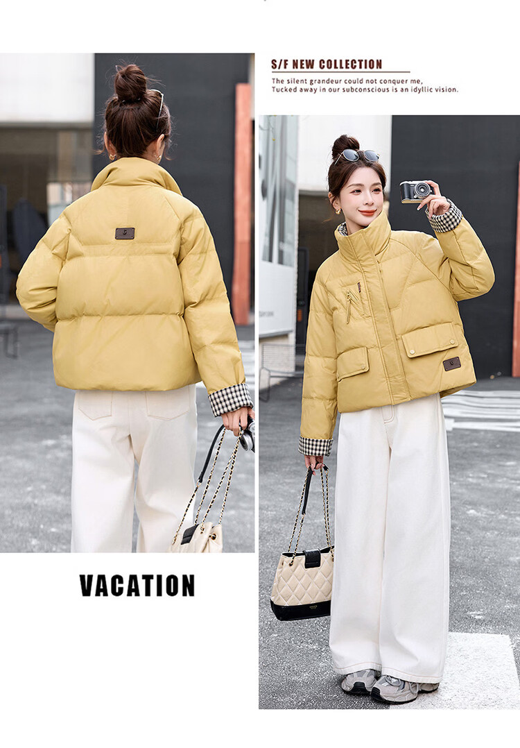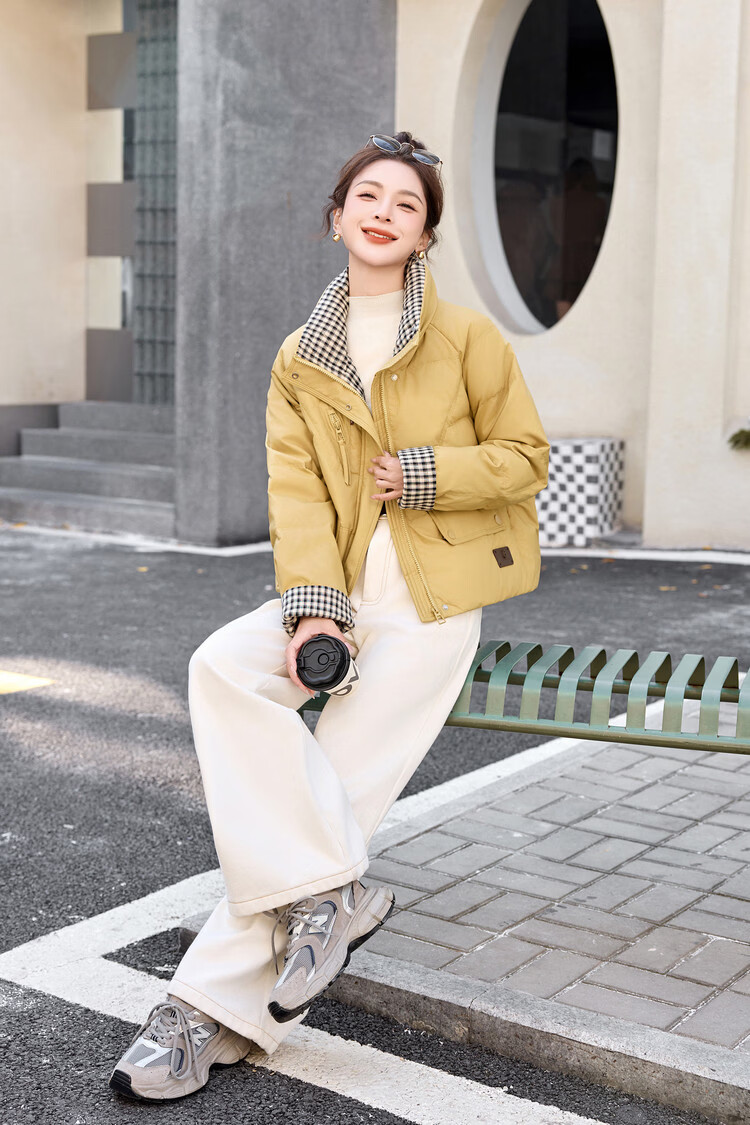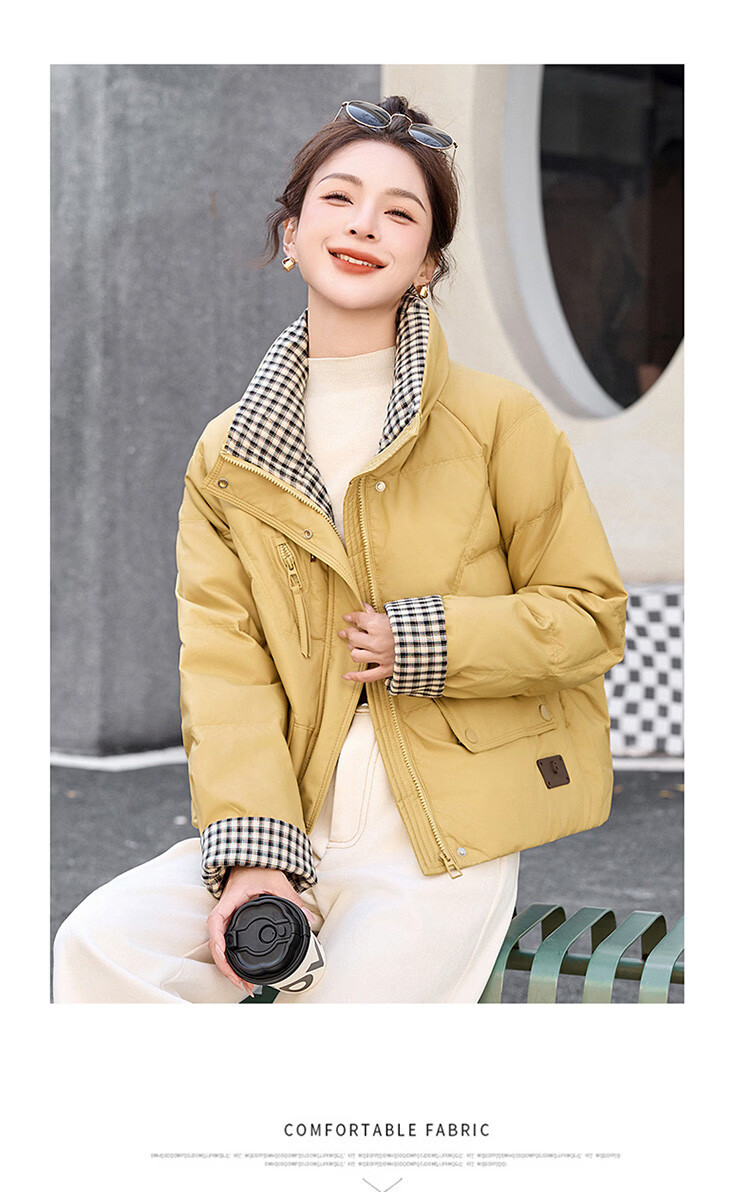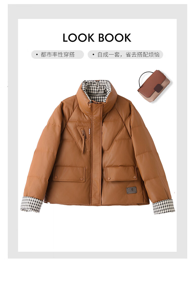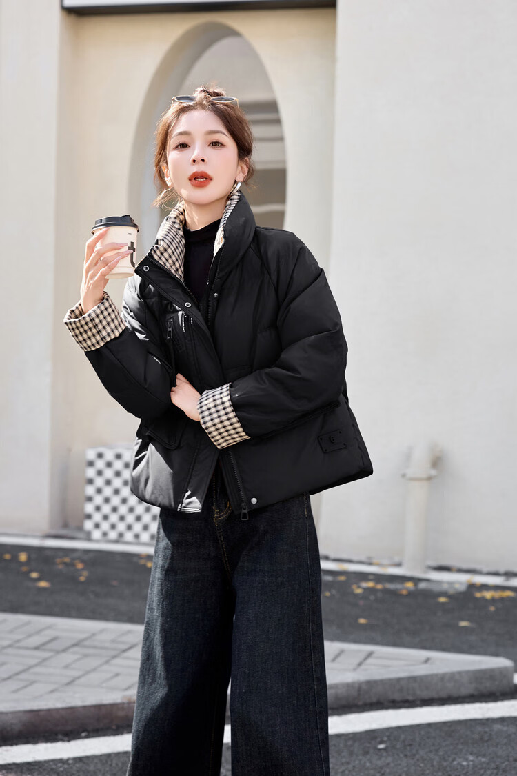 Hengyuanxiang Plaid Splicing Stand Collar Down Jacket Women's Short 2026 Winter New Style Small Thickened Warm White Duck Down Jacket Brown M