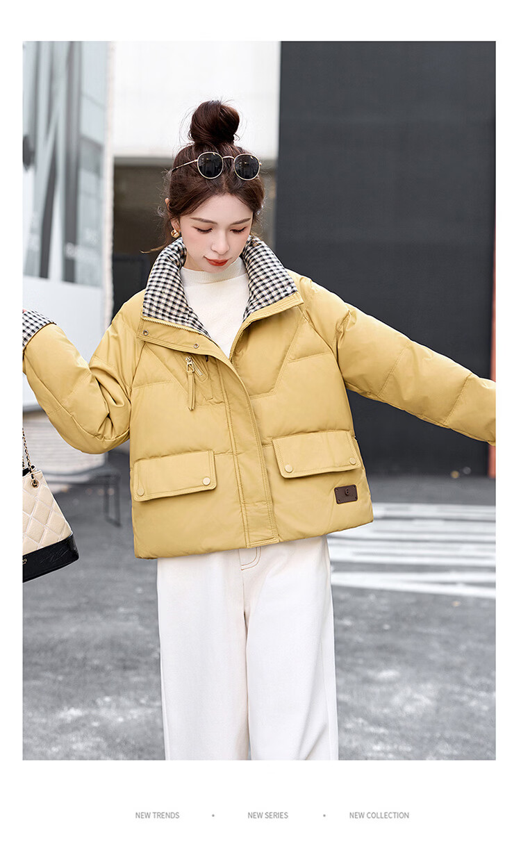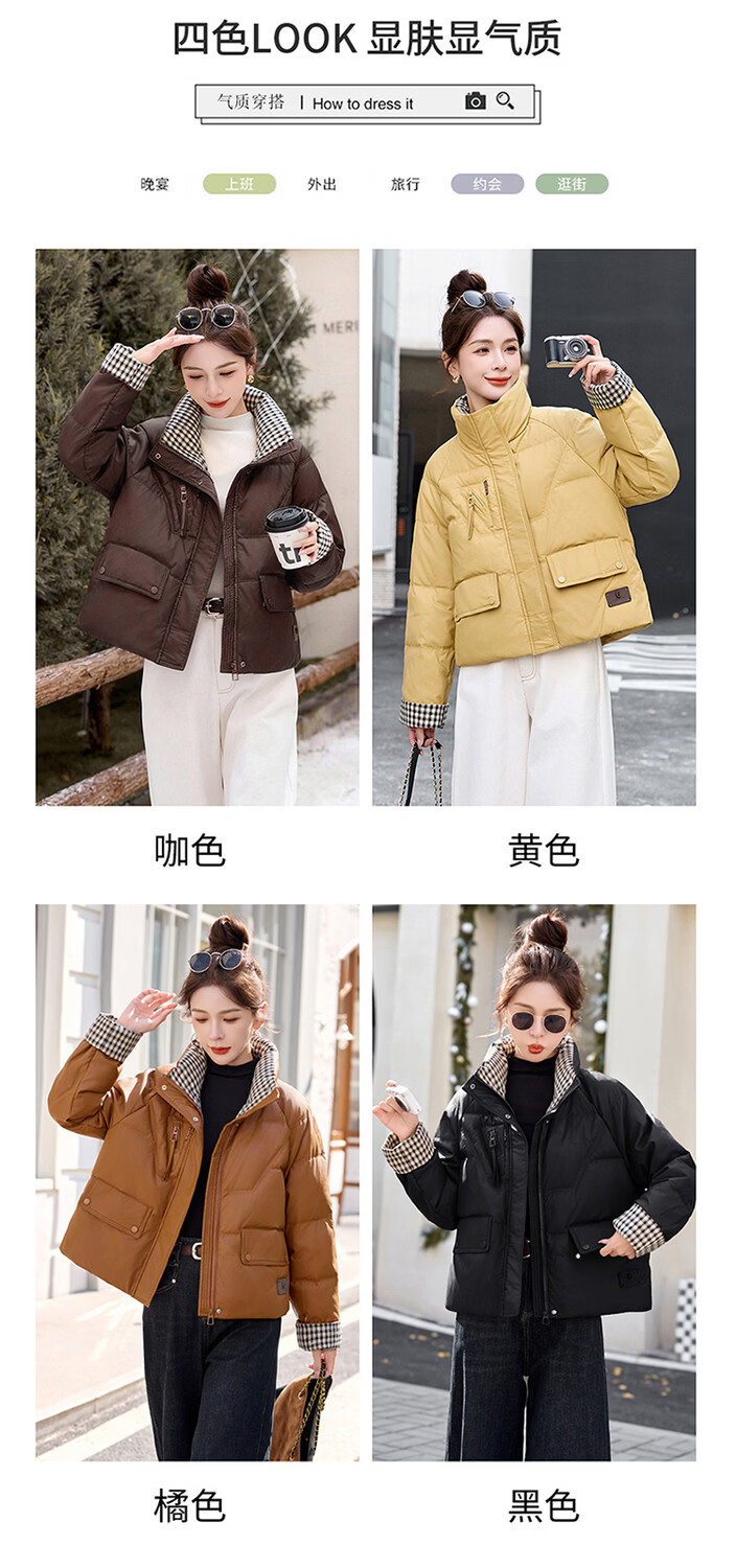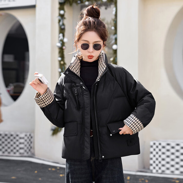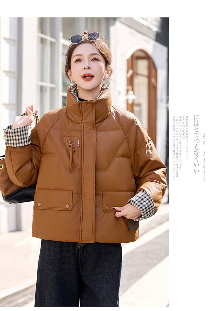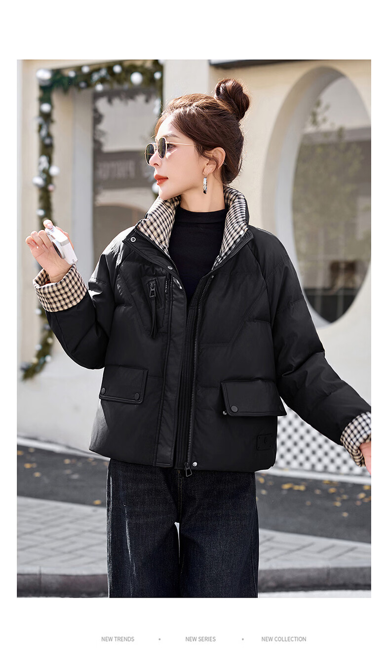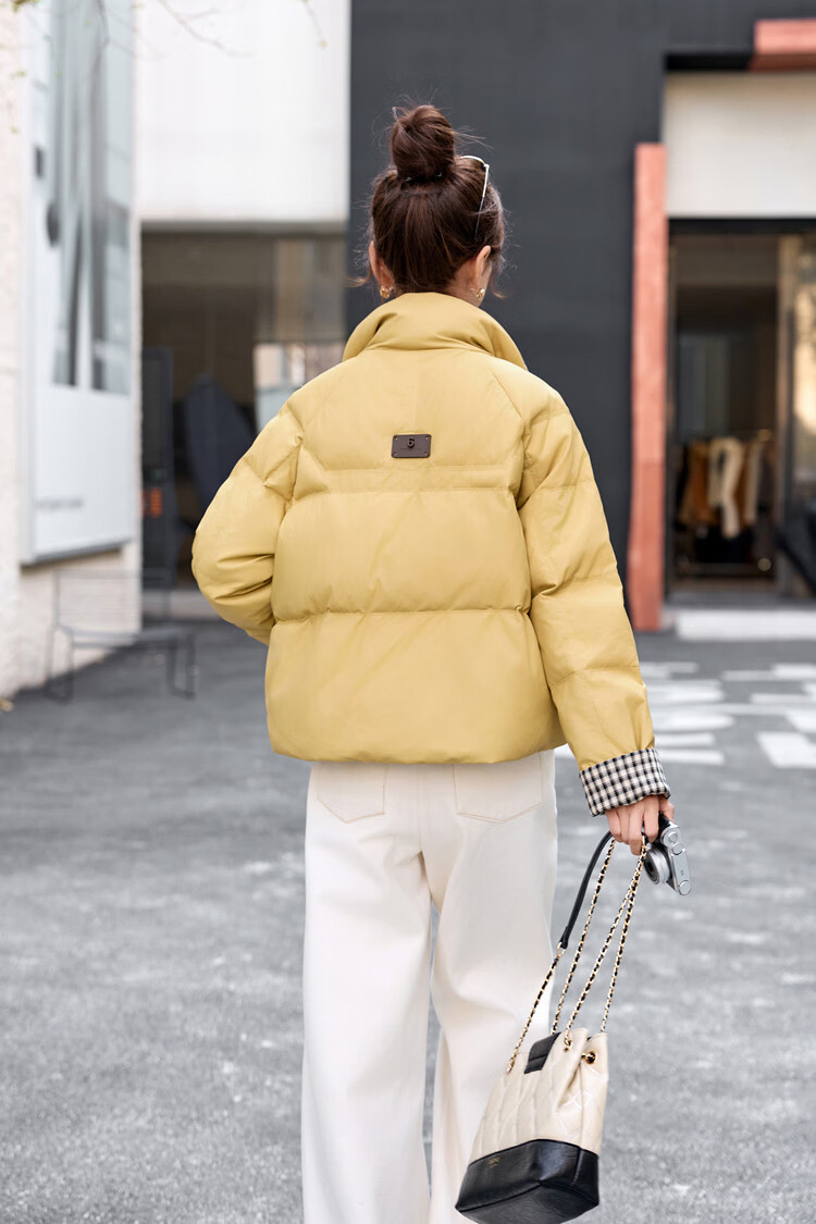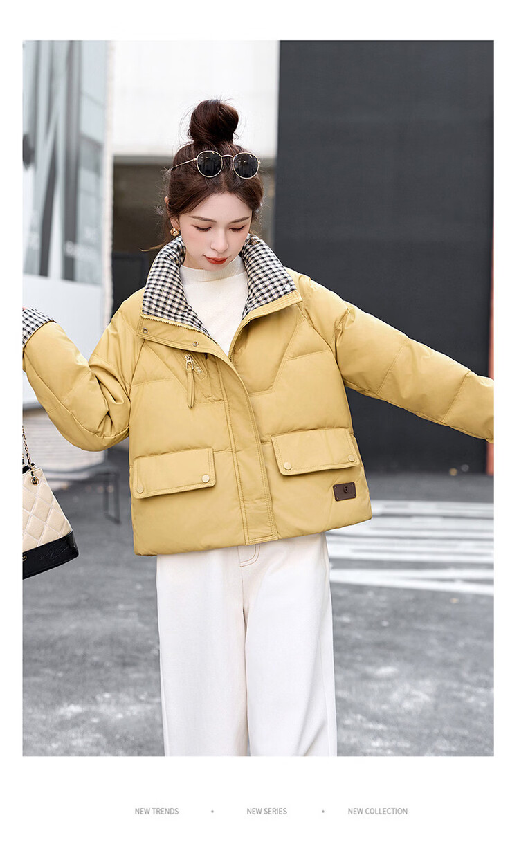 Hengyuanxiang Plaid Splicing Stand Collar Down Jacket Women's Short 2026 Winter New Style Small Thickened Warm White Duck Down Jacket Brown M