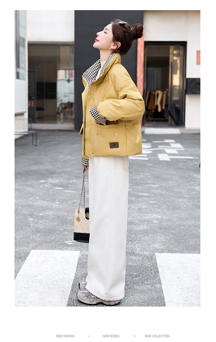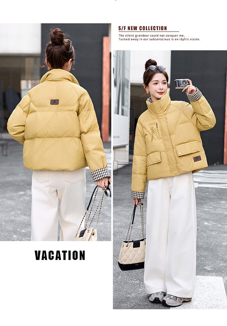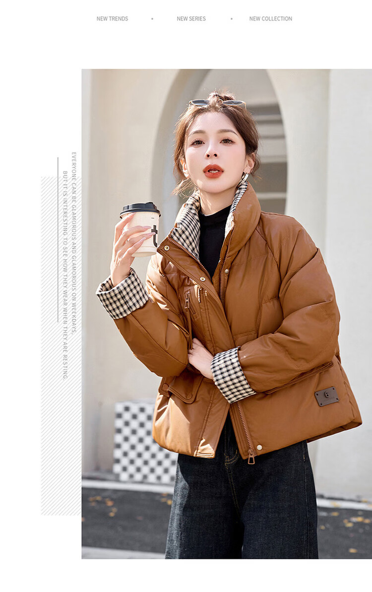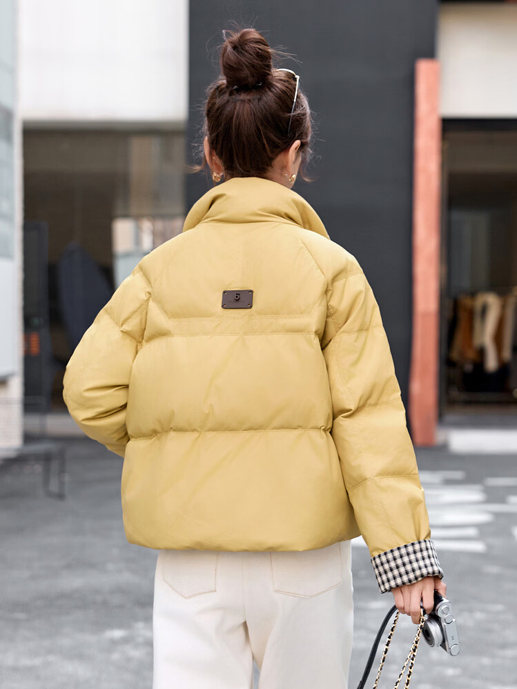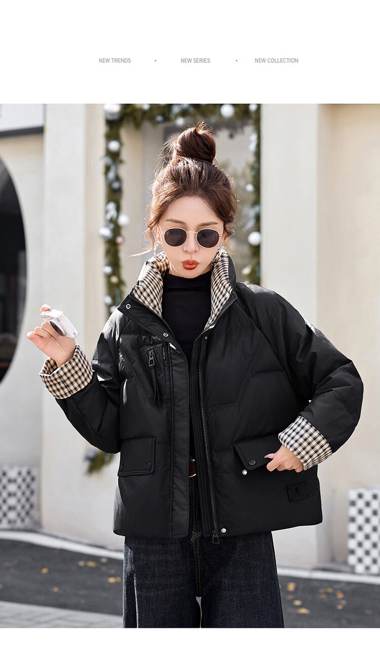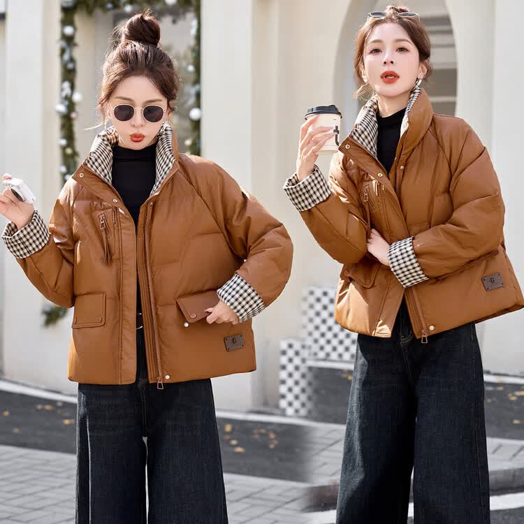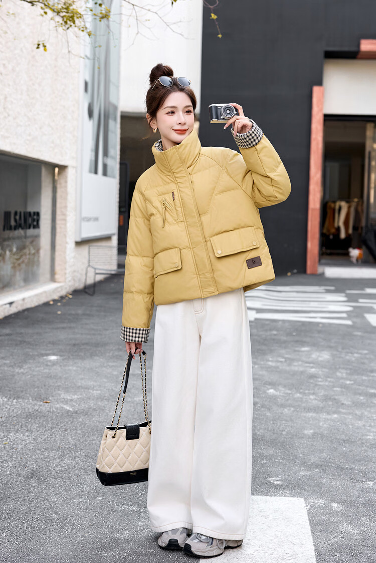 Hengyuanxiang Plaid Splicing Stand Collar Down Jacket Women's Short 2026 Winter New Style Small Thickened Warm White Duck Down Jacket Brown M