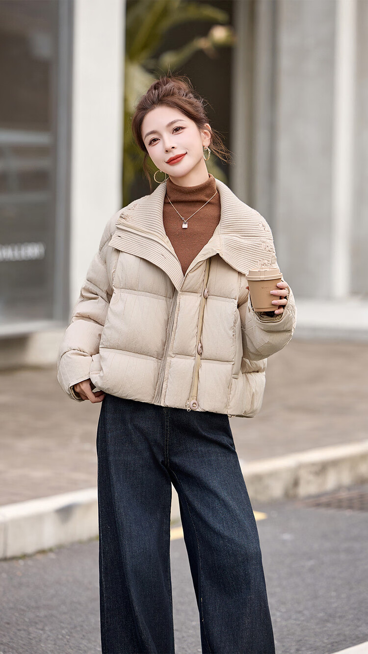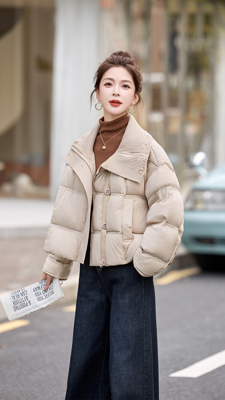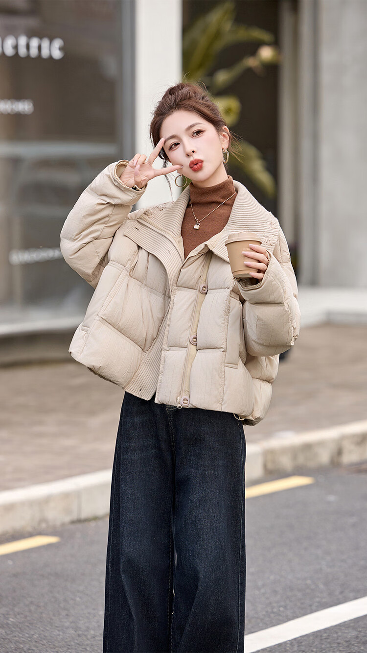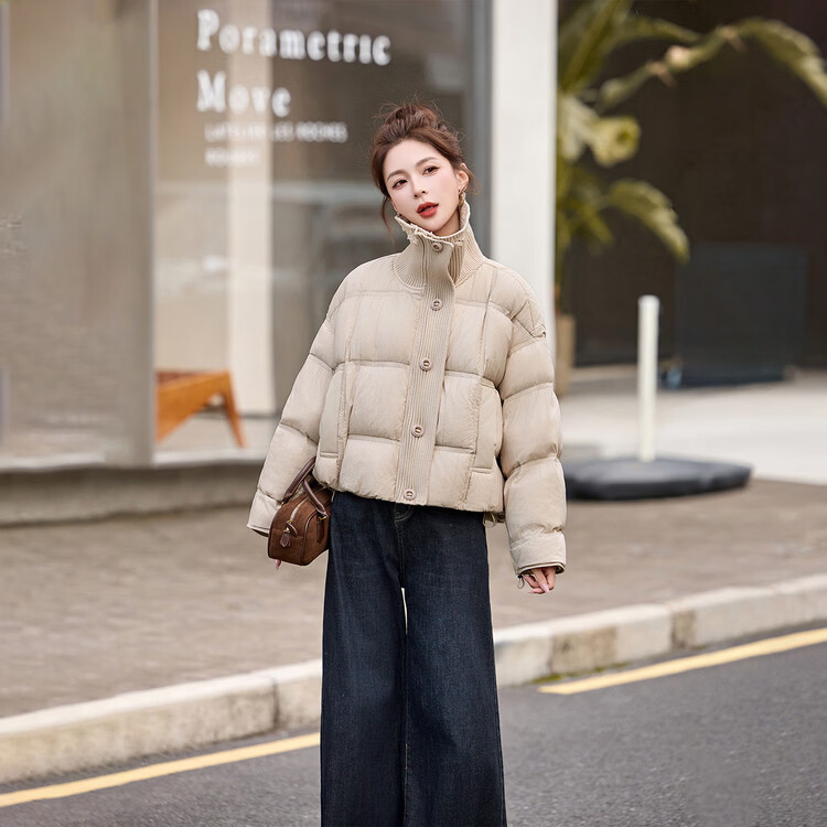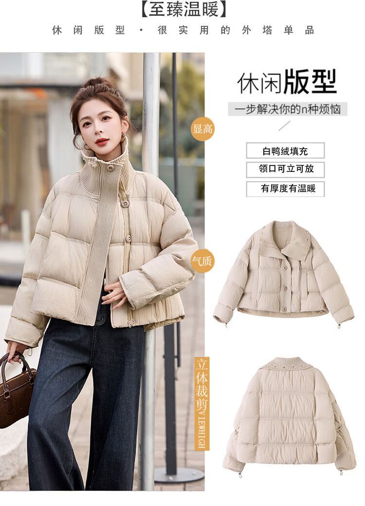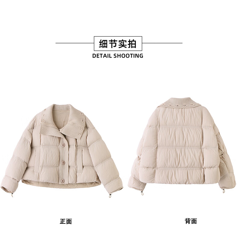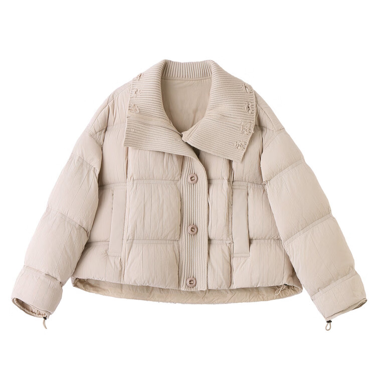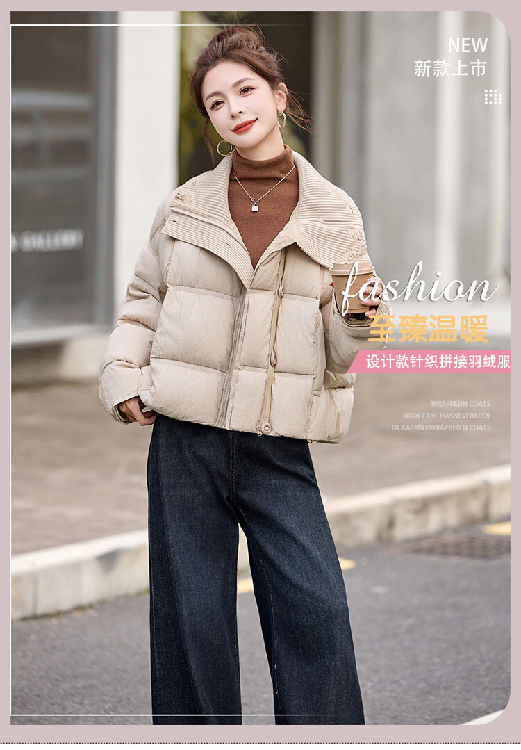 Hengyuanxiang knitted stitching large lapel short down jacket for women 2026 winter fashionable white duck down thickened warm jacket beige M