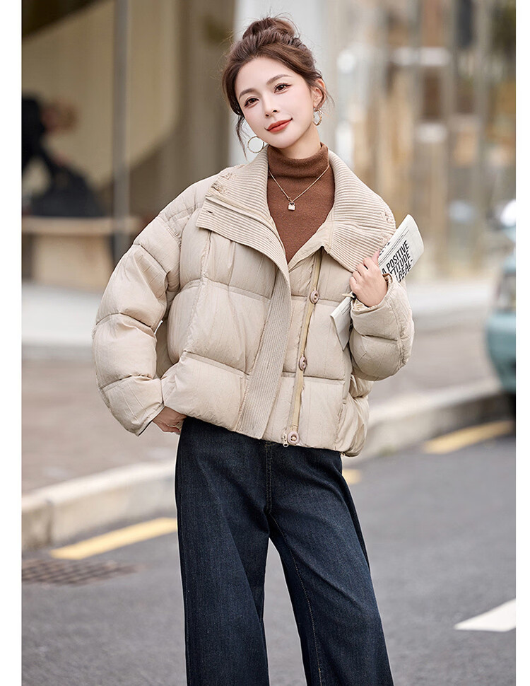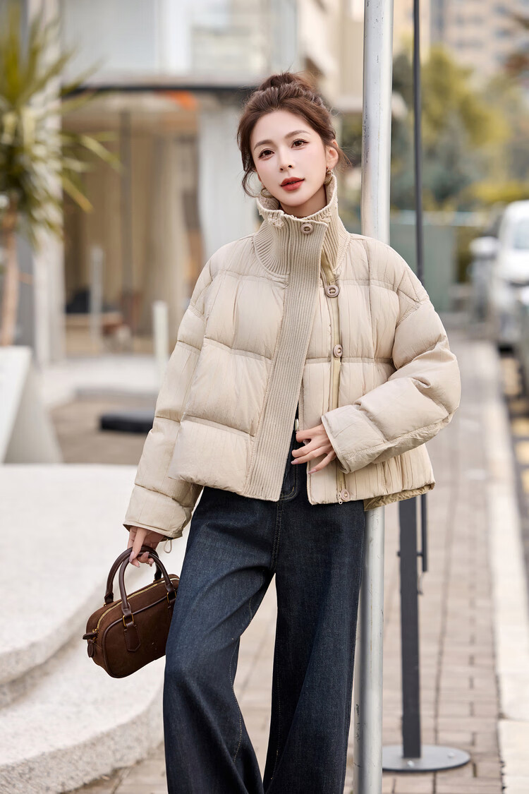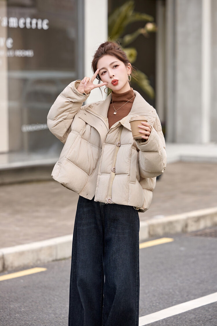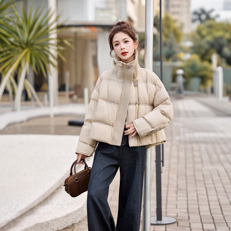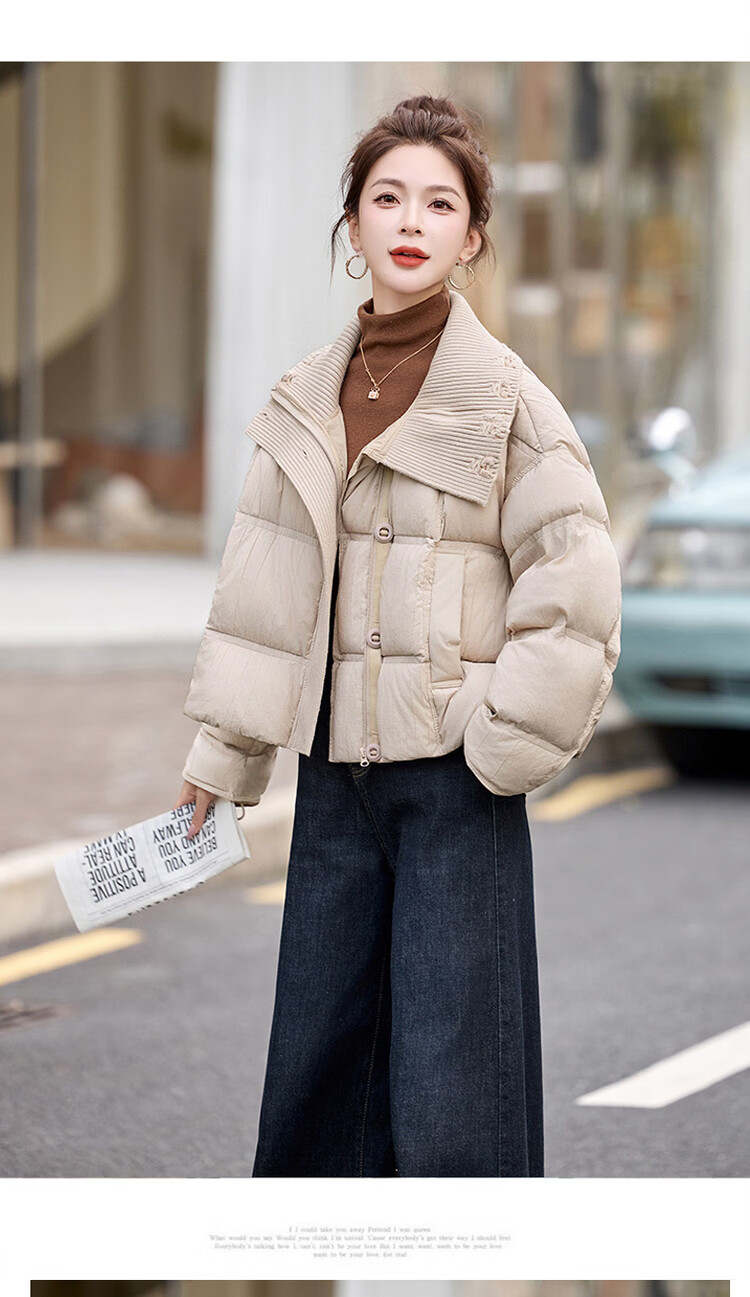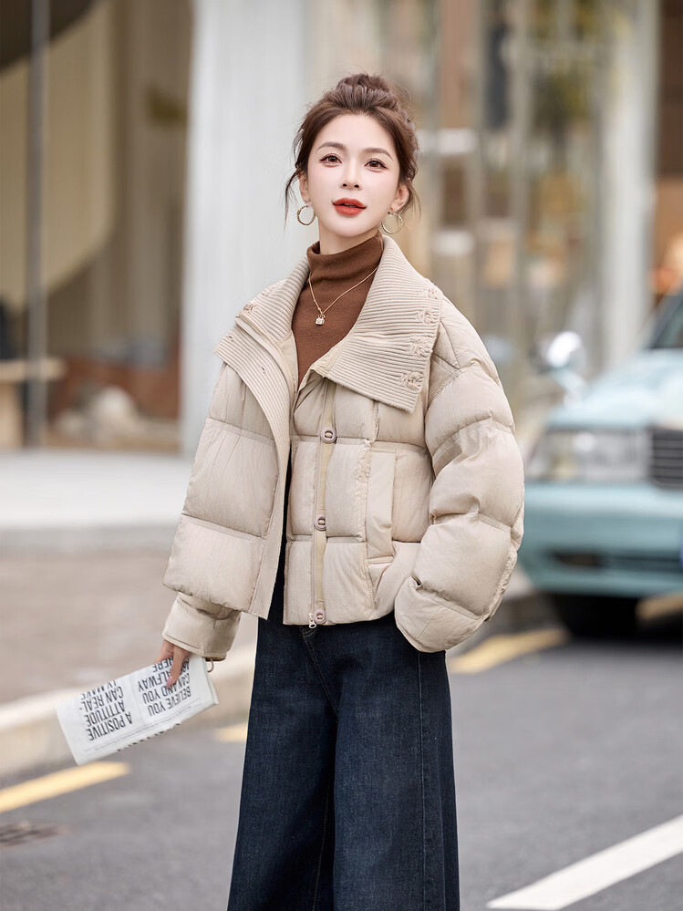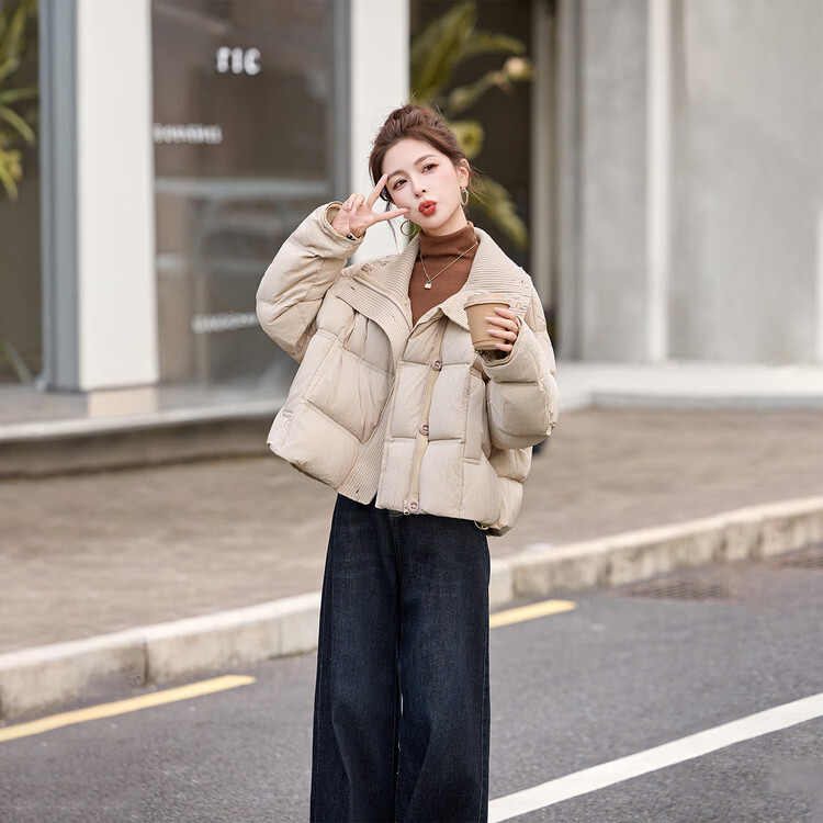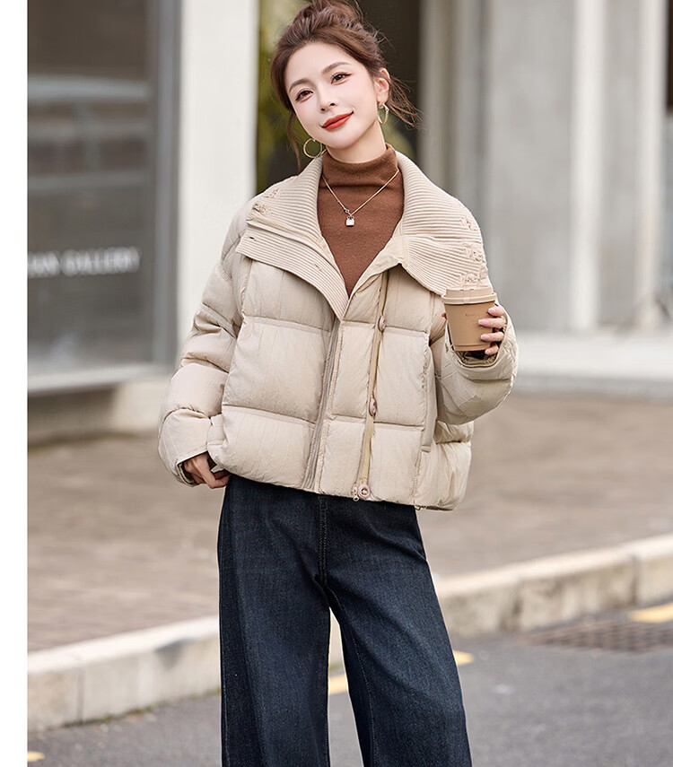 Hengyuanxiang knitted stitching large lapel short down jacket for women 2026 winter fashionable white duck down thickened warm jacket beige M