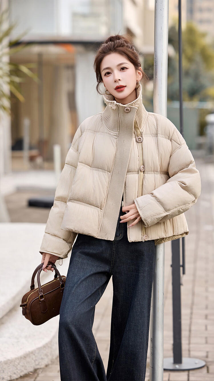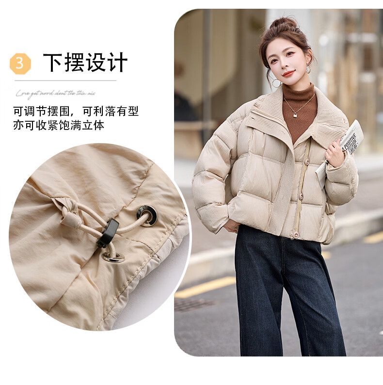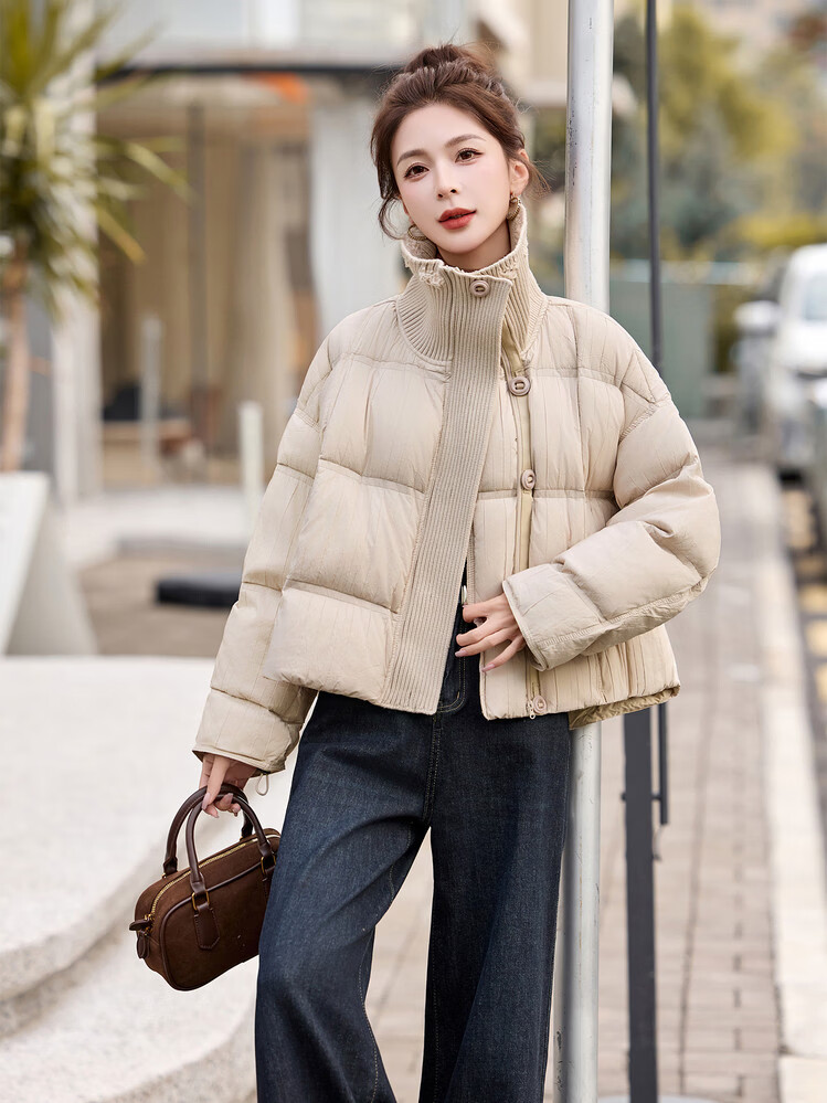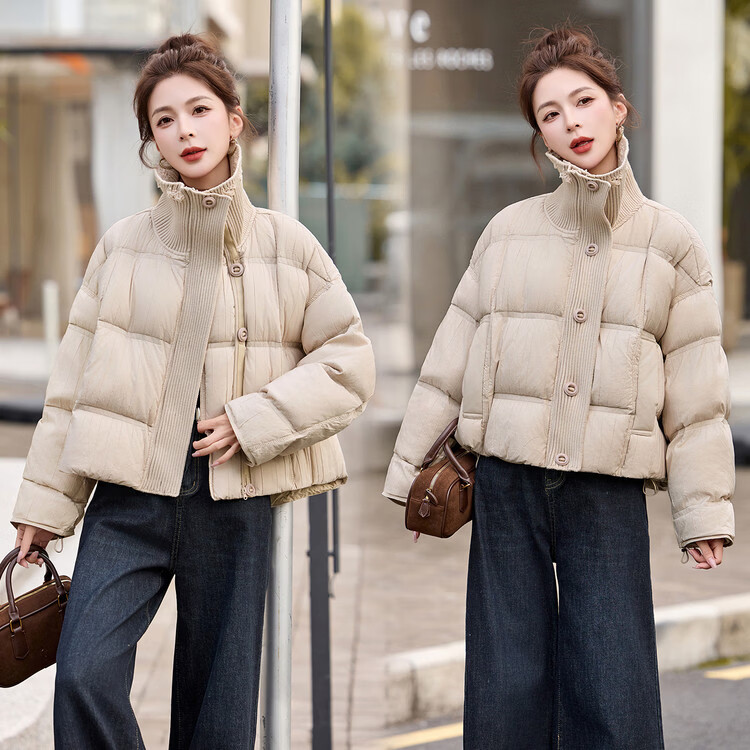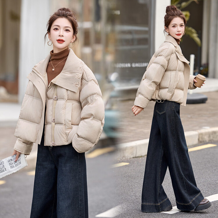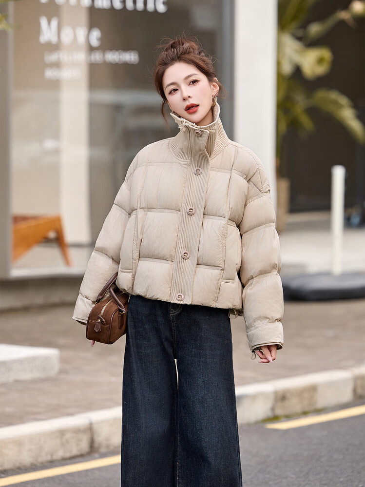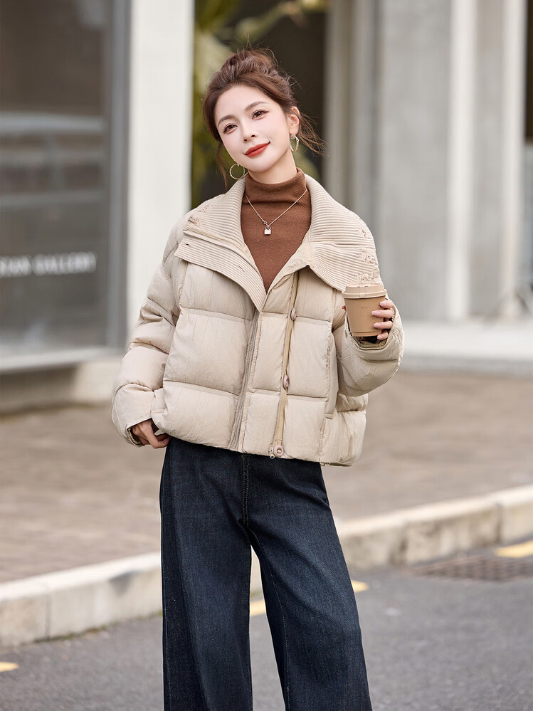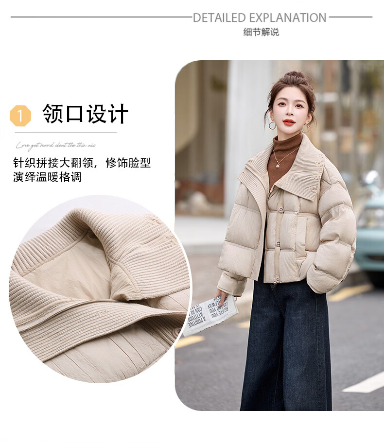 Hengyuanxiang knitted stitching large lapel short down jacket for women 2026 winter fashionable white duck down thickened warm jacket beige M